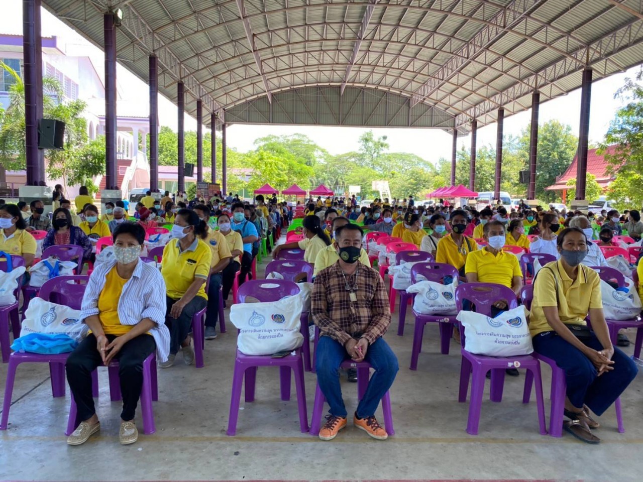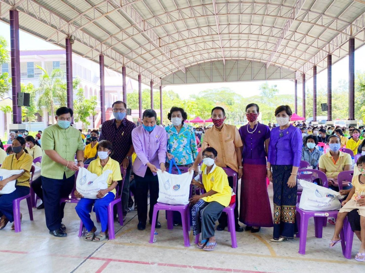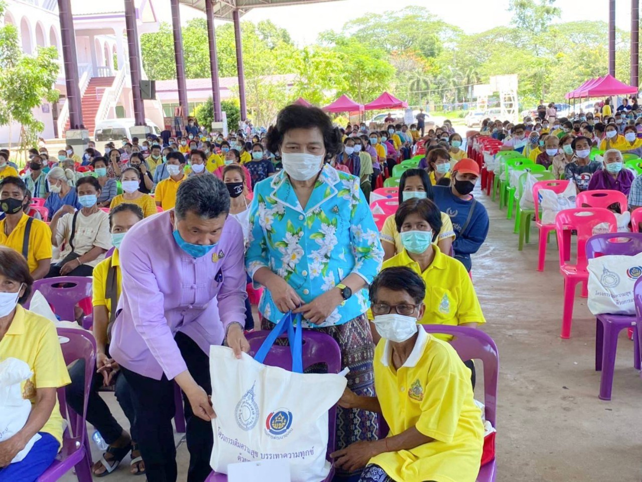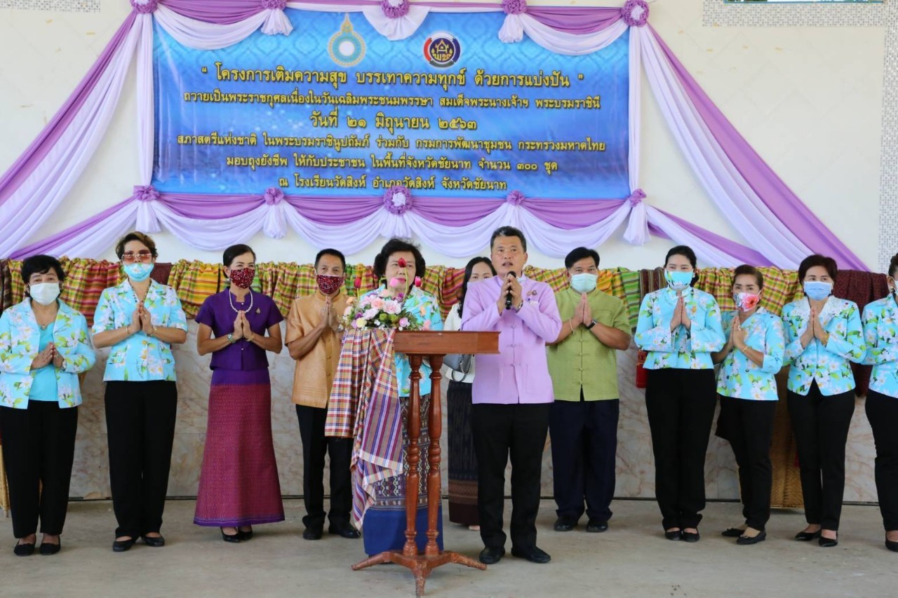 จากนั้น อธิบดีกรมการพัฒนาชุมชน ประธานสภาสตรีแห่งชาติฯ และคณะ ได้เดินทางต่อไปยัง โรงเรียนวัดสิงห์ อ.วัดสิงห์ จ.ชัยนาท เพื่อมอบถุงยังชีพจำนวน 300 ชุด ให้แก่ประชาชนชาวจังหวัดชัยนาท ที่ได้รับผลกระทบจากไวรัสโควิด-19 ตามโครงการ “เติมความสุข บรรเทาความทุกข์ ด้วยการแบ่งปัน” ถวายเป็นพระราชกุศลเนื่องในวันคล้ายวันพระราชสมภพ สมเด็จพระนางเจ้าสุทิดา พัชรสุธาพิมลลักษณ พระบรมราชินี 3 มิถุนายน 2563 โดยมี นายนที มนตริวัต รองผวจ.ชัยนาท นายวีระศักดิ์ ศรีโสภา รองผวจ.ชัยนาท นางบำเพ็ญ ศรีโสภา รองนายกเหล่ากาชาด จ.ชัยนาท นางเสริมศรี ศรีวงษ์ญาติดี รองนายก อบจ. ชัยนาท นายวัฒนา เดียวสุรินทร์ พัฒนาการจังหวัดชัยนาท นายยุทธนา แรกขึ้น นายอำเภอวัดสิงห์ นายรชต ปานสมบูรณ์ ผอ.รร. วัดสิงห์ นางนภัสกรณ์ ธูปแก้ว ประธานคณะกรรมการพัฒนาสตรี จ.ชัยนาท ผู้แทนจากภาครัฐ เอกชน ร่วมต้อนรับ