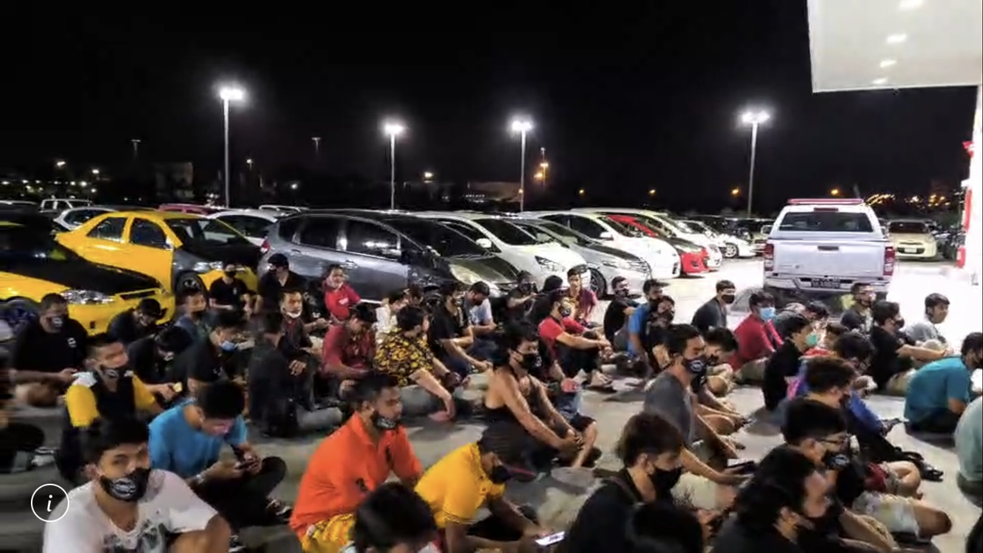 เพื่อมอบของที่ระลึกแก่สมาชิกภายในกลุ่ม ซึ่งวัยรุ่นกลุ่มดังกล่าวได้นัดหมายกันผ่านเฟสบุ๊คชื่อ “กลุ่มรถซิ่งรามอินทรา” อันเป็นการฝ่าฝืนประกาศหัวหน้าผู้รับผิดชอบในการแก้ไขสถานการณ์ฉุกเฉินในส่วนที่เกี่ยวข้องกับความมั่นคง เรื่อง ห้ามการชุมนุม การทำกิจกรรม การมั่วสุม โดยออกตามความในมาตรา 18 แห่ง พ.ร.ก.การบริหารราชการในสถานการณ์ฉุกเฉิน พ.ศ.2548 ซึ่งมีอัตราโทษจำคุกไม่เกินสองปี หรือปรับไม่เกินสี่หมื่นบาท หรือทั้งจำทั้งปรับผลการจับกุมผู้ชุมนุมจำนวน 146 คน รถทั้งสิ้น 97 คัน นอกจากนี้เจ้าหน้าที่ตำรวจยังได้ดำเนินการจัดทำประวัติบุคคลทั้งหมดไว้ และนำส่งพนักงานสอบสวนดำเนินคดีตามกฎหมายต่อไป