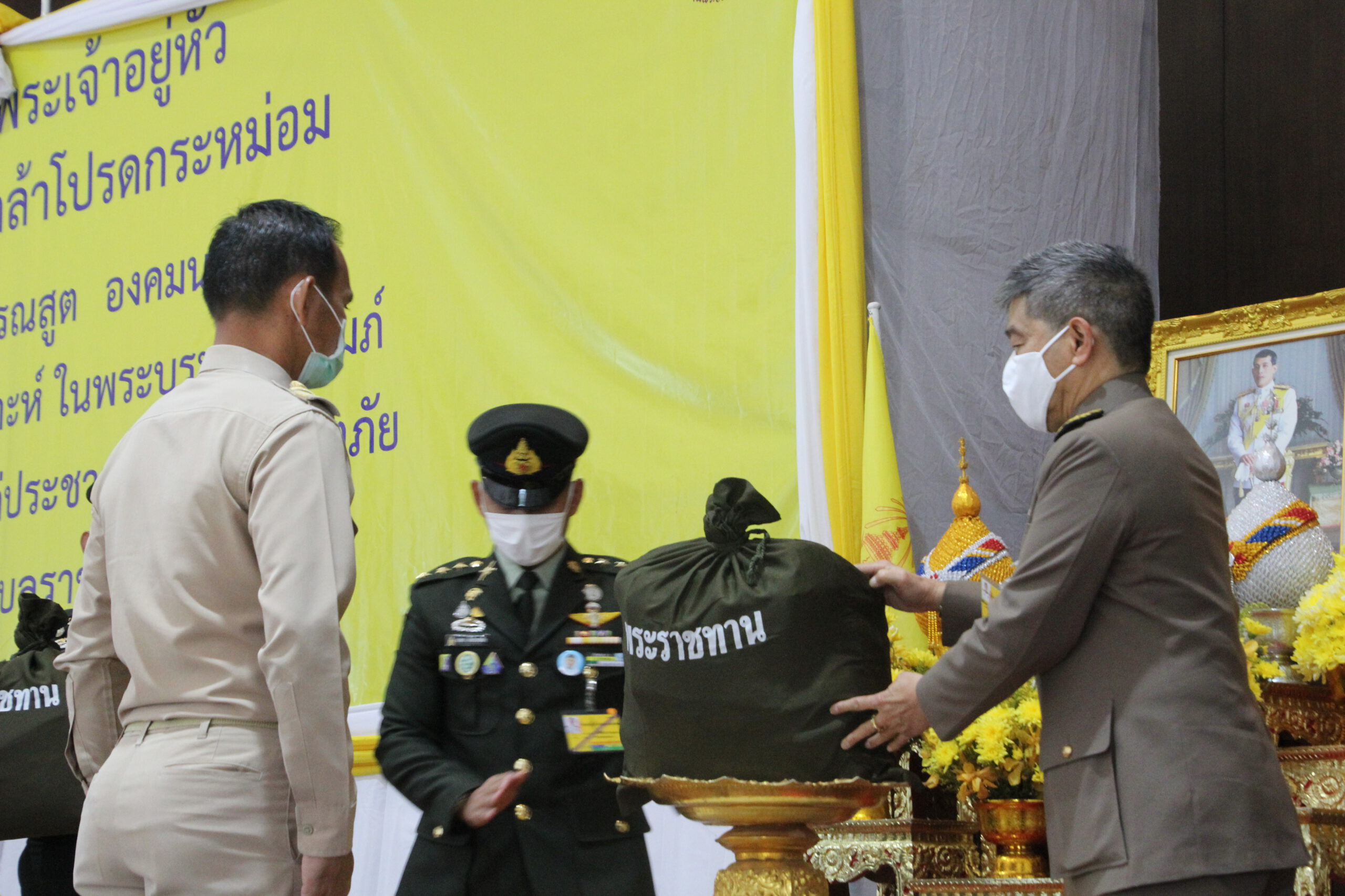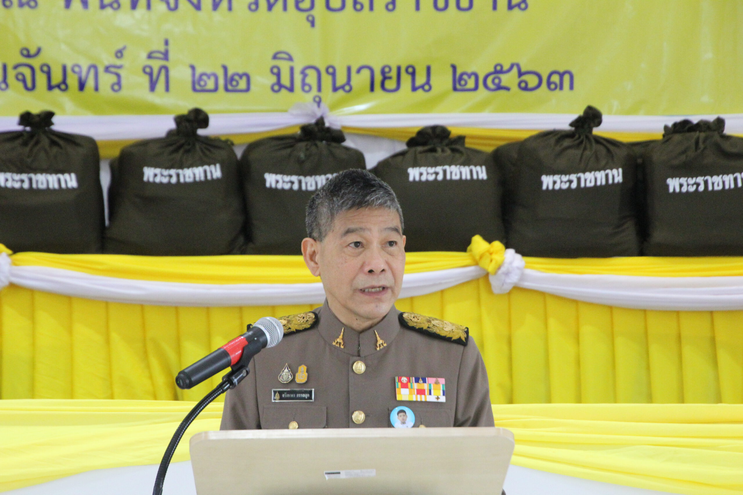จังหวัดอุบลราชธานี แบ่งการปกครองออกเป็น 25 อำเภอ 219 ตำบล 2,469 หมู่บ้าน ได้รับอิทธิพลจากหย่อมความกดอากาศต่ำแพร่ปกคลุมตั้งแต่ช่วงเดือนกุมภาพันธ์ มิถุนายน 2563 ทำให้เกิดฝนฟ้าคะนอง และลมกระโชกแรง ส่งผลทำให้บ้านเรือนราษฎร ทรัพย์สิน โรงเรือน คอกสัตว์เลี้ยง และพืชผลทางการเกษตร ในพื้นที่ 25 อำเภอ 234 ตำบล 609 หมู่บ้าน ได้รับความเสียหาย ราษฎรได้รับความเดือดร้อน 2,972 ครัวเรือน โดยได้ดำเนินการไปบางส่วนแล้ว สำหรับในวันนี้ เชิญถุงพระราชทาน เครื่องอุปโภคบริโภคจำนวน 2,252 ถุง มอบแก่ราษฎรใน 19 อำเภอ 182 ตำบล 491 หมู่บ้าน ที่ได้รับผลกระทบ