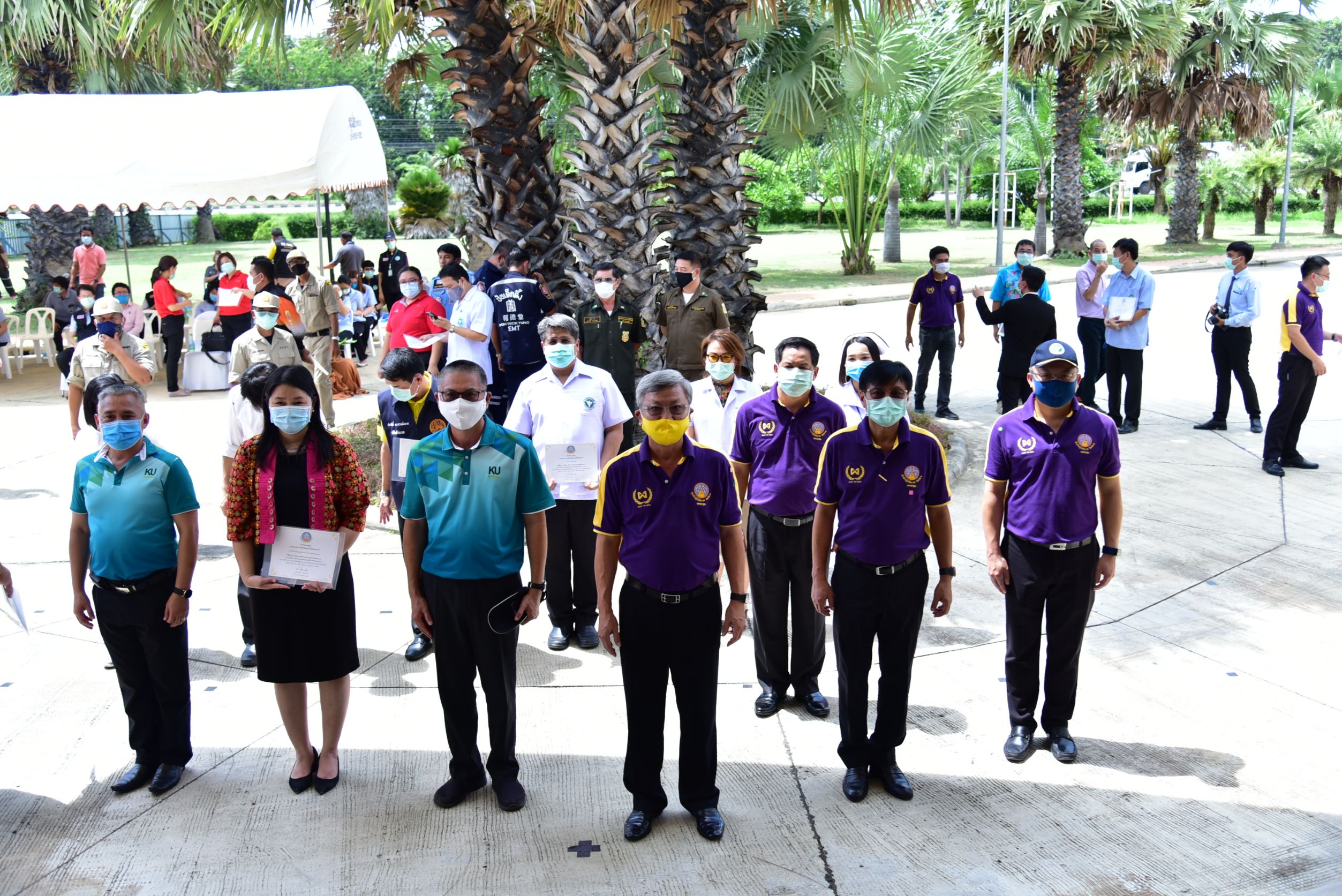 วันนี้ (23 มิ.ย.63) ที่แสนปาล์ม เทรนนิ่งโฮม มหาวิทยาลัยเกษตรศาสตร์ วิทยาเขตกำแพงแสน ซึ่งเป็นศูนย์กักตัวเพื่อสังเกตอาการจังหวัดนครปฐม แห่งที่ 2 นายชาญนะ เอี่ยมแสง ผู้ว่าราชการจังหวัดนครปฐม เป็นประธานในพิธีส่งตัวผู้สังเกตอาการคนสุดท้ายของจังหวัดนครปฐมกลับบ้าน และได้ลงนามในหนังสือรับรองยกเลิกการกักตัวให้เป็นกรณีพิเศษ จากนั้น ผู้ว่าราชการจังหวัดนครปฐมได้มอบใบประกาศเกียรติคุณ ให้กับหน่วยงานและผู้ปฏิบัติงาน ที่ร่วมกันดูแลผู้สังเกตอาการ ณ ศูนย์กักตัวเพื่อสังเกตอาการจังหวัดนครปฐม ทั้ง 4 แห่ง พร้อมกล่าวขอบคุณทุกคนที่ทุ่มเท เสียสละ อดทน ต่อสถานการณ์ความกดดันในการปฏิบัติหน้าที่ที่มีความเสี่ยง