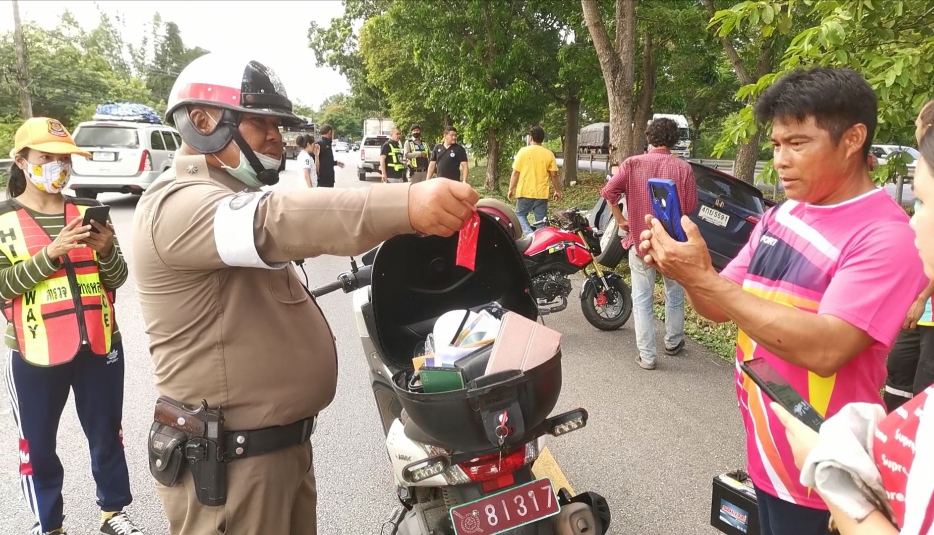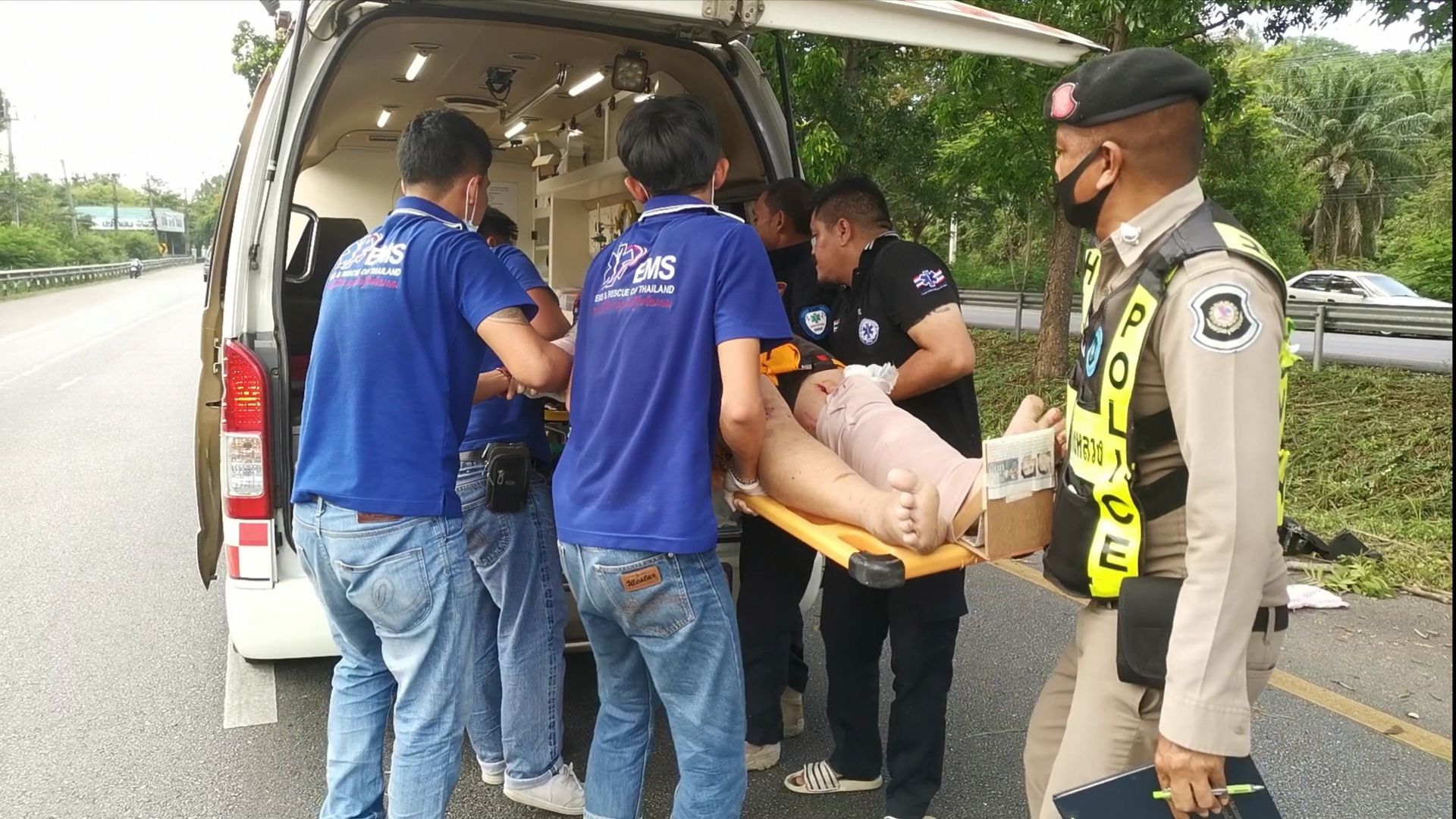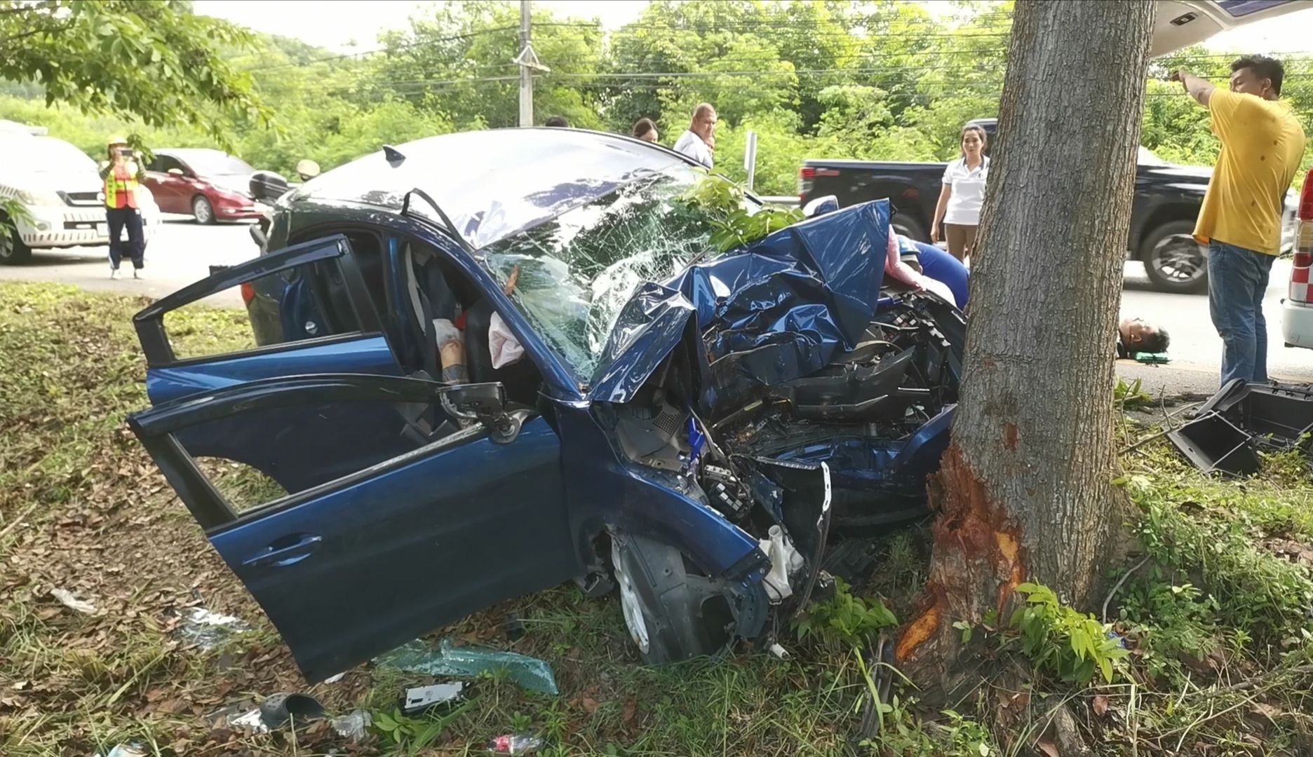 พบรถยนต์เก๋ง Honda CRV สีฟ้า หมายเลขทะเบียน 4 กย 5591 กทม.ด้านหน้าชนอัดติดกับต้นไม้ขนาดใหญ่บริเวณล่องกลางถนน ตัวรถบริเวณห้องเครื่อง และในเก๋งพังเสียหายยับเยิน มีผู้ติดภายใน 2 ราย เจ้าหน้าที่เร่งช่วยเหลือนำตัวออกมาจากซากรถ และมาปฐมพยาบาลเบื้องต้น ทราบชื่อคนขับคือ นายณัฐวุฒิ 32 ปี และผู้หญิง ไม่ทราบชื่อ อายุประมาณ 55 ปี โดยทั้ง 2 คนได้รับบาดเจ็บสาหัสตามร่างกายหลายแห่ง แขน ขาหัก นอกจากนี้ที่บริเวณ ด้านหลังคนขับยังมีผู้เสียชีวิตอีก 1 ราย ทราบชื่อ นายเอกวุฒิ 35 ปี นอนเสียชีวิตบริเวณเบาะหลังคนขับใบหน้ามีเลือดไหลออกทางจมูก ปาก คาดได้รับแรงกระแทกอย่างแรง เจ้าหน้าที่จึงเร่งลำเลียงผู้บาดเจ็บ และเสียชีวิต ส่งยัง รพ.บางสะพานอย่างเร่งด่วน