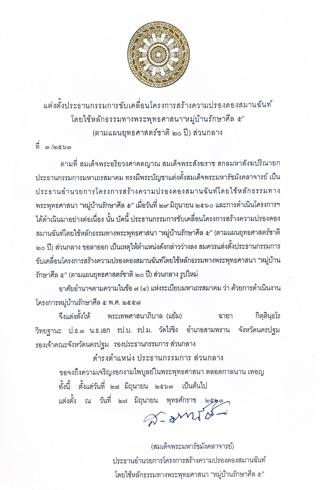 ตามที่ สมเด็จพระอริยวงศาคตญาณ สมเด็จพระสังฆราช สกลมหาสังฆปริณายก ประธานกรรมการมหาเถรสมาคม ทรงมีพระบัญชาแต่งตั้ง สมเด็จพระมหารัชมังคลา จารย์ เป็นประธานอำนวยการโครงการสร้างความปรองดองสมานฉันท์โดยใช้หลักธรรมทางพระพุทธศาสนา “หมู่บ้านรักษาศีล5” เมื่อวันที่ 29มิถุนายน 2560 และการดำเนินโครงการฯได้ดำเนินมาอย่างต่อเนื่อง นั้น บัดนี้ ประธานกรรมการขับเคลื่อนโครงการสร้างความปรองดองสมานฉันท์โดยใช้หลักธรรมทางพระพุทธศาสนา “หมู่บ้านรักษาศีล 5″ (ตามแผนยุทธศาสตร์ชาติ20ปี) ส่วนกลาง ขอลาออก เป็นเหตุให้ตำแหน่งดังกล่าวว่างลง สมควรแต่งตั้งประธานกรรมการขับเคลื่อนโครงการสร้างความปรองดองสมานฉันท์โดยใช้หลักธรรมทางพระพุทธศาสนา”หมู่บ้านรักษาศีล 5” (ตามแผนยุทธศาสตร์ชาติ20ปี) ส่วนกลาง รูปใหม่ อาศัยอำนาจตามความในข้อ 7 (4) แห่งระเบียบมหาเถรสมาคม ว่า ด้วยการดำเนินงานโครงการหมู่บ้านรักษาศีล 5 พ.ศ. 2557
