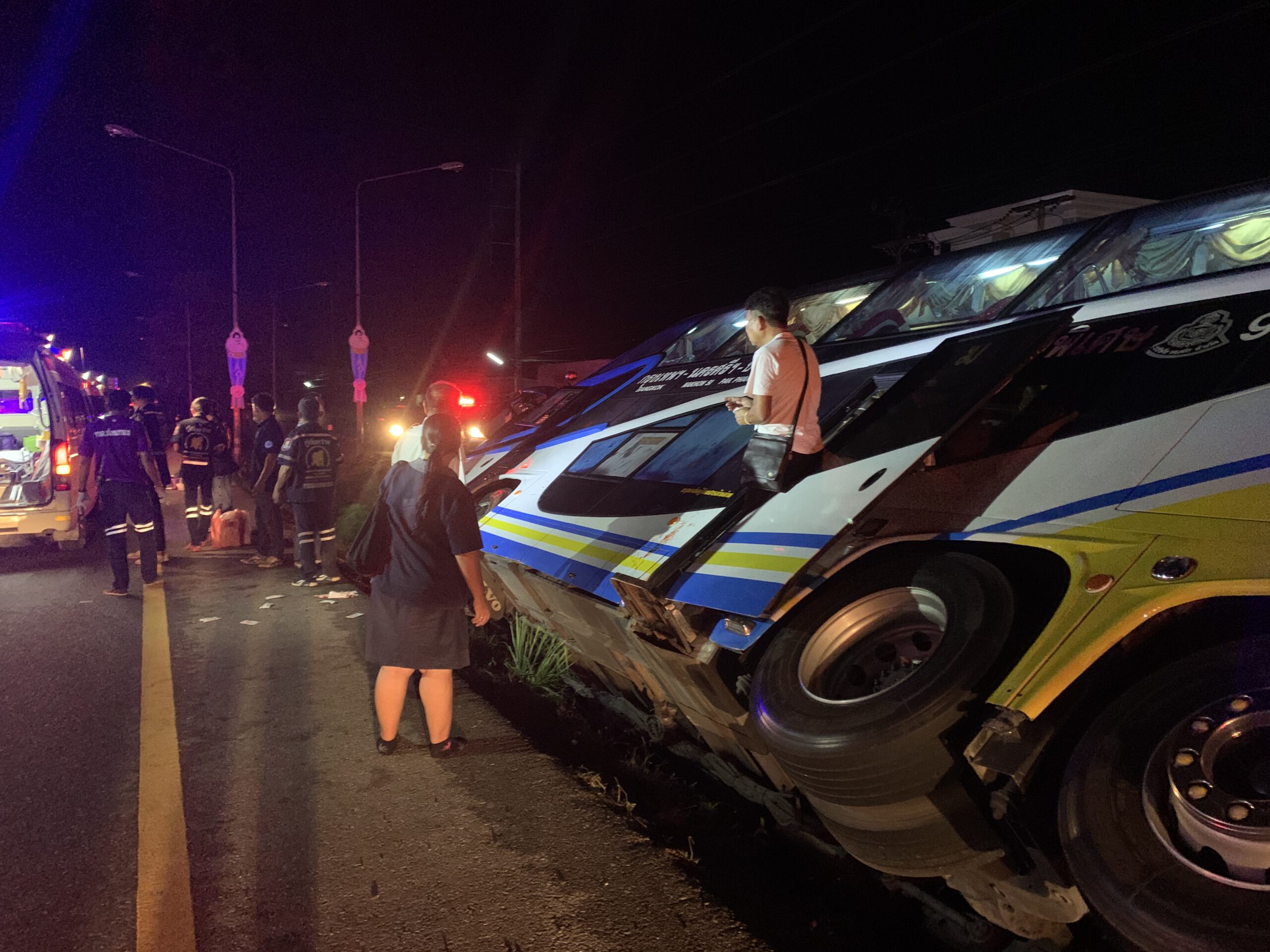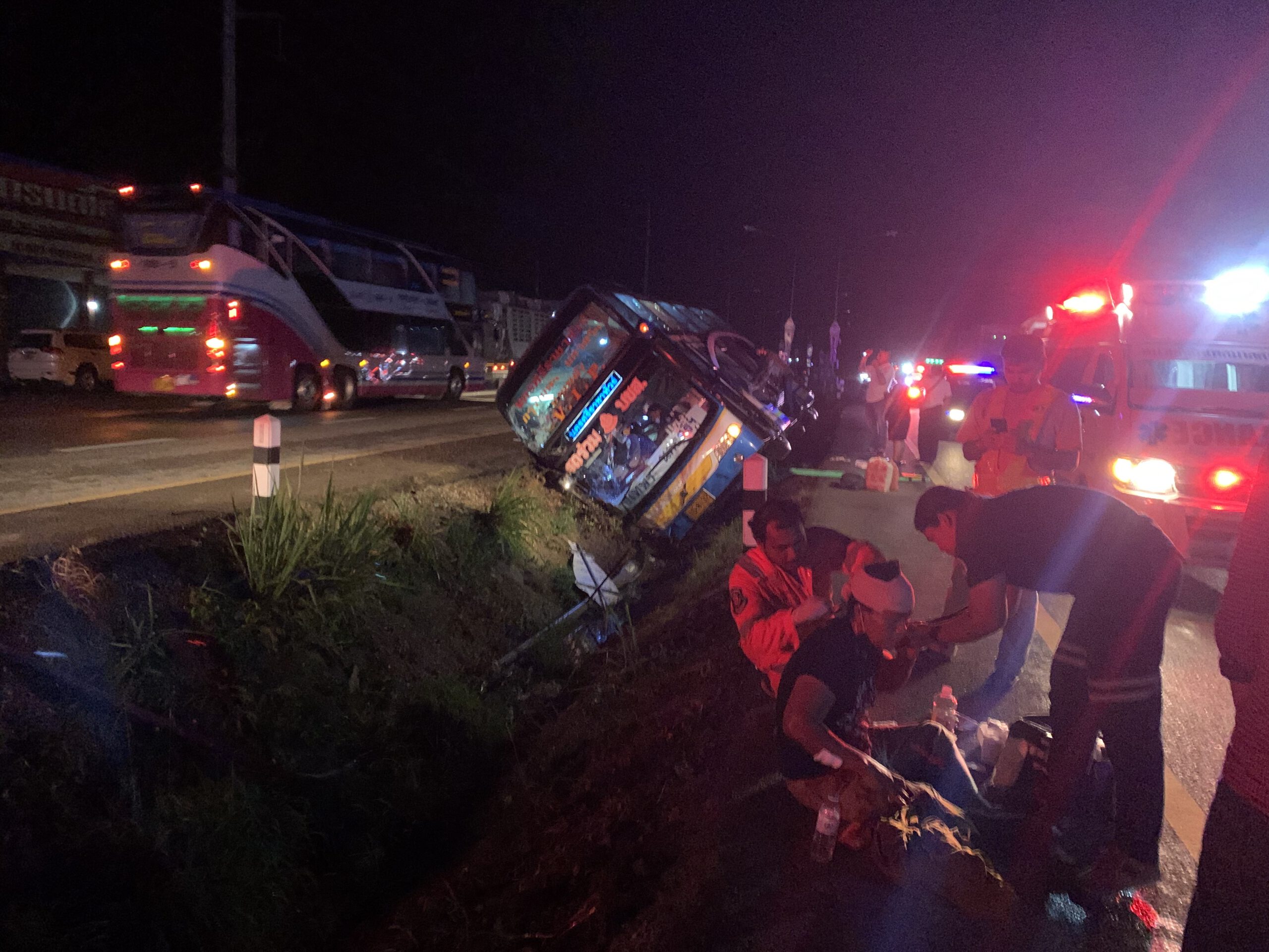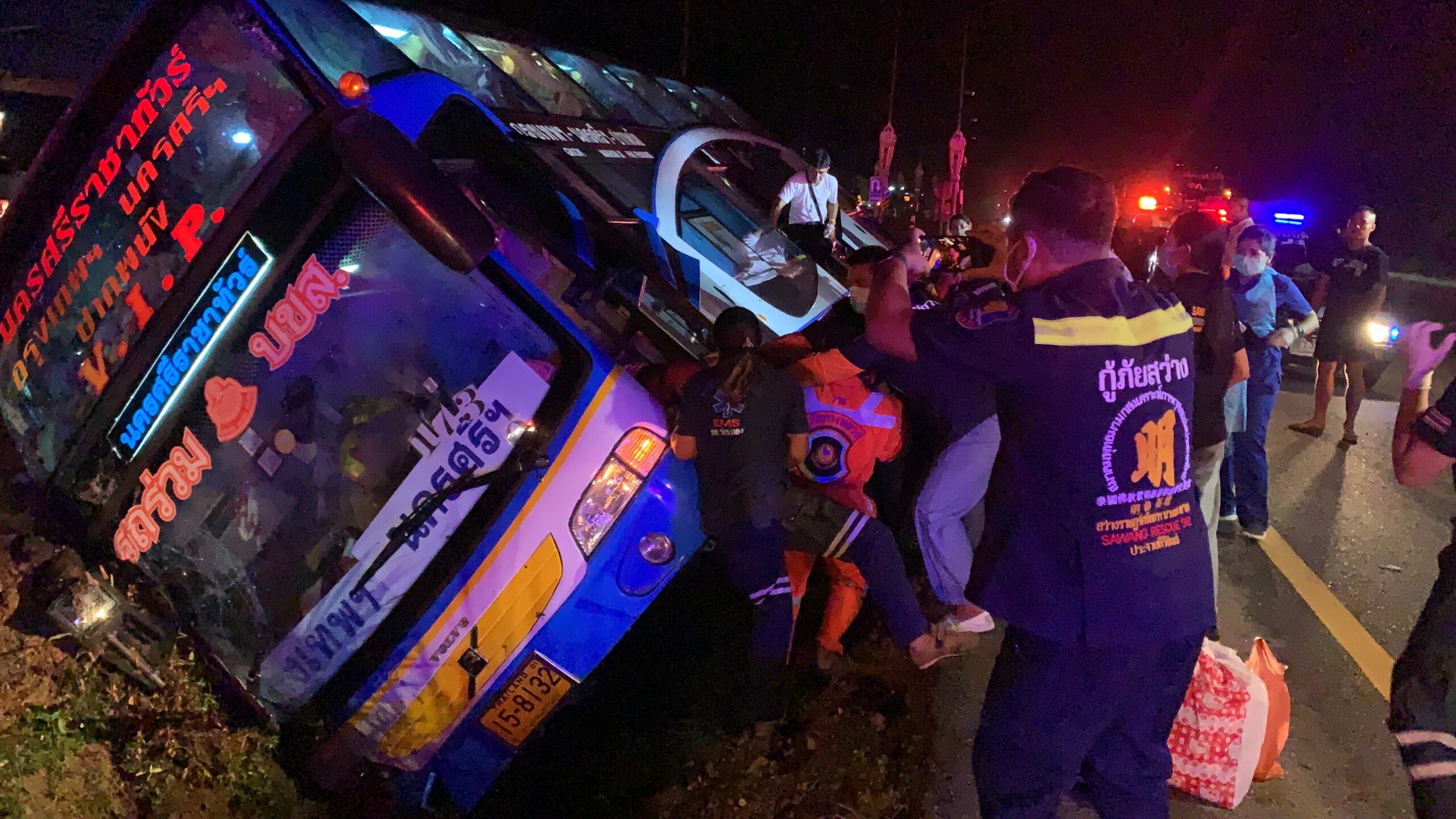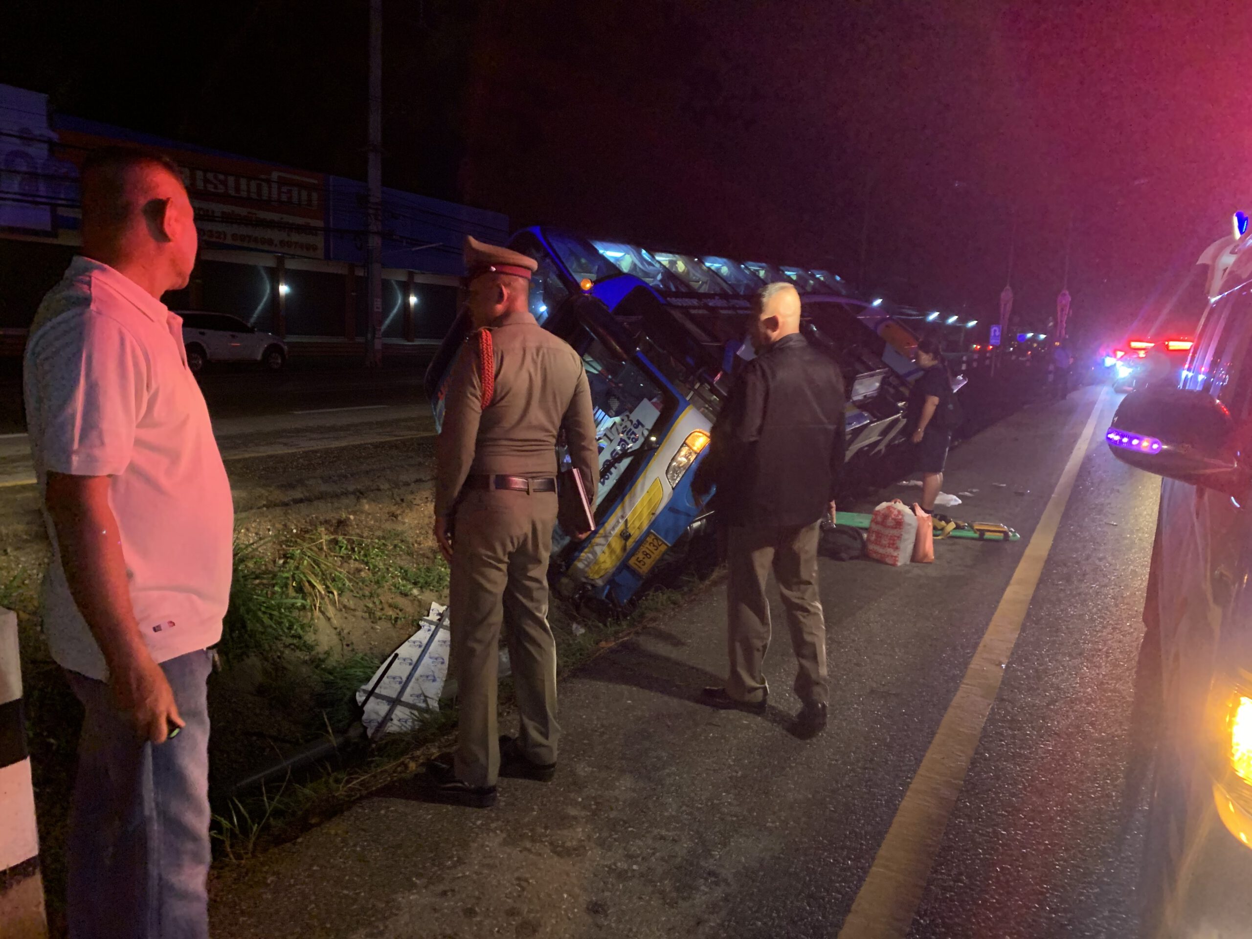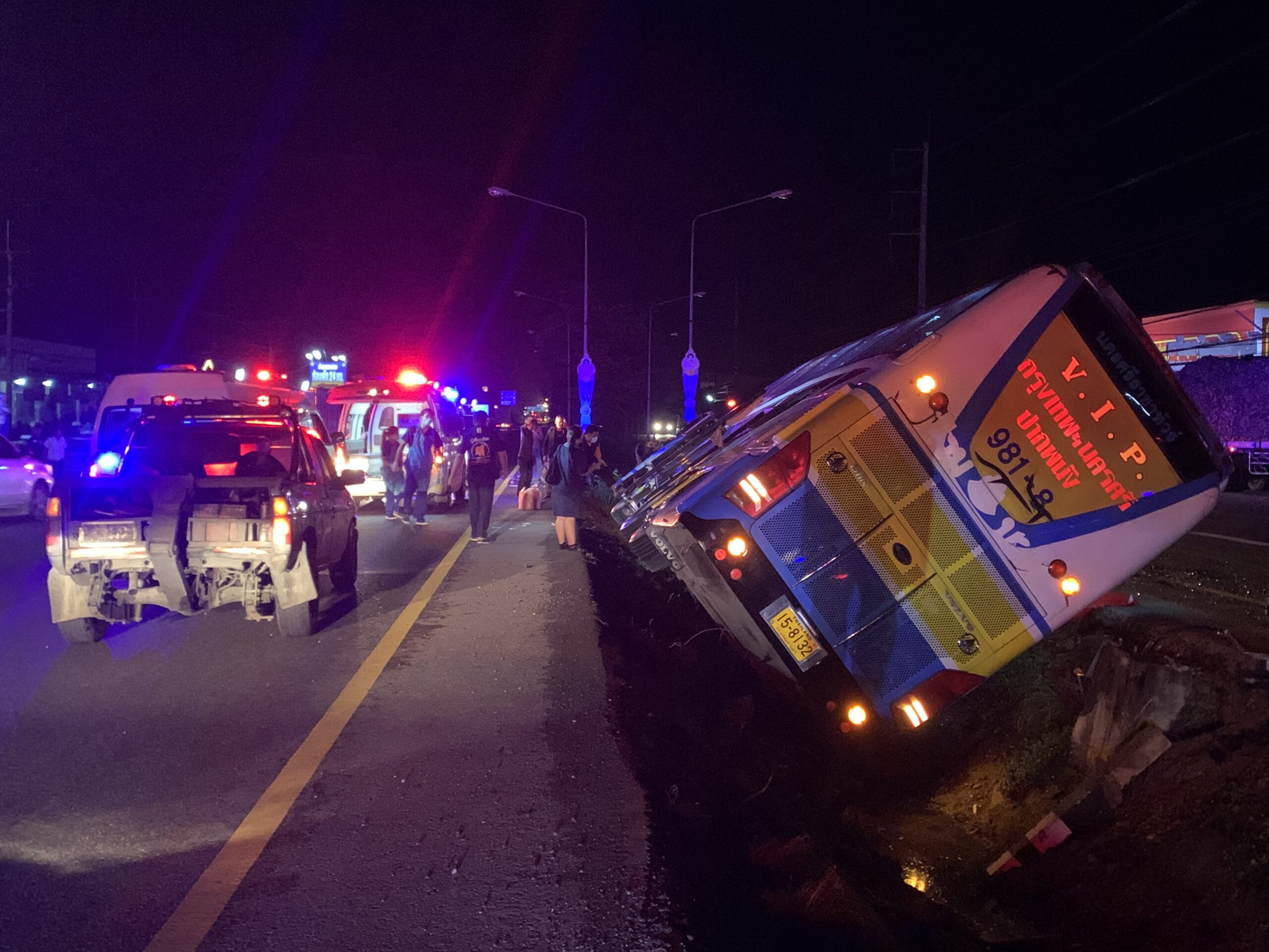 รถทัวร์ กรุงเทพฯ-นครศรีฯ เสียหลักตกร่องกลางถนน ผู้โดยสาร 30 ชีวิตระทึก เจ็บ 5 ราย คาดหลับใน