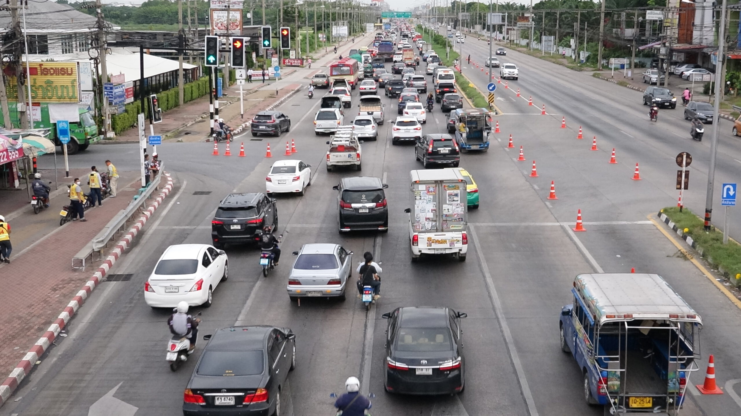 ซึ่งจากการสอบถาม พ.ต.ต.ศักดิ์สิทธิ์ ไข่แก้ว หัวหน้างานจราจรสภ.โพธิ์แก้ว ได้กล่าวว่า ตั้งแต่วันที่1กรกฎาคมโรงเรียนเปิดวันแรก ก็ได้มีการทอดลองปิดทางแยก ไฟเขียวแดง ซอยหมอศรี- ซอยวัดเทียนดัด และแยกไฟเขียวแดงซอยโรมัน ตามมติที่ประชุมของคณะกรรมการร่วม ทั้งฝ่ายปกครอง ตำรวจ กรมทางหลวง และภาคประชาชน ได้มีความเห็นสมควรทดลองปิดแยกดังกล่าว ในแรกรถค่อนข้างจะมีปัญหาติดเยอะท้ายแถวขาเข้านครปฐมอยู่ที่เขตติดต่ออำเภอกระทุ่มแบน ในส่วนขาเข้ากรุงเทพฯท้ายแถวอยู่ปากทางเข้าวัดไร่ขิง ในช่วงเช้า และทางจราจรสภ.โพธิ์แก้วก็คิดรูปแบบการจราจร ที่ได้รับเสียงสะท้อนจากผู้ใช้เส้นทาง ก็ได้เอาไปปรับแก้ เมื่อวานเย็นก็ได้ทดลองใช้รูปแบบใหม่ โดยไม่ปิดทางแยกแต่ให้รถจะออกจากซอยให้เลี้ยวซ้ายอย่างเดียว ในส่วนการกดไฟก็จะลดจำนวนเฟสลงไป เหลือแค่ทางตรงกับทางเลี้ยว ทำให้สามารถกดได้เร็วขึ้นเร่งระบายรถได้ดี สอดคล้องกับสัญญาณไฟแยกซอยโรมัน ทำให้รถไม่ติดค้าง วิ่งโฟรได้ตลอดมีติดค้างบ้างเล็กน้อย ทำให้ดีกว่ารูปแบบแรกมาก ซึ่งหลังจากวันหยุดยาวนี้ก็จะจัดรูปแบบใหม่ที่ทดลองใช้นี้อีกครั้ง โดยทางคณะทำงานผู้ช่วย สส.ได้กล่าวว่า ท่านสส.เผดิมชัย ติดภารกิจที่สภาผู้แทนฯ จึงได้มอบให้มาตรวจสอบดูการปรับเปลี่ยนทดลองการจารจร พื้นที่นี้ และก็จะได้นำเรื่องรายงานผลให้ทางส.ส.เผดิมชัย สะสมทรัพย์ สมาชิกสภาผู้แทนราษฎร เขต5นครปฐม ทราบต่อไป