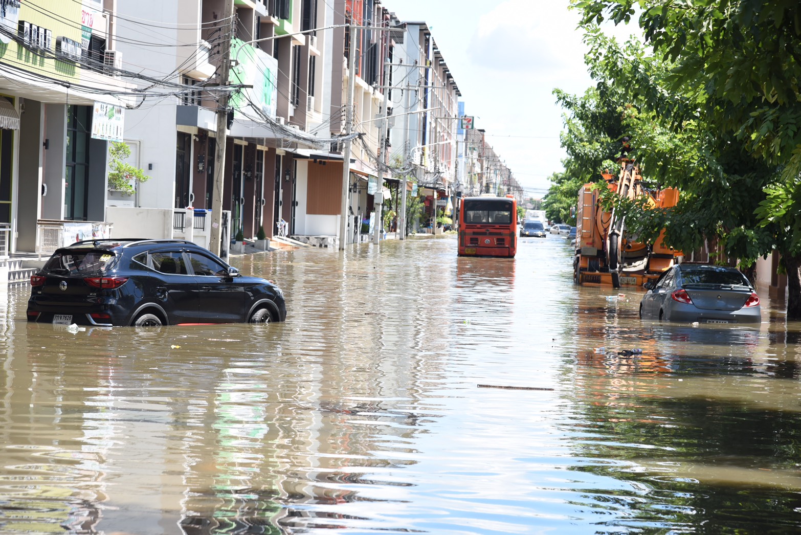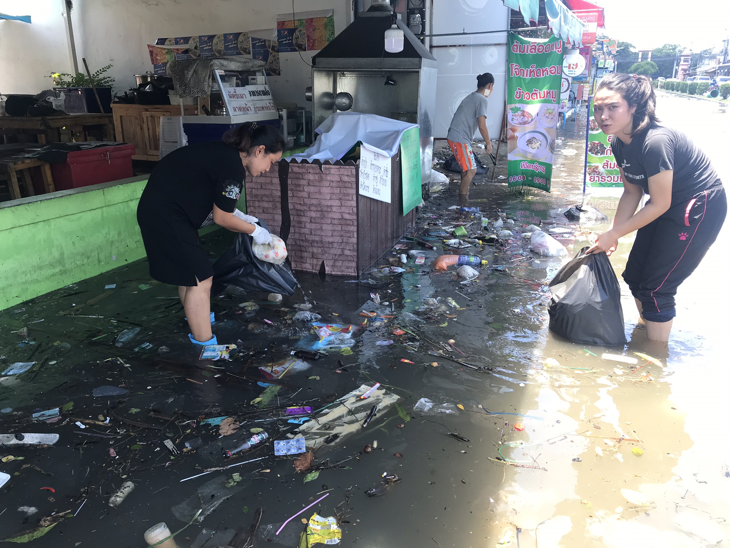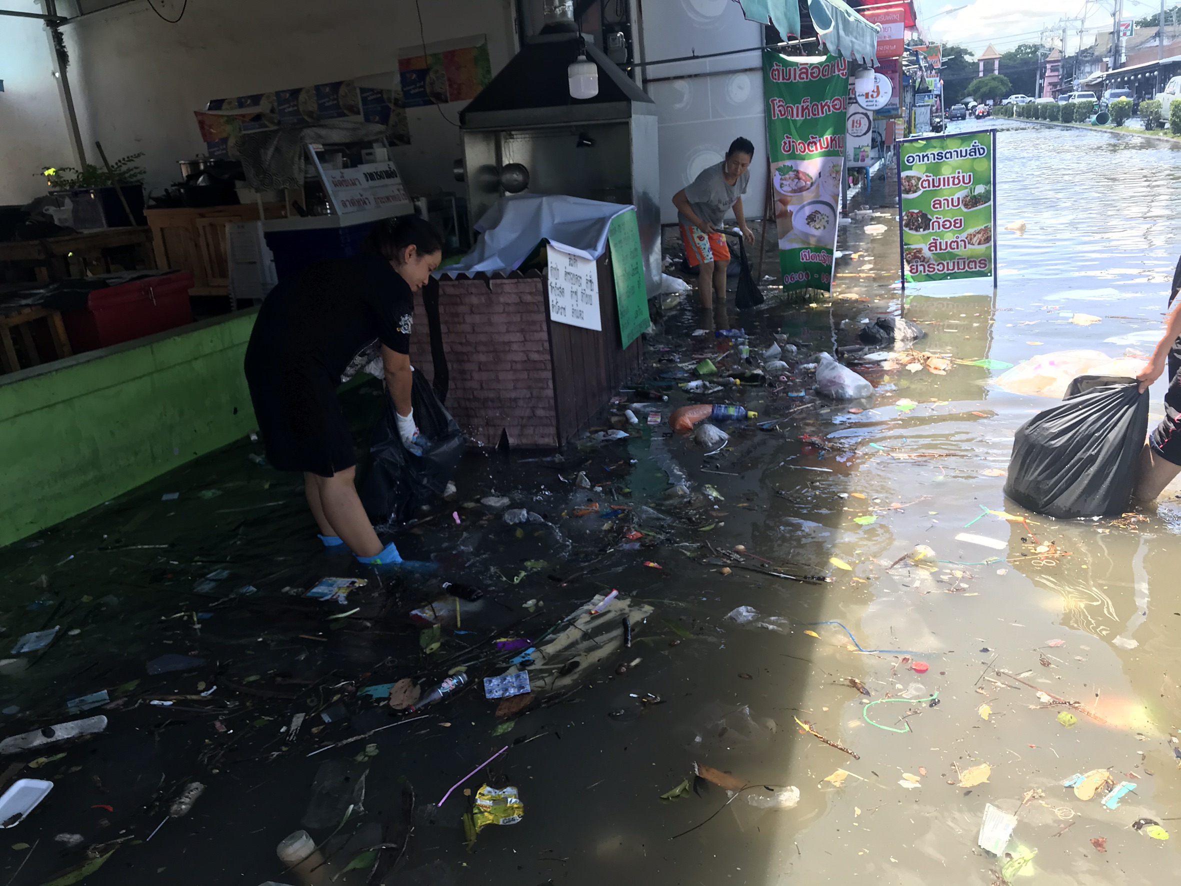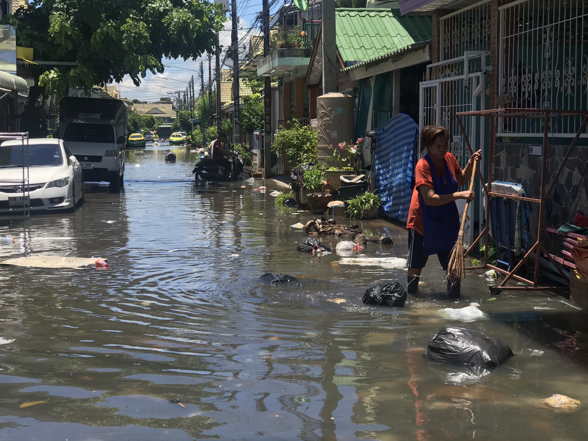ด้าน ดร.วีระศักดิ์ ฮาดดา นายก อบต.คลองสาม กล่าวเปิดเผยว่า หลังจากที่มีฝนตกอย่างหนัก ได้ลงสำรวจพื้นที่ตั้งแต่เมื่อคืน พบว่าภายในหมู่บ้านน้ำท่วมสูงทำให้ชาวบ้านได้รับความเดือดร้อน และพบว่าขยะลอยเกลื่อน ซึ่งคาดว่าเกิดจากปัญหาขยะถุงพลาสติกไปอุดตันท่อระบายน้ำจึงทำให้การระบายน้ำเป็นไปได้ไม่สะดวก ซึ่งจะได้ประสานเจ้าหน้าที่กรมชลประทานเพื่อให้เร่งเปิดประตูระบายน้ำและเร่งสูบน้ำระบายออกคลองรังสิตประยูรศักดิ์เพื่อลดระดับน้ำในคลองสาม ขณะที่หมู่บ้านสถาพร ต.บึงยี่โถ อ.ธัญบุรี จ.ปทุมธานี ก็เป็นอีก 1 หมู่บ้านซึ่งในตอนนี้ 11.50 น. ยังคงมีน้ำท่วมขังสูงถึง 60 ซม. โดนในตอนนี้มีทางเทศบาลเมืองบึงยี่โถ ได้ส่งเจ้าหน้าที่กองช่าง เข้าไปช่วยเหลือประชาชนในหมู่บ้านแล้วตั้งแต่เมื่อคืน แต่ก็ยังไม่สามารถดึงน้ำออกจากหมู่บ้านได้หมด เนื่องจากปัญหาขยะอุกตันท่อระบายน้ำ และเครื่องสูบน้ำที่บ่อบำบัดเสีย