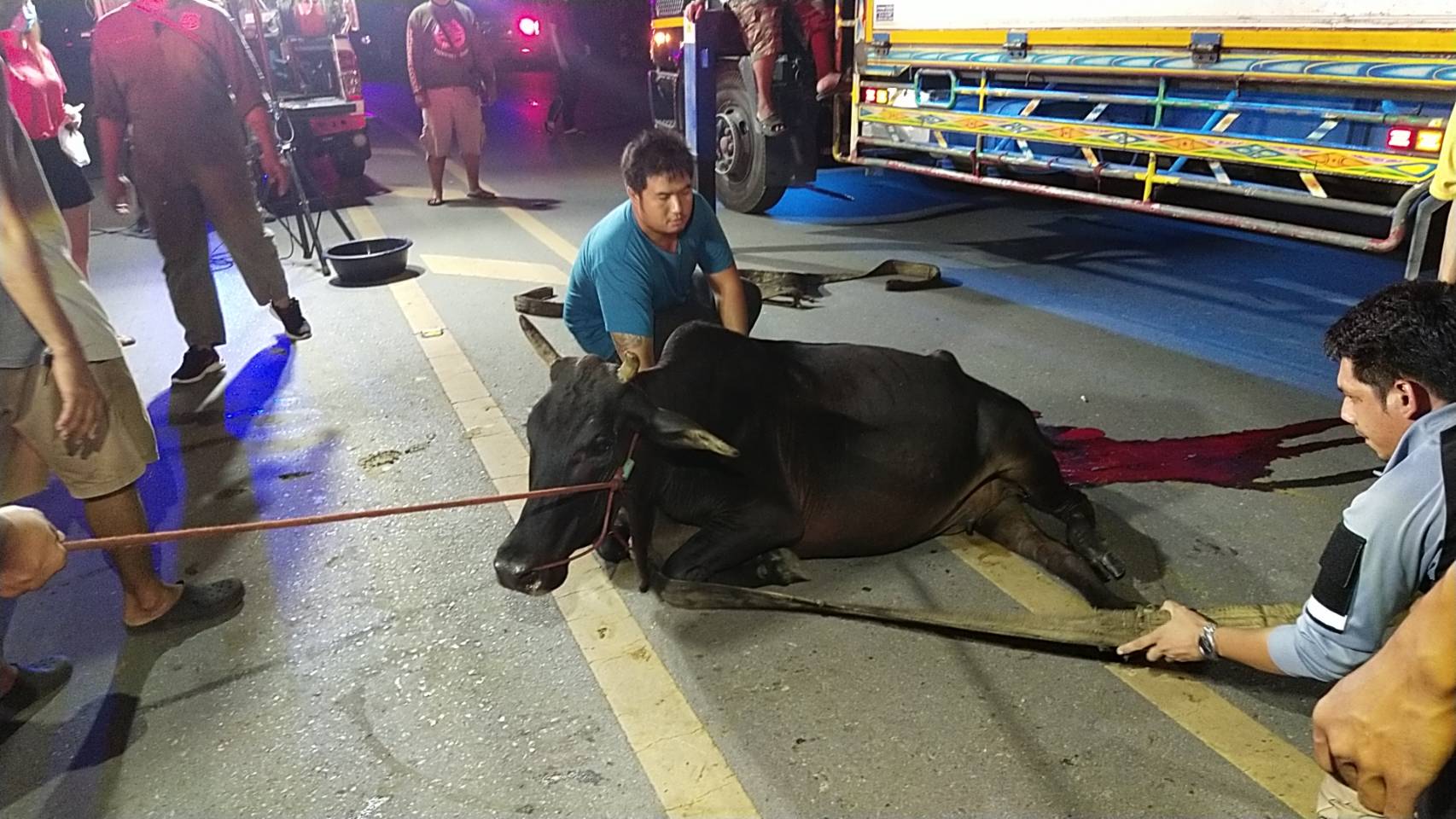 ด้านนายบุญส่ง แตงเอี่ยม เจ้าของวัวบอกว่า ตนเองมีวัว 2 ตัว คือ วัวแม่ลูกคู่นี้ โดยผูกไว้ในคอกด้วยกัน แต่คาดว่าเชือกคงจะหลุด หรือแม่วัวกระชากจนขาด จากนั้นก็พากันเดินออกมาจนมาถึงถนนใหญ่จึงทำให้ถูกรถชน