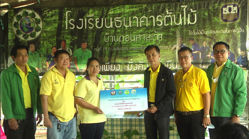 ซึ่ง ธ.ก.ส. เป็น ‘ธนาคารแรก’ ที่เกษตรกรสามารถใช้ไม้ยืนต้นที่มีค่ามาเป็นหลักทรัพย์ค้ำประกันการกู้เงิน ตาม พ.ร.บ.หลักประกันทางธุรกิจฯ” ธ.ก.ส. ได้นำร่องให้สินเชื่อแก่เกษตรกรที่มีการนำไม้ยืนต้นที่มีค่าที่ปลูกในบริเวณบ้านจำนวน 44 ต้น ประกอบด้วย มะขาม (9 ต้น) มะกอกป่า (1 ต้น) สะเดา (14 ต้น) ตะโก (1 ต้น) โมกมัน (1 ต้น) งิ้วป่า (1 ต้น) กระท้อน (1 ต้น) มะเกลือ (2 ต้น) ยอป่า (1 ต้น) มะม่วง (1 ต้น) และ ไม้แดง (12 ต้น) มาเป็นหลักทรัพย์ค้ำประกันการกู้เงินวงเงินสินเชื่อจำนวน 115,000 บาท ในพื้นที่ของชุมชนบ้านดอนศาลเจ้า หมู่ 13 ต.บ่อสุพรรณ อ.สองพี่น้อง จ.สุพรรณบุรี