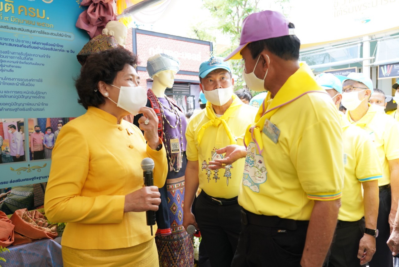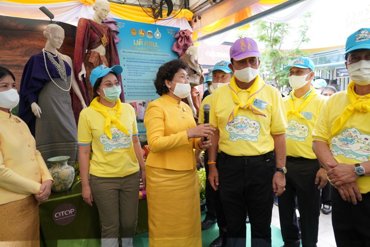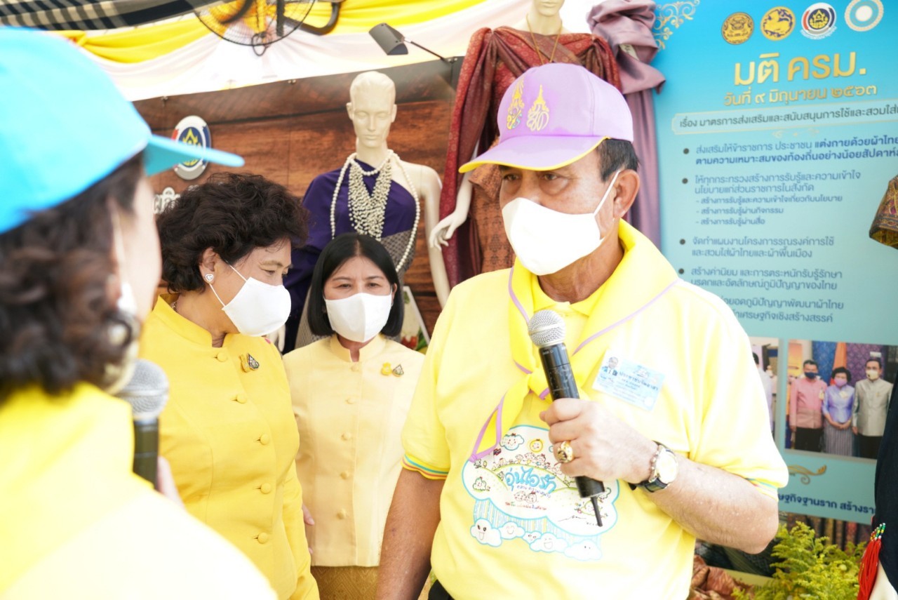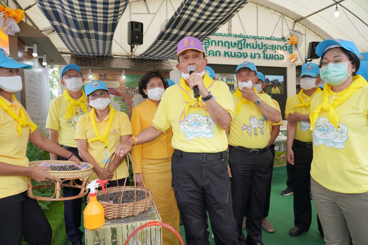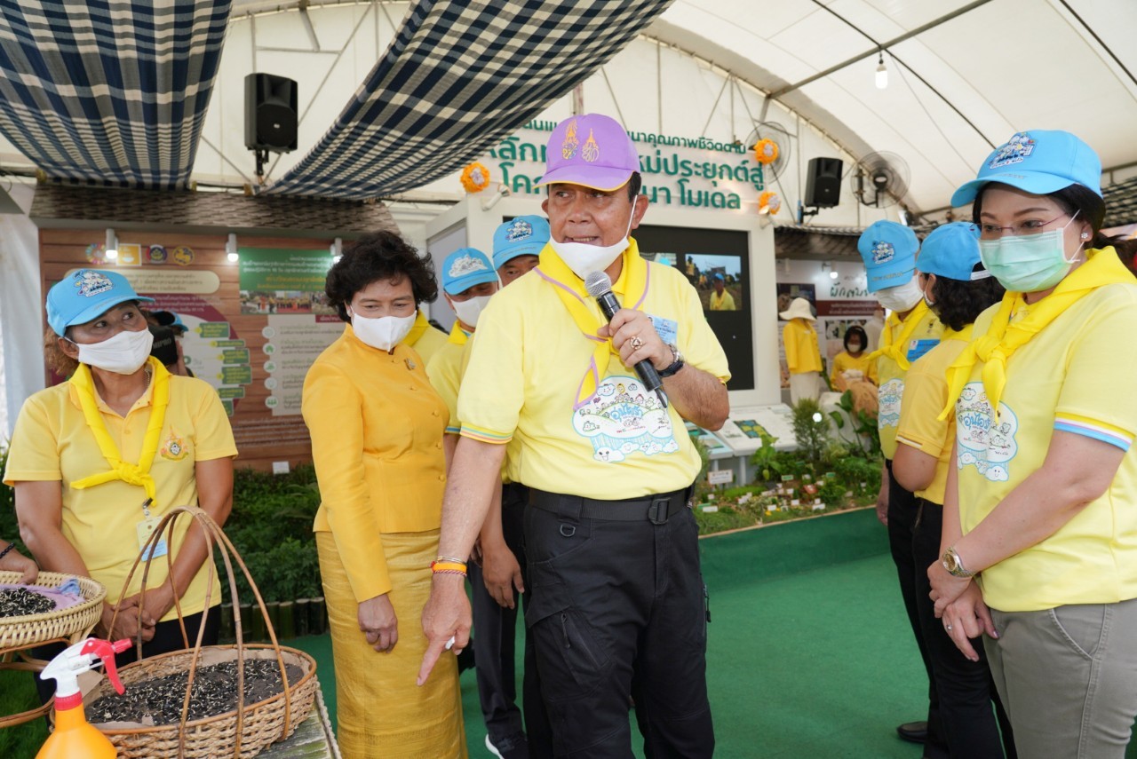นอกจากนี้ นายกรัฐมนตรียังได้เยี่ยมชมการแสดงนิทรรศการการนำเอาหลักทฤษฎีใหม่ของพระบาทสมเด็จพระเจ้าอยู่หัวรัชกาลที่ 9 ประยุกต์สู่ โคก หนอง นา โดยได้พูดคุยกับจิตอาสาที่ได้มาร่วมทำความดีด้วยหัวใจด้วยการเอามื้อสามัคคีที่ศูนย์ศึกษาและพัฒนาชุมชนจังหวัดลำปาง อุบลราชธานี นครนายก และนครศรีธรรมราช ผ่านระบบ Microsoft zoom ให้สามารถปรับปรุงพื้นที่ทำกินของประชาชนให้สามารถ จากเก็บน้ำไว้ใช้ในพื้นที่ของตนเองได้ พร้อมเยี่ยมชมการจัดทำฝาย คลองใส้ไก่ ทำหลุมขนมครก ทำหนอง เพื่อจัดเก็บน้ำไว้ใช้ในการเพาะปลูก ซึ่งประชาชนต้องเสียสละที่ดิน สำหรับทำแรงน้ำในพื้นที่ พร้อมขอบคุณจิตอาสาทั้ง 4 ภาค กรมการพัฒนาชุมชน กระทรวงมหาดไทย ที่ดำเนินงานการขับเคลื่อนในเรื่องนี้ นอกจากนี้นายกรัฐมนตรียังให้ความมั่นใจว่าการนำผักตบชวามาทำใยเพื่อทอผ้า ทำจาน และสลับกับการทำกันกระแทก ขอให้ทุกบ้านช่วยกันกำจัดผักตบชวาที่อยู่ในพื้นที่จากนั้นนายกรัฐมนตรีได้เข้าเยี่ยมชมซุ้มของสภาสมาคมสตรีแห่งชาติในพระบรมราชินูปถัมภ์ นำเสนอโดยดร.วันดี กุญชรยาคง จุลเจริญ ประธานสภาสมาคมสตรีแห่งชาติฯ พร้อมด้วยภาคีเครือข่ายกรมการพัฒนาชุนจัดทำโครงการ “ สืบสาน อนุรักษ์ศิลป์ผ้าถิ่นไทย ดำรงไว้ในแผ่นดิน” โดยประธานสภาสตรีฯได้กล่าวขอบคุณนายกรัฐมนตรีแทนสตรีไทยที่รัฐบาลได้มีมติ ครม.เมื่อวันที่ 9 มิถุนายน 2563 เชิญชวนให้คนไทยสวมใส่ผ้าไทยอย่างน้อยสัปดาห์ละ 2 วัน ซึ่งนับตั้งแต่นั้นมาถึงปัจจุบันสามารถสร้างรายได้กลับสู่ครอบครัวในชุมชนได้มากกว่า 15,000 ล้านบาท ซึ่งนายกรัฐมนตรีได้ใช้เวลาอยู่ที่บูธนิทรรศการของกรมการพัฒนาชุมชน กระทรวงมหาดไทยด้วยความสนใจ และได้ร่วมถ่ายรูปหมู่กับผู้มาให้การต้อนรับ โดยกรมการพัฒนาชุมชนได้มอบเมล็ดพันธุ์พืชผักสวนครัวให้แก่นายกรัฐมนตรีพร้อมฝากให้ภริยาท่านนายกรัฐมนตรีด้วย