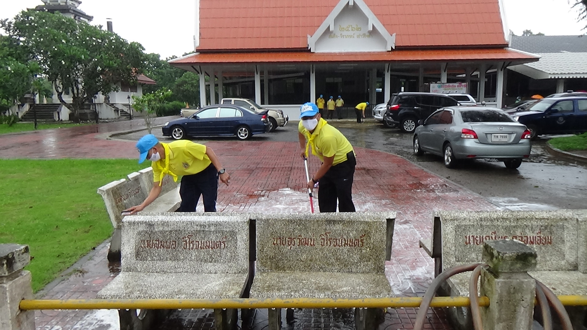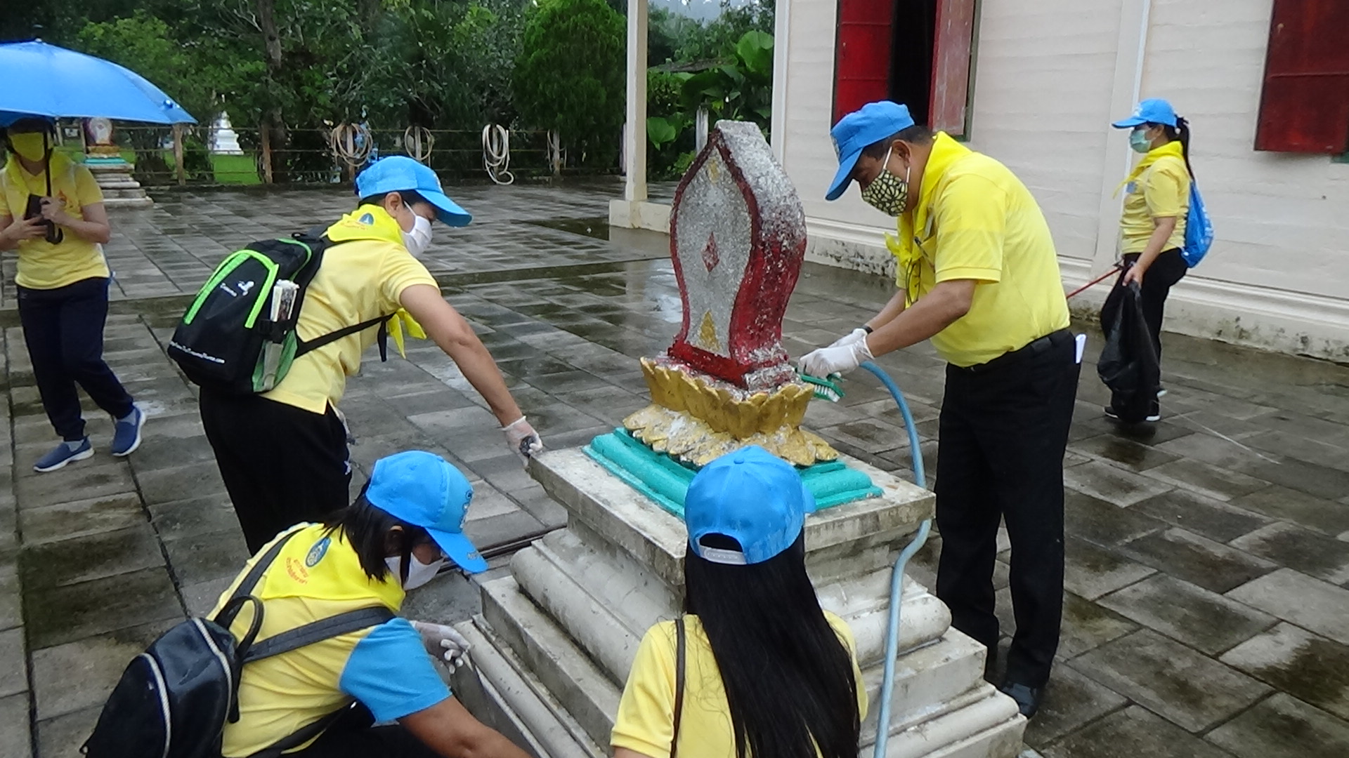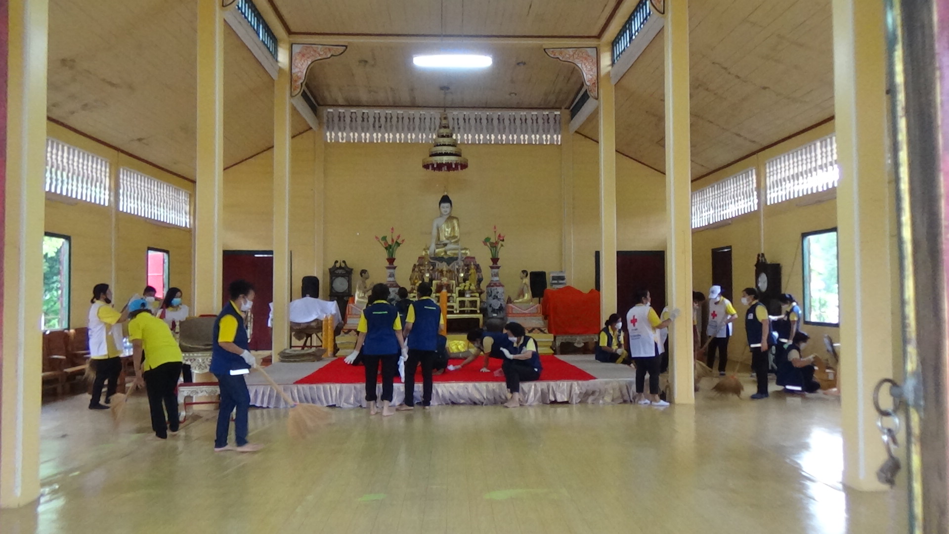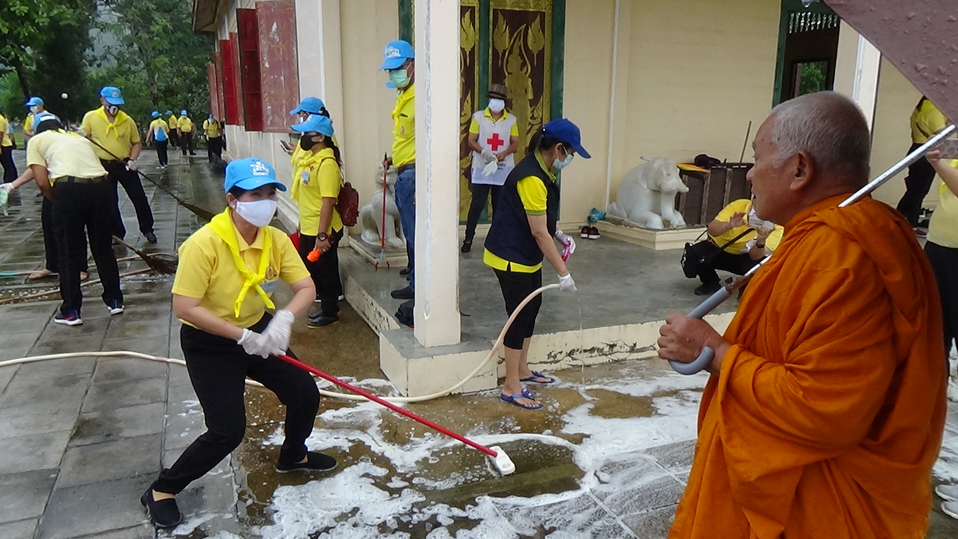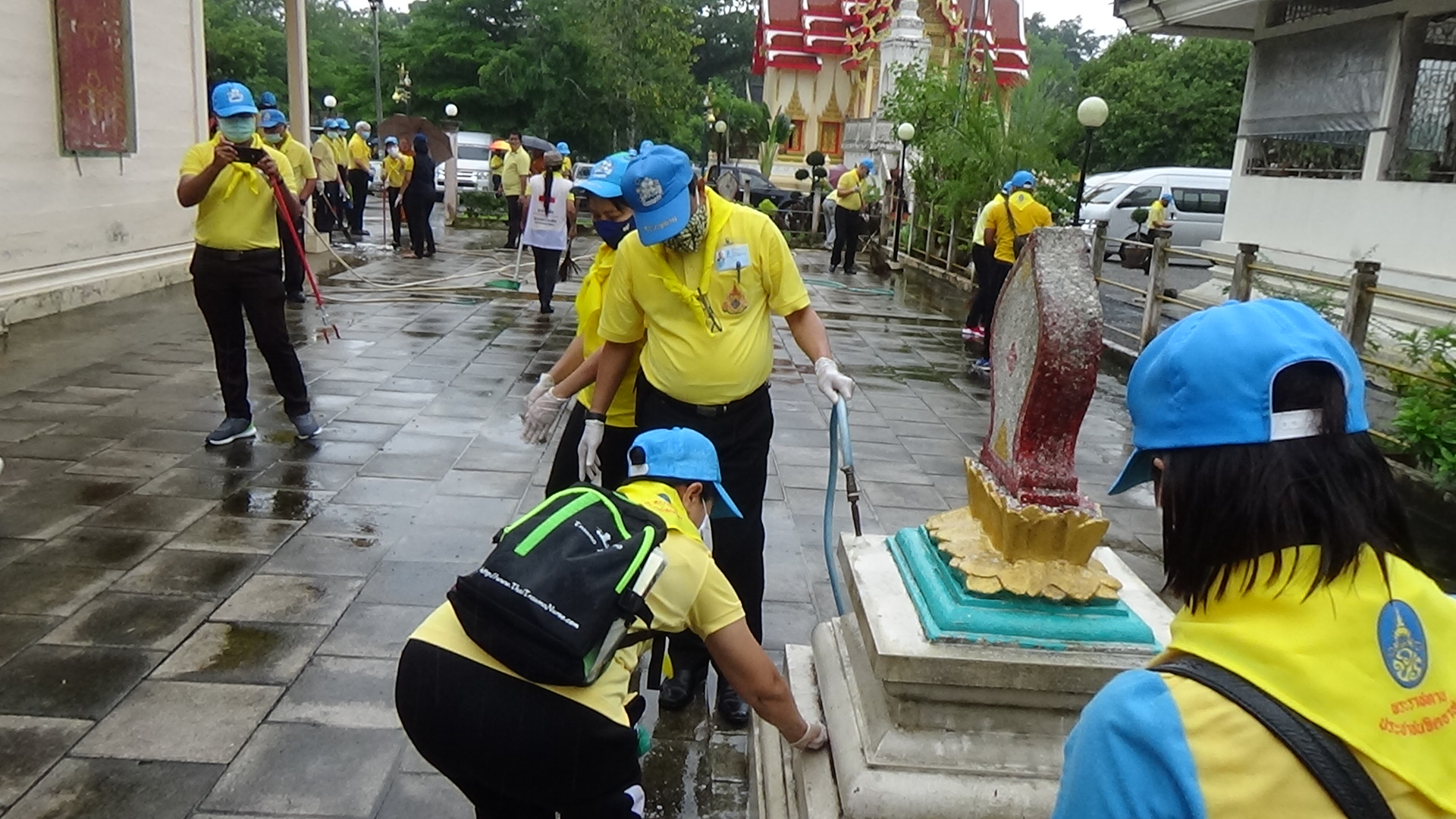 ทั้งนี้จิตอาสาจากหลายงานของภาครัฐและภาคเอกชน ได้ช่วยกันทำความสะอาดบริเวณโดยรอบพระอุโบสถ กวาดพื้น ตัดหญ้า และบริเวณโดยรอบ เพื่อให้วัดมีความสะอาดมากยิ่งขึ้น ท่ามกลางฝนที่โปรยปรายลงมาอย่างต่อเนื่อง แต่จิตอาสายังคงปฏิบัติหน้าที่ด้วยความจงรักภักดีที่มีต่อพระองค์ท่าน