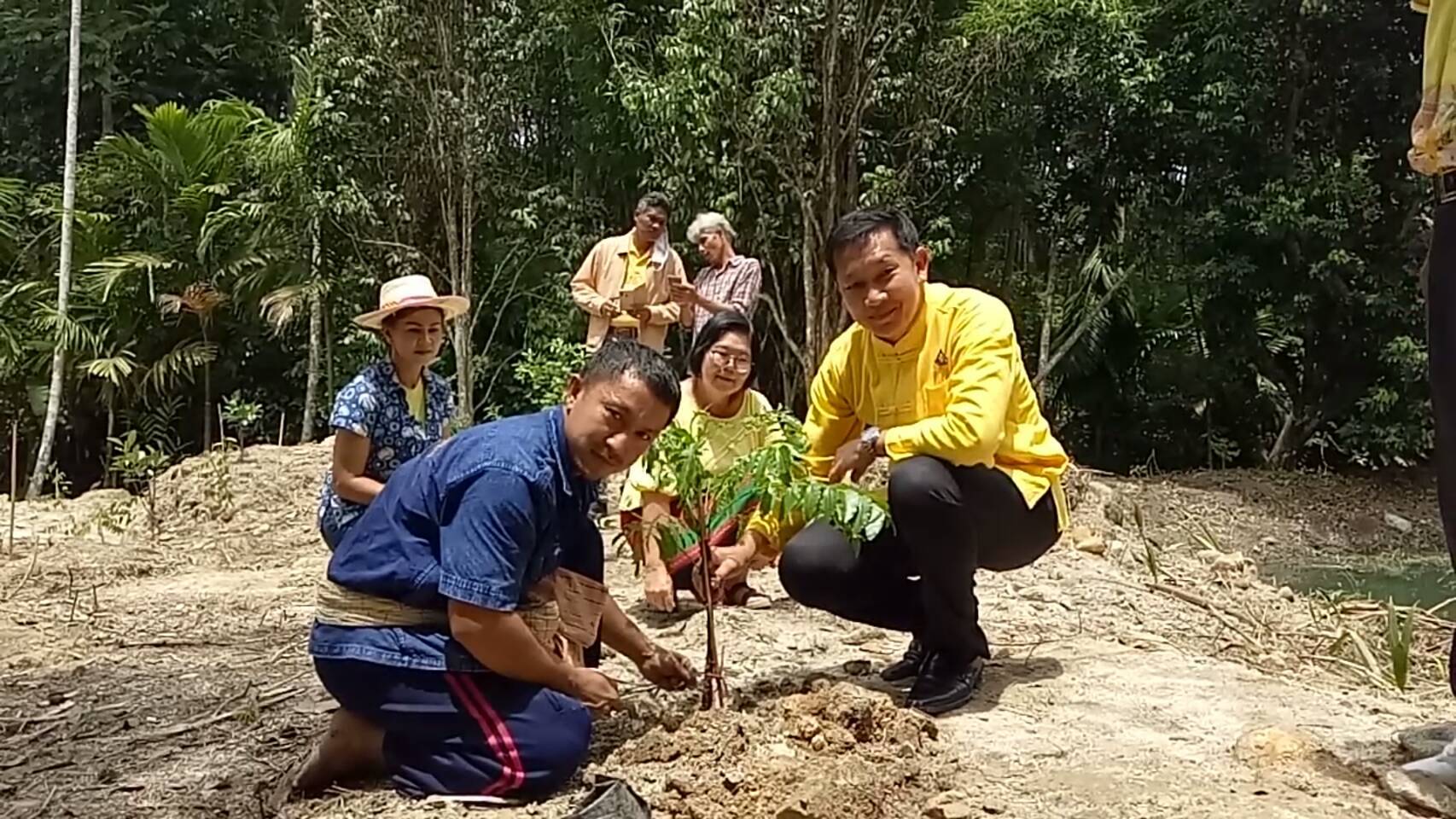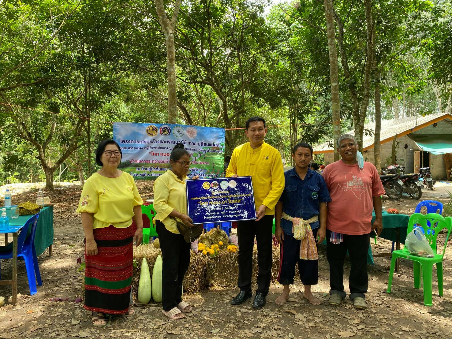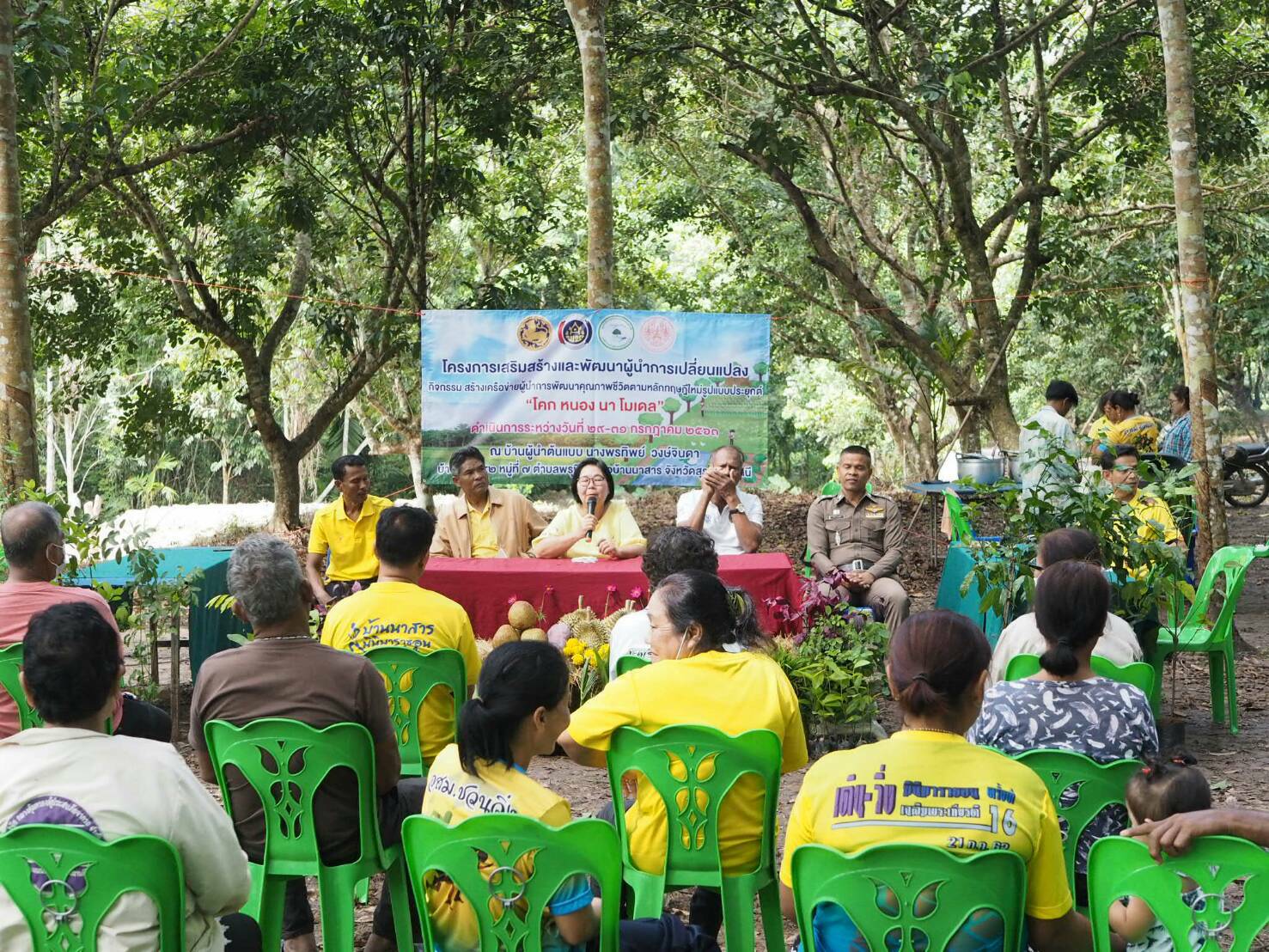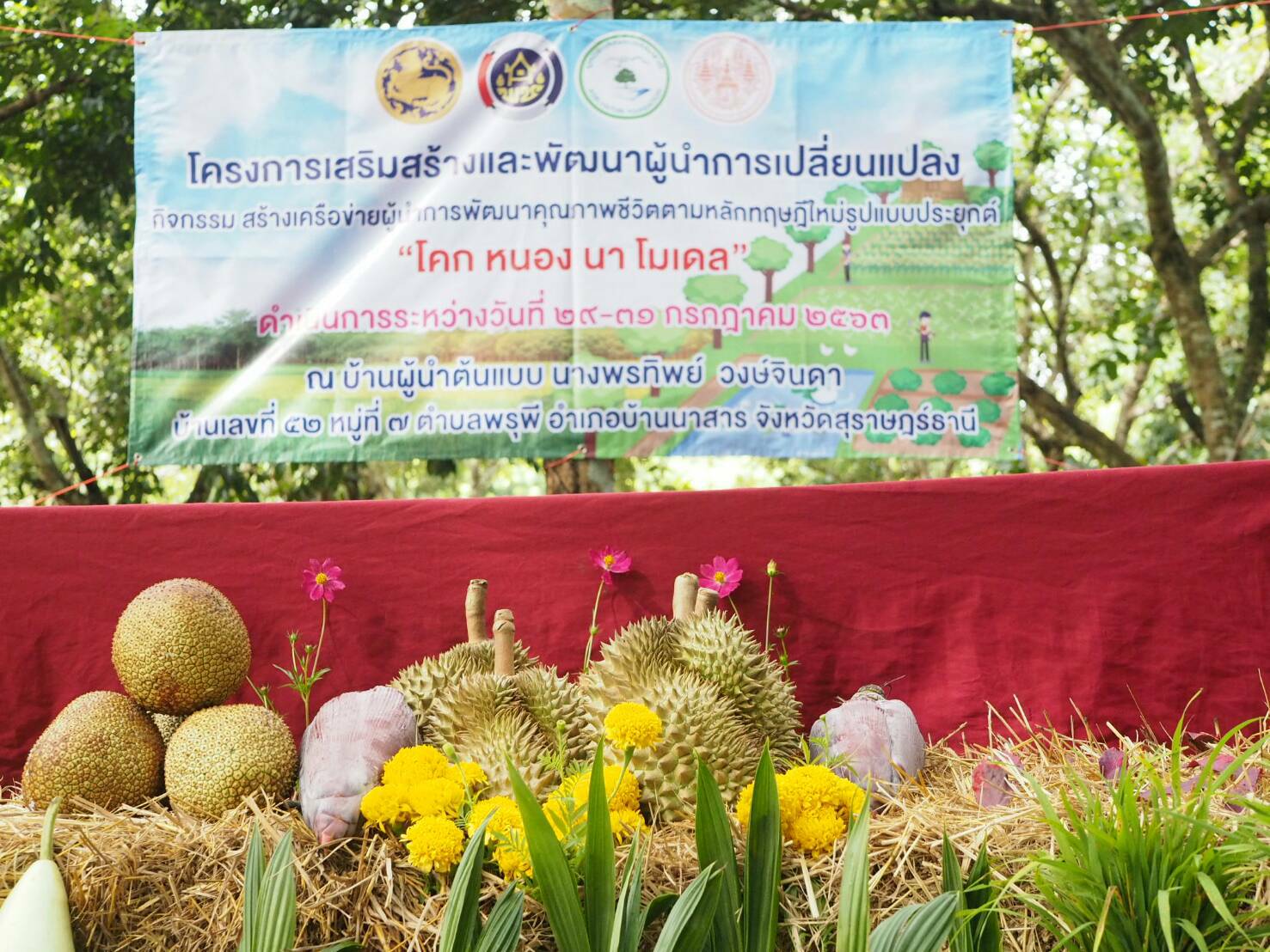 ในการนี้ ได้มอบป้ายผู้นำต้นแบบให้กับ นางพรทิพย์ วงษ์จินดา ผู้นำต้นแบบ “โคก หนอง นา โมเดล” ปลูกต้นไม้และปล่อยปลา 1000 ตัวพร้อมสนับสนุนน้ำดื่มแก่ผู้เข้าร่วมเอามื้อสามัคคี โดยมีเครือข่ายผู้นำต้นแบบจากอำเภอเภอเวียงสระ จังหวัดสุราษฎร์ธานีและอำเภอพระพรหม จังหวัดนครศรีธรรมราช มาร่วมเตรียมการและออกแบบกิจกรรมตามภูมิสังคม เพื่อสร้างเครือข่ายการเรียนรู้ระหว่างผู้นำต้นแบบและผู้สนใจในชุมชนครั้งนี้อีกด้วย