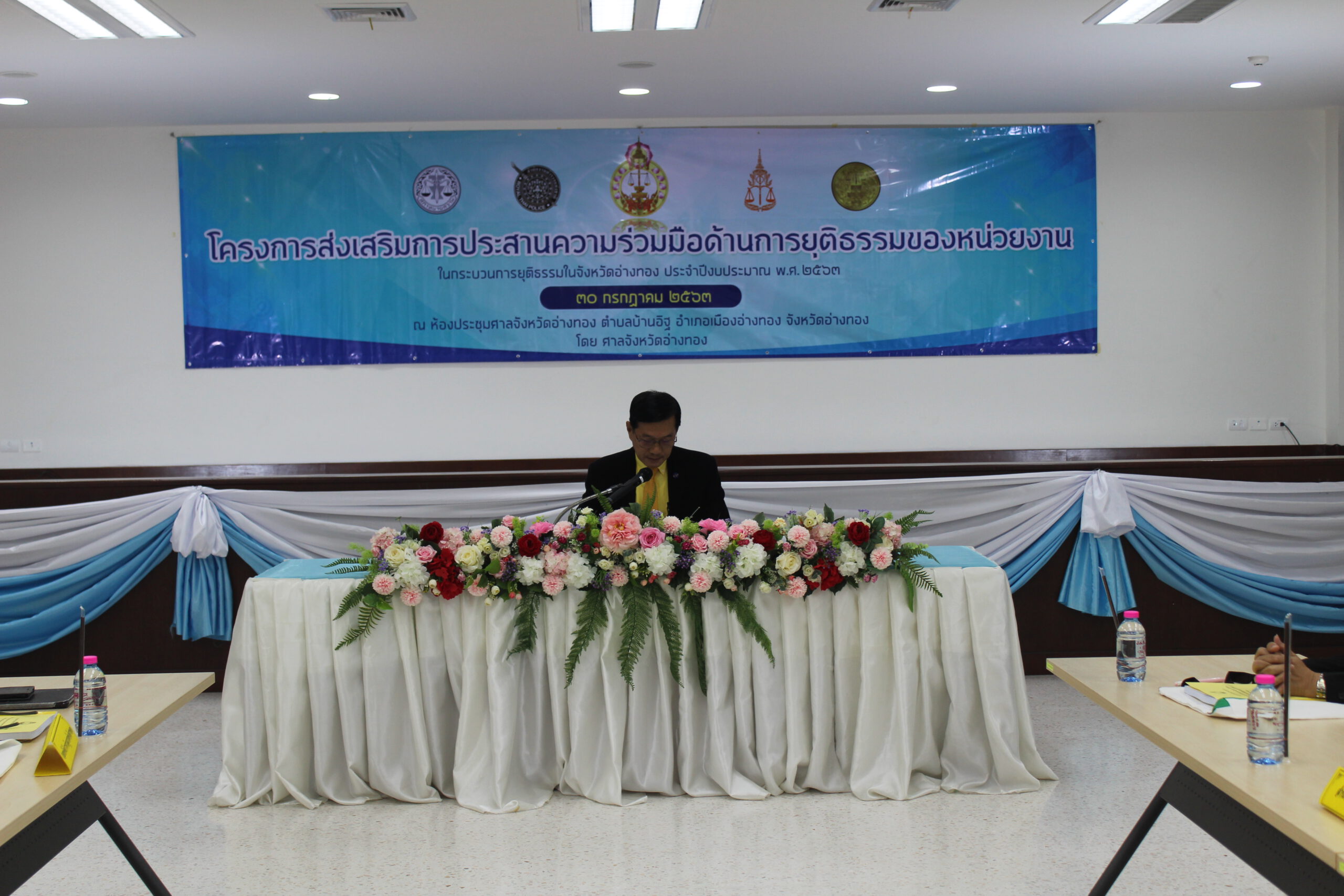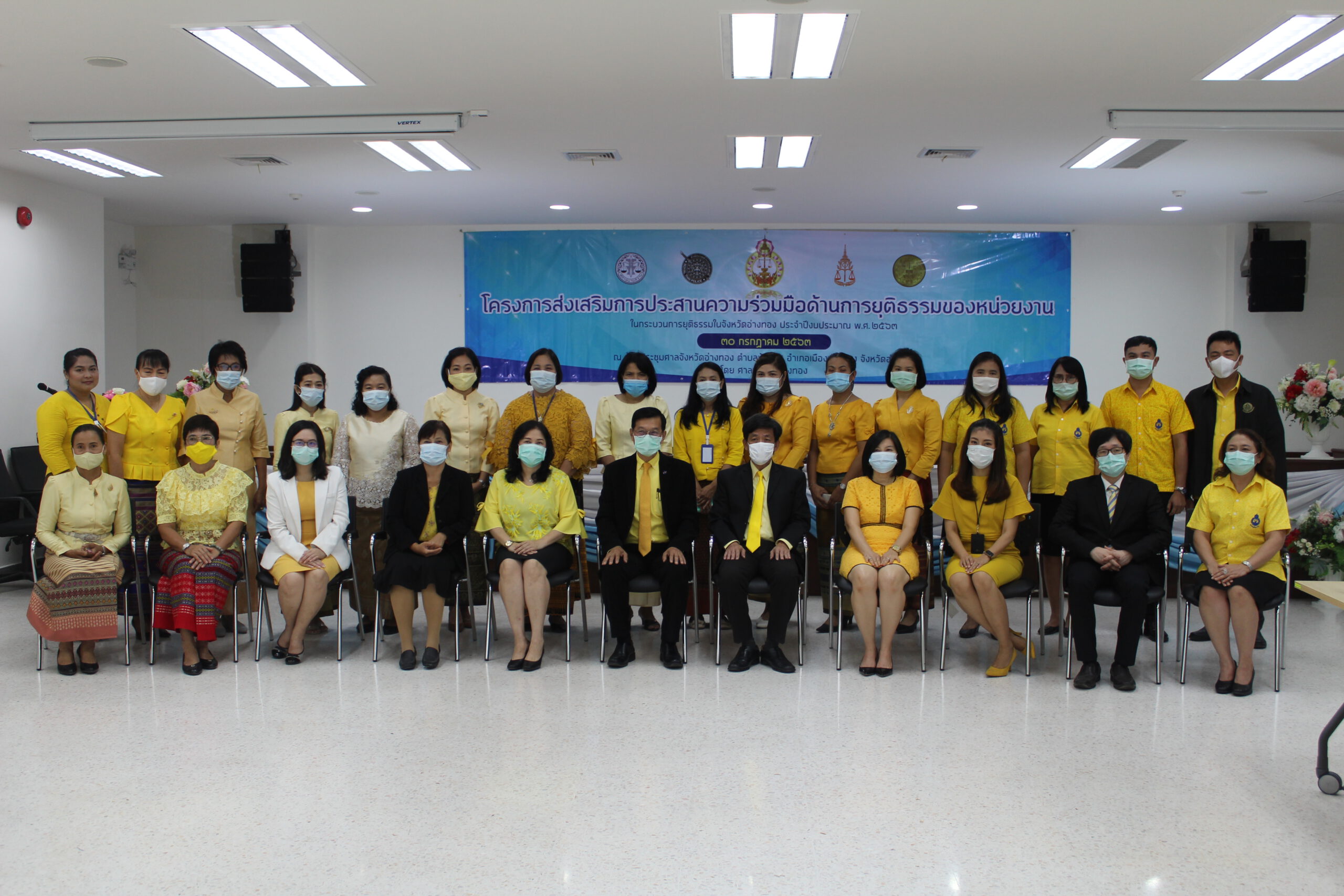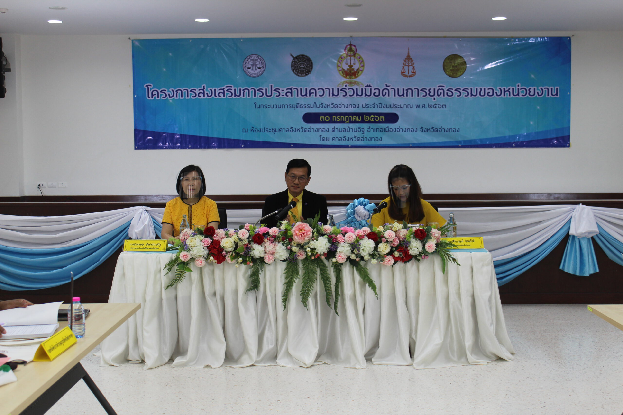วันพฤหัสบดีที่ 30 กรกฎาคม 2563 นายไวกูณฐ์ สว่างสุรีย์ ผู้พิพากษาหัวหน้าศาลจังหวัดอ่างทอง เป็นประธานเปิดโครงการ “ส่งเสริมการประสานความร่วมมือด้านการยุติธรรมของหน่วยงานในกระบวนการยุติธรรมในจังหวัดอ่างทอง” ประจำปี 2563 มีวัตถุประสงค์เพื่อให้หน่วยงานในกระบวนการยุติธรรมได้เสนอปัญหาและแนวทางแก้ไขอันเกิดจากการปฏิบัติงาน และสามารถประสานความร่วมมือให้การปฏิบัติงานของทุกหน่วยงานสอดคล้องกัน ลดปัญหาความซ้ำซ้อน ล่าช้า เกิดความศรัทธาแก่ประชาชน ในโอกาสนี้ได้รับเกียรติจากนายไวกูณฐ์ สว่างสุรีย์ ผู้พิพากษาหัวหน้าศาลจังหวัดอ่างทอง นางสาวนฤมล สัตยาประเสริฐ ผู้พิพากษาหัวหน้าคณะชั้นต้นในศาลจังหวัดอ่างทองและนางสิริกาญจน์ ทิตตภักดี ผู้พิพากษาศาลจังหวัดอ่างทอง