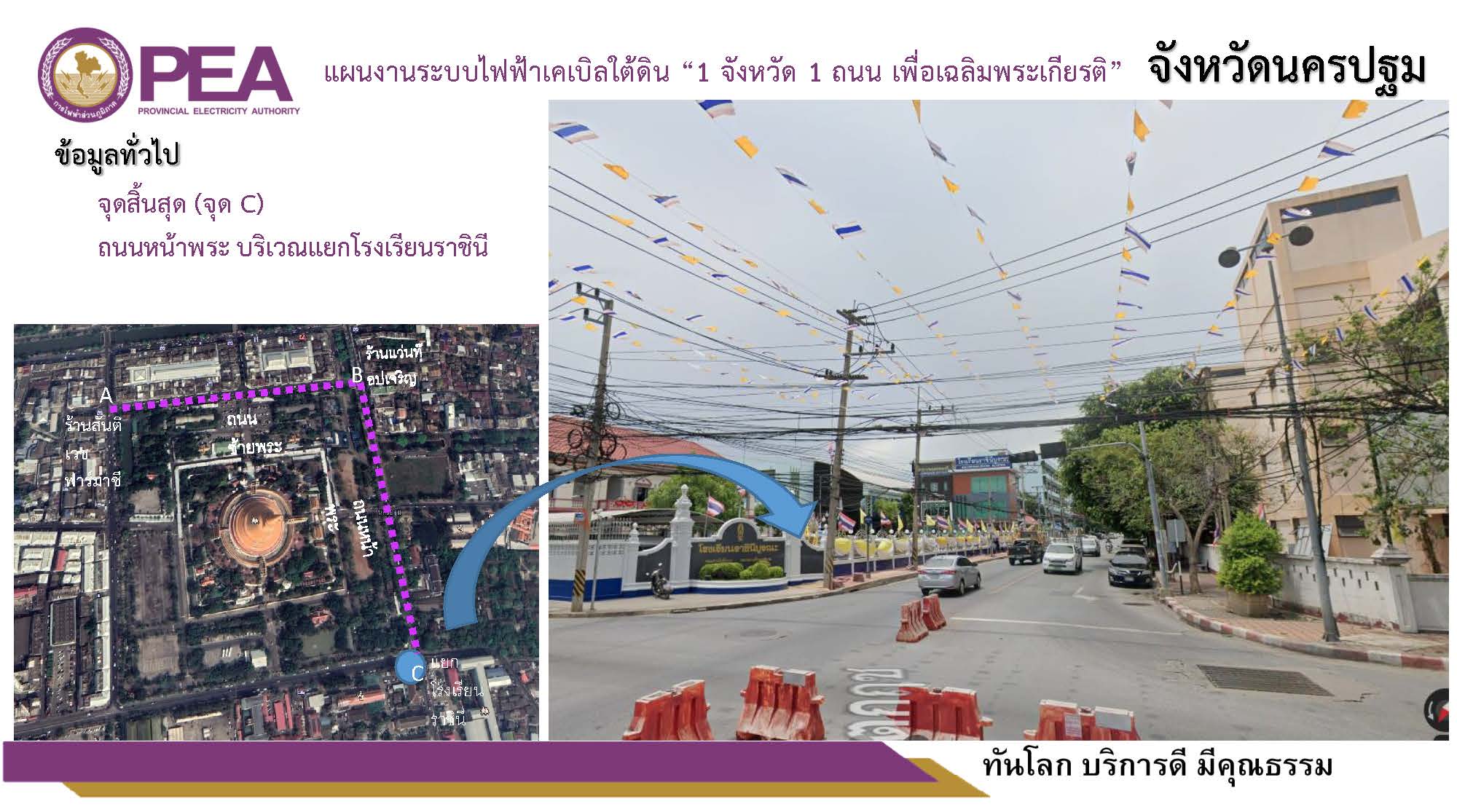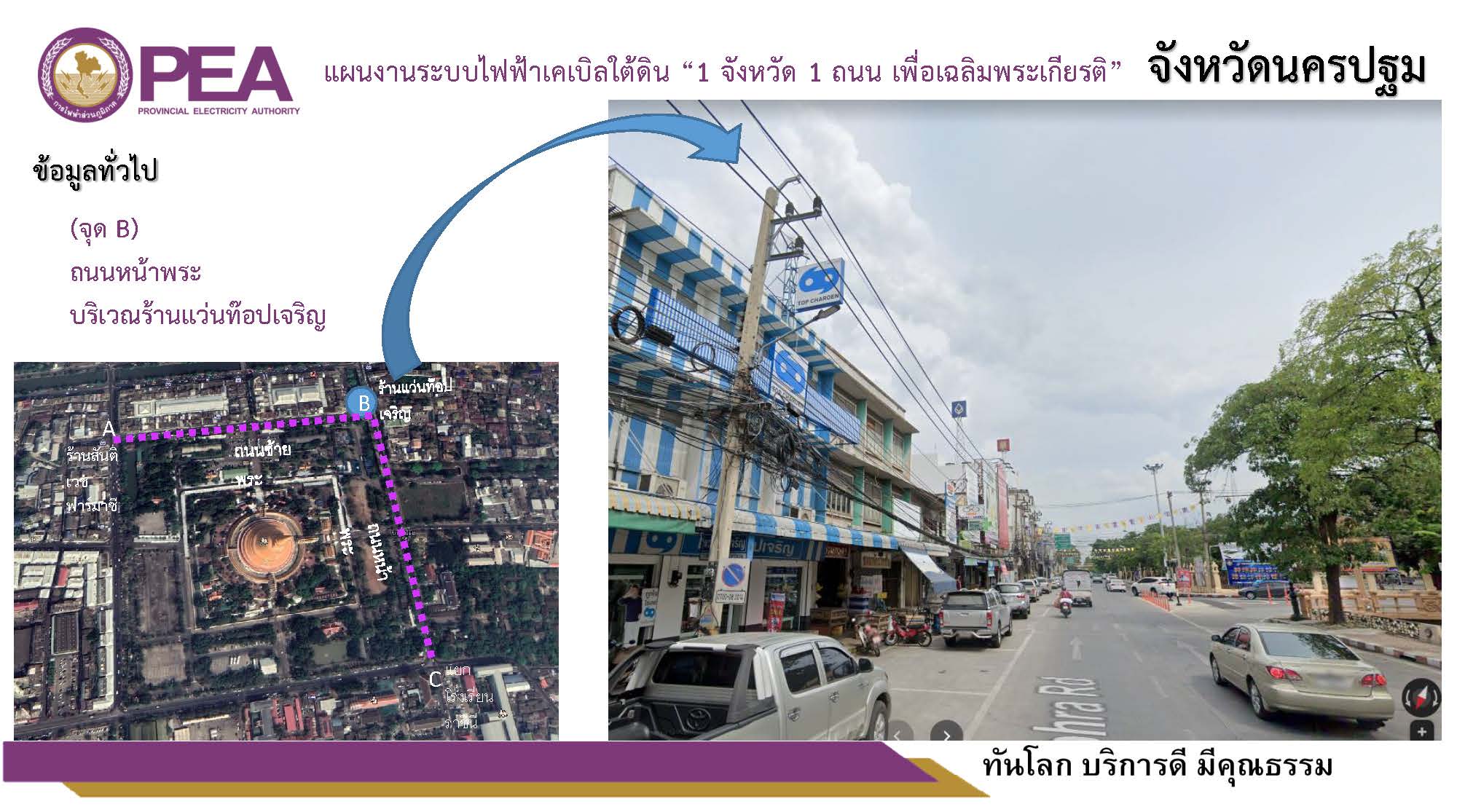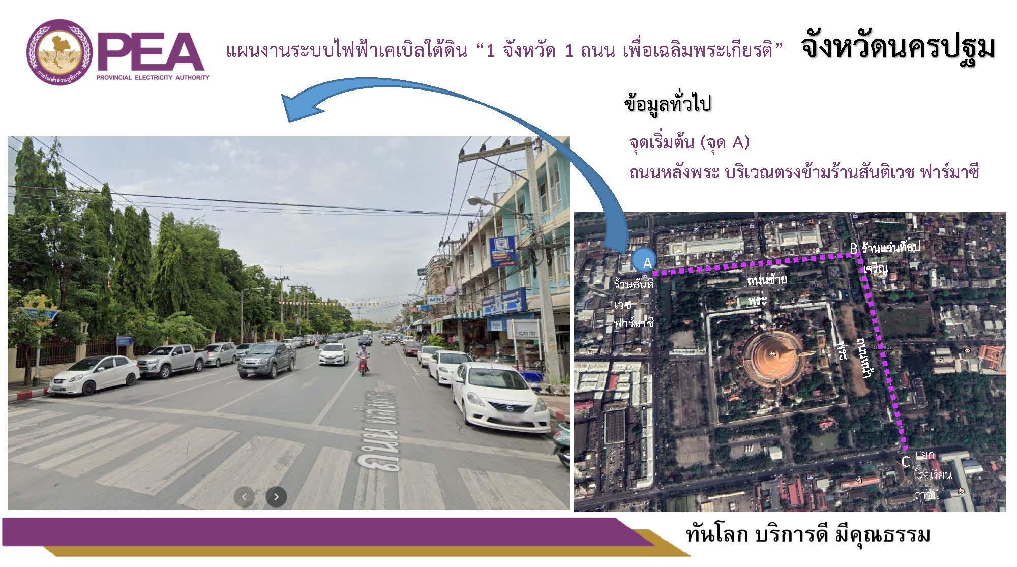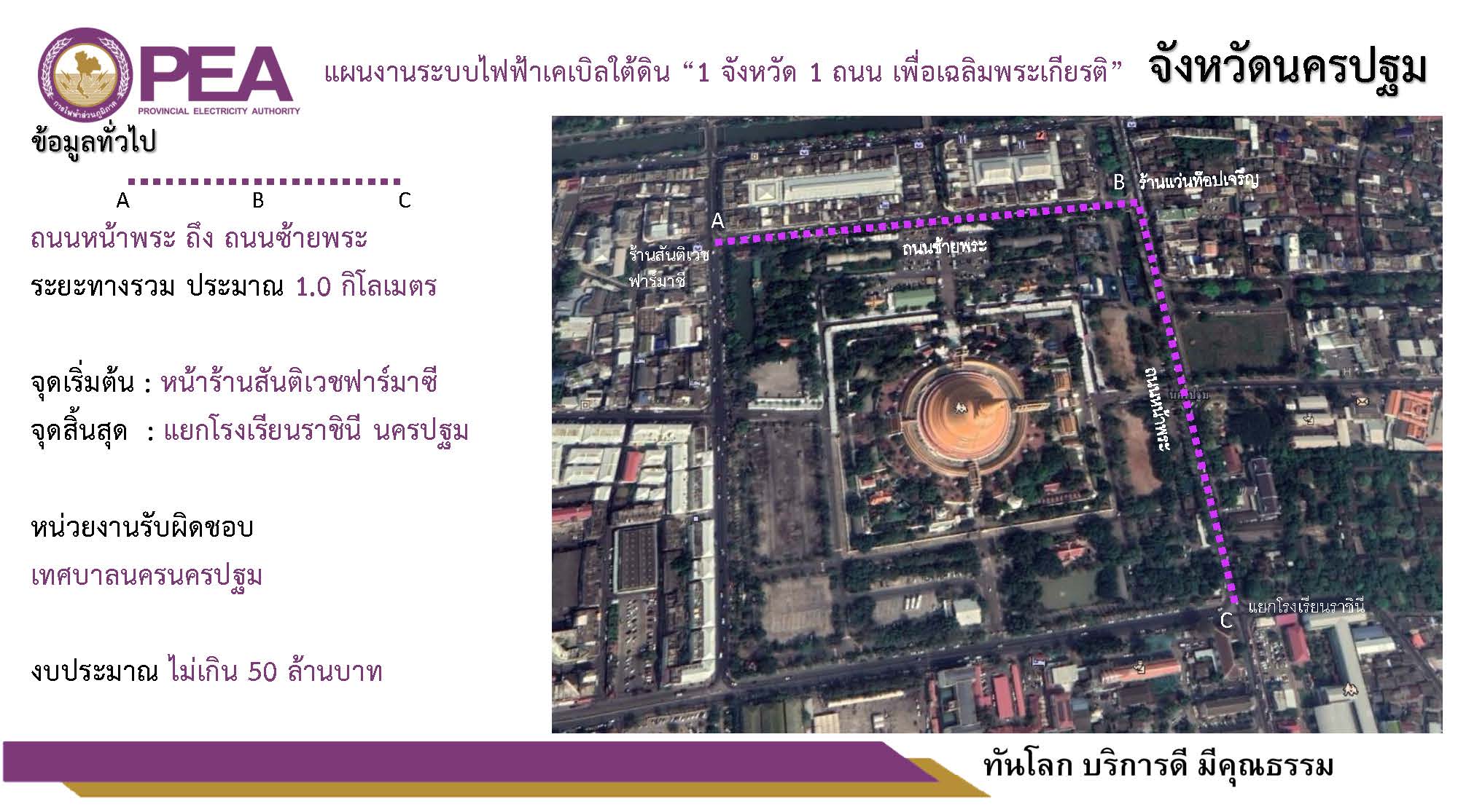 สำหรับแผนงานปรับปรุงระบบไฟฟ้าเป็นเคเบิ้ลใต้ดิน “1 จังหวัด 1 ถนน เพื่อเฉลิมพระเกียรติ” มีวัตถุประสงค์เพื่อร่วมดำเนินโครงการ และจัดกิจกรรมเฉลิมพระเกียรติ เนื่องในโอกาสมหามงคลพระราชพิธีบรมราชาภิเษก โดยการนำสายไฟฟ้าลงดิน หรือปรับปรุงย้ายแนวระบบไฟฟ้า เพื่อไม่ให้มีสายไฟฟ้าและสายสื่อสารอยู่บนดิน โดยมีขอบเขตพื้นที่ดำเนินการ 74 จังหวัด ระยะเวลาดำเนินการ ปี 2563-2566 ซึ่งทำให้ระบบไฟฟ้ามีความปลอดภัย น่าเชื่อถือมากขึ้น ทำให้ภูมิทัศน์สวยงาม เป็นระเบียบ ส่งเสริมการท่องเที่ยว เศรษฐกิจ การค้าและการลงทุนในอนาคต เบื้องต้นจังหวัดนครปฐมได้กำหนด ถนนบริเวณองค์พระปฐมเจดีย์ คือ ถนนหน้าพระ ถึงถนนซ้ายพระ ระยะทางรวมประมาณ 1กิโลเมตร โดยมีจุดเริ่มต้นตั้งแต่หน้าร้านสันติเวชฟาร์มาซี จุดสิ้นสุดที่แยกโรงเรียนราชินีบูรณะ ใช้งบประมาณไม่เกิน 50 ล้านบาท และจะเริ่มดำเนินงานปรับปรุงระบบไฟฟ้าเป็นเคเบิ้ลใต้ดินในเดือน พ.ย.63 – ต.ค.64