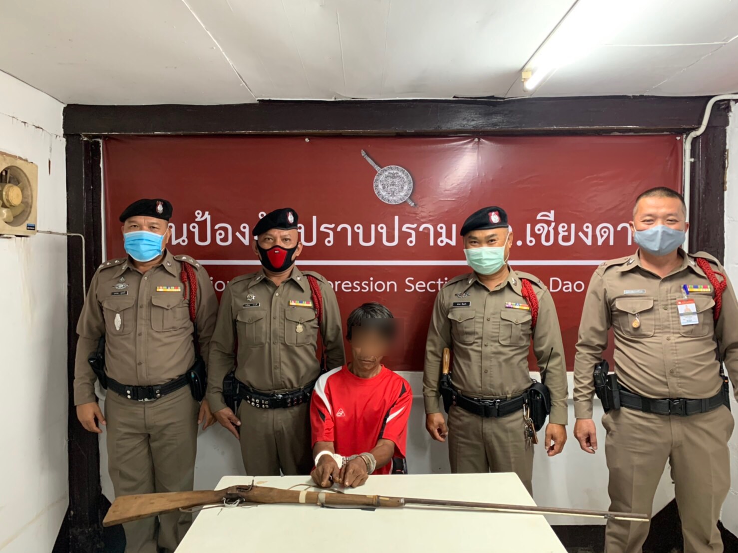 2ส.ค.63เวลา06.00น.พ.ต.อ.วินิจฉัย พินิจศักดิ์ ผกก สถานีตำรวจภูธรเชียงดาว จังหวัดเชียงใหม่ พ.ต.ท.สมศักดิ์ ขันชัยทิศ รอง ผกก.ป.ฯ, สั่งการให้พ.ต.ท.นคร อุ่นตาน สวป.ฯ,ร.ต.อ.บรรจบ อุตรศรี รอง สวป.ฯ/ร้อยเวร20,ด.ต.สาคร อิ่นแก้ว ,ด.ต.มณฑล ยอดน้ำคำ, ด.ต.ธงชัย ตานที จับกุม พ.ร.บ.อาวุธปืน(ปืนแก๊ปยาว) 1 ราย1คน คือ นายหงษ์ ละป้อน อายุ 55 ปี ที่อยู่ 910/ช ม.5 ต.แม่นะ อ.เชียงดาว จ.เชียงใหม่ พร้อมด้วย อาวุธปืนยาวไทยประดิษฐ์(ปืนแก๊ป) จำนวน 1 กระบอก พิษโควิคทำลายประสาททำมาหากินฝืดเคืองกินทั้งเหล้าคว้าทั้งปืนประกาศก้องใครแน่จริงออกมาลุ้นกูสู้ตาย ชาวบ้านใกล้เคียงผวากลัวยิงออกมาใส่ชาวบ้าน จึงแจ้งตำรวจออกมาจับจนได้ นำตัวไปสงบสติอารมภ์ในห้องขังนำส่งพนักงานสอบสวน สภ.เชียงดาวฯ เพื่อดำเนินคดีตามกฎหมายต่อไป