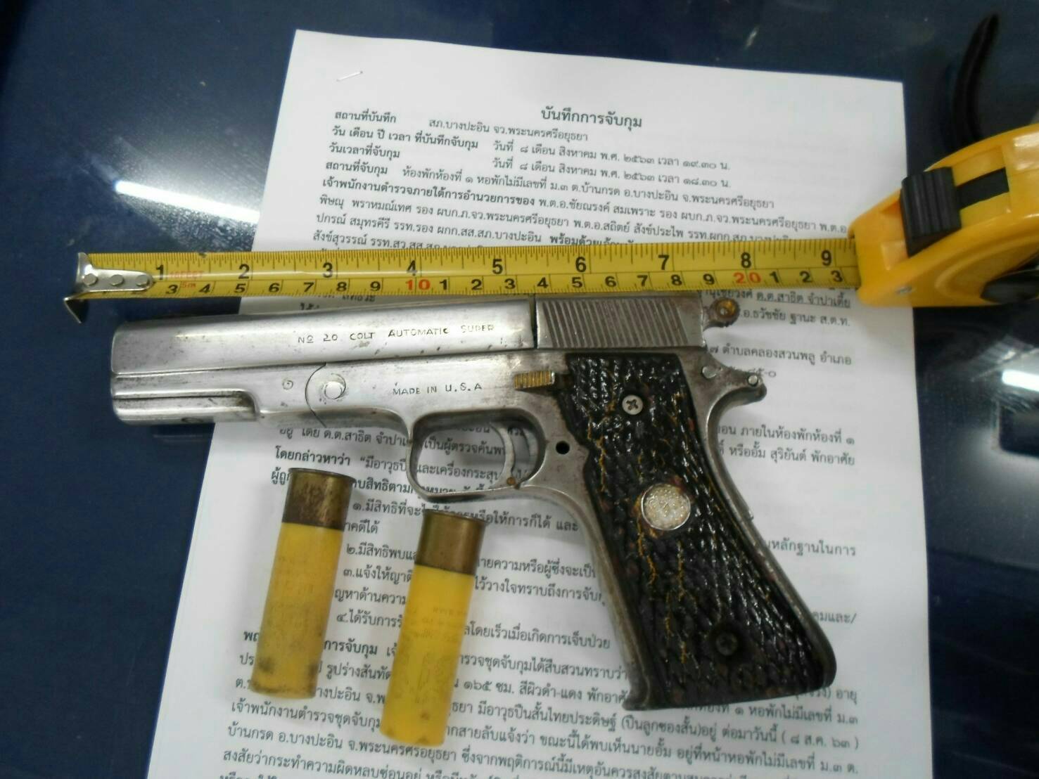 อยุธยาพร้อมด้วยของกลาง ยาบ้า จำนวน13 เม็ด , ยาไอซ์ 2.35 กรัม , อาวุธปืนพกสั้น ออโต
