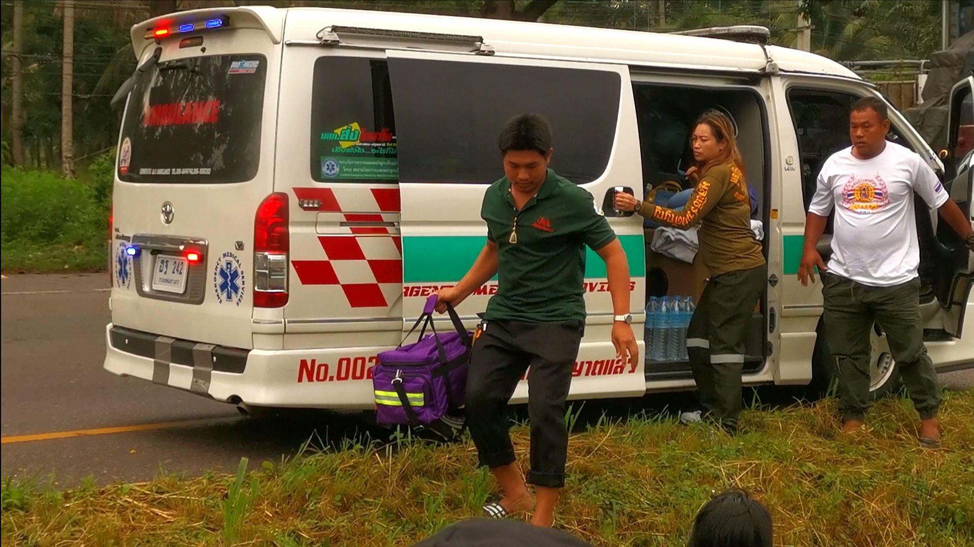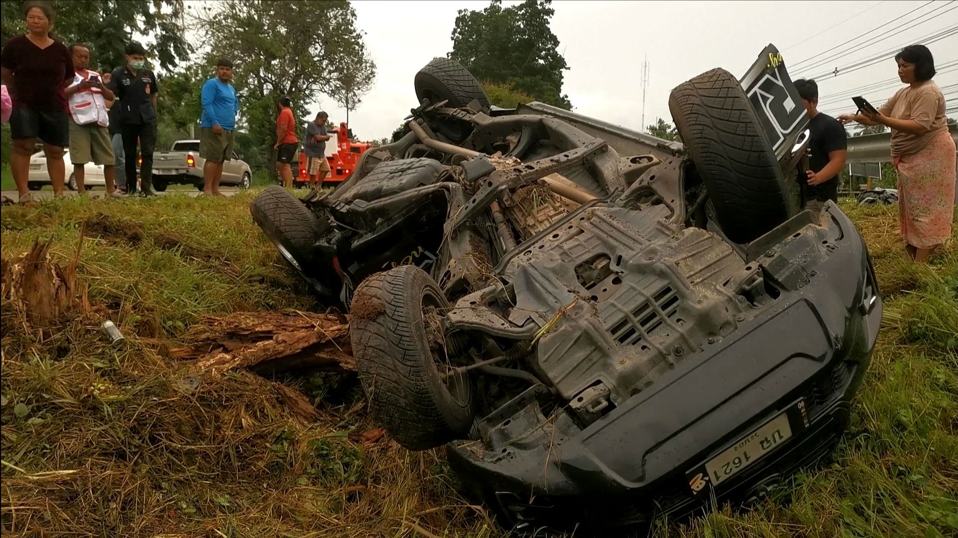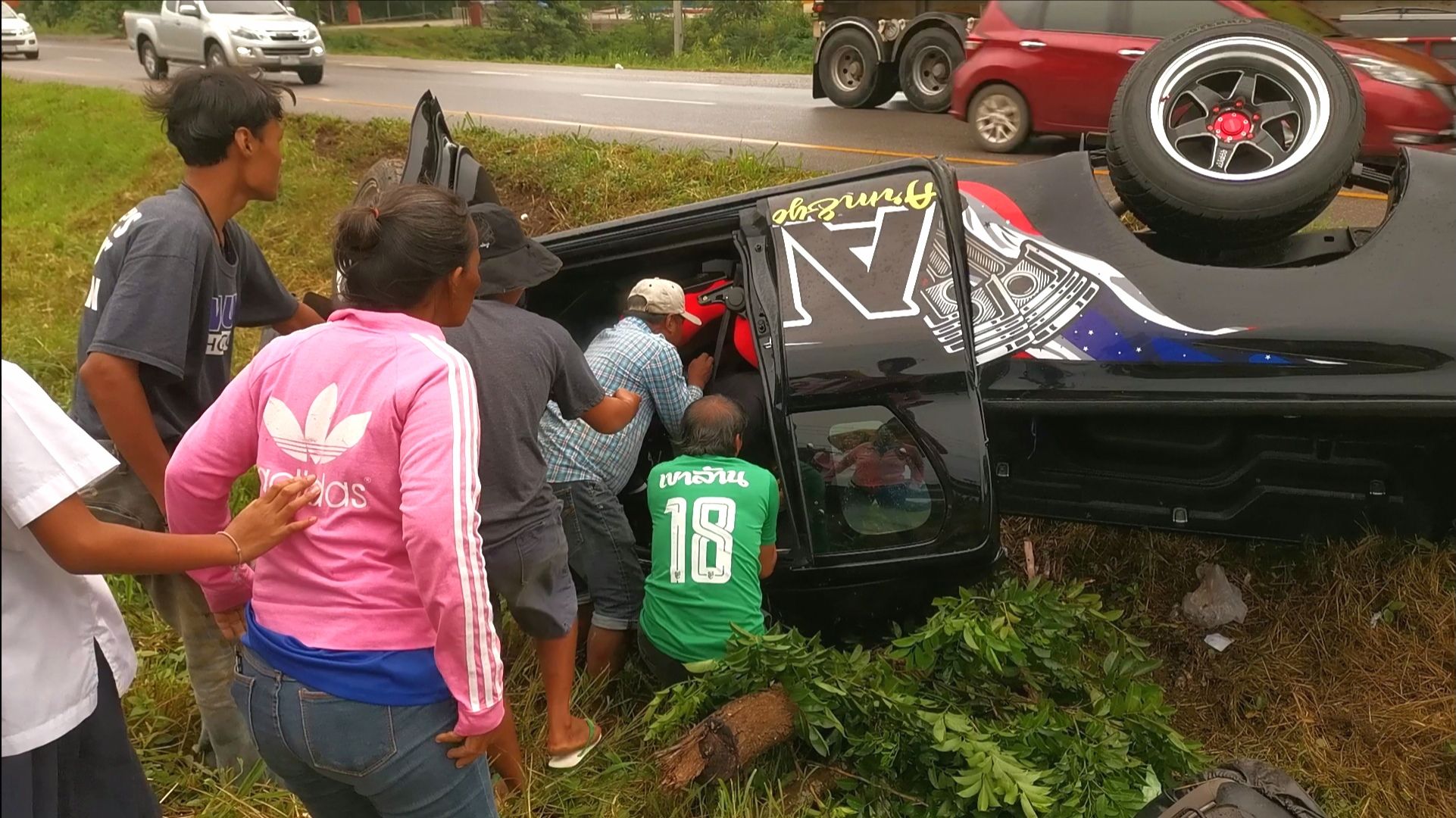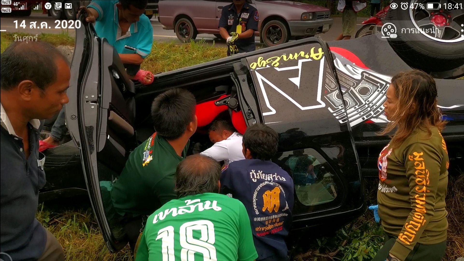 บริเวณที่เกิดเหตุพบรถกระบะ โตโยต้า รีโว่ หมายเลขทะเบียน โตโยต้าวีโก้ สีดำ ทะเบียน บฉ 1621 ระนอง อาสามูลนิธิร่วมกตัญญูจาก กทม.ที่กำลังเดินทางไปรับผู้บาดเจ็บจากอุบัติเหตุที่จังหวัดสุราษฎร์ธานี ผ่านมาประสบเหตุ ได้เข้าให้การช่วยเหลือและปฐมพยาบาลเบื้องต้น พร้อมร่วมกับพลเมืองดีนำตัว ผู้บาดเจ็บออกมาจากรถ จำนวน 2 ราย ทราบชื่อผู้ขับขี่ คือ นายวสันสิทธิ์ สารพิษ อายุ 25 ปี บ้านอยู่ อ.ละอุ่น จ.ระนอง มีบาดแผลที่ใบหน้า และ น.ส.พิศมัย วงศ์ศรี อายุ 25 ปี แฟนสาว บาดเจ็บสาหัส จากแรงกระแทก เจ้าหน้าที่รีบปฐมพยาบาลเบื้องต้นและนำตัวส่ง รพ.ทับสะแก