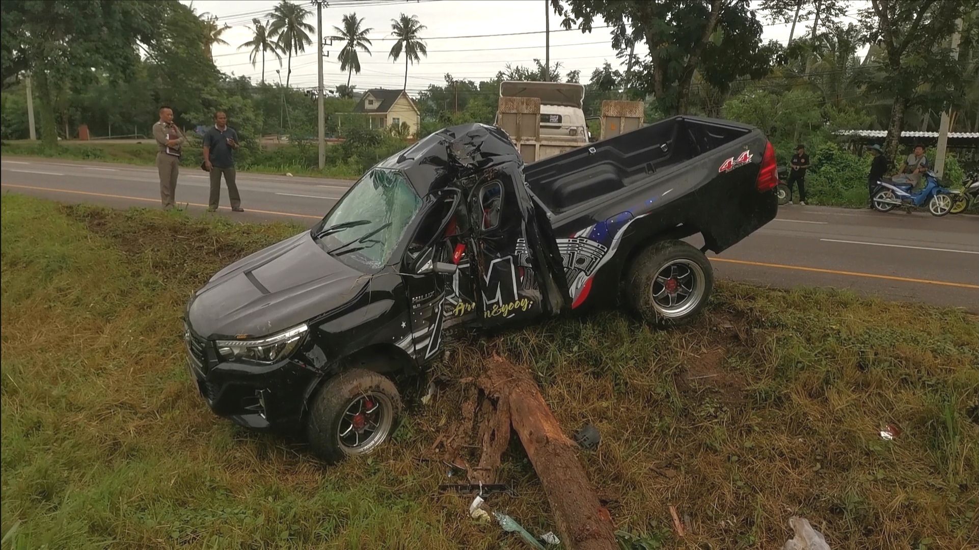 หนุ่มขับกระบะพาแฟนสาวกลับบ้าน ฝนตกถนนลื่นรถเสียหลักหมุนฟาดต้นไม้หวิดดับคู่