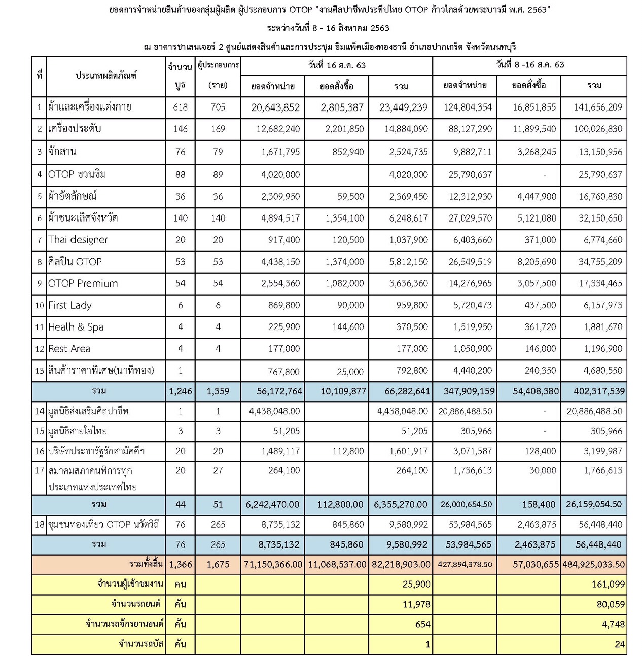 เมื่อวันที่ 17 ส.ค.63 นายสุทธิพงษ์ จุลเจริญ อธิบดีกรมการพัฒนาชุมชน (พช.) เปิดเผยว่า งาน “ศิลปาชีพประทีปไทย OTOP ก้าวไกลด้วยพระบารมี 2563” จัดระหว่างวันที่ 8 – 16 สิงหาคม ณ ชาเลนเจอร์ 2 อิมแพ็ค เมืองทองธานี ตลอด 9 วัน ได้รับความสนใจจากประชาชนเดินทางหลั่งไหลมาเที่ยวชมงานอย่างคึกคัก มีผู้เข้าชมงาน 161,099 คน รวมยอดขาย 484,925,033.50 บาท ทะลุเป้าที่ตั้งไว้ 300 ล้านบาท ซึ่งเป็นยอดจำหน่ายสินค้า OTOP ทั้ง 5 กลุ่ม ได้แก่ อาหาร เครื่องดื่ม ผ้าและเครื่องแต่งกาย ของใช้ของตกแต่งของที่ระลึก และสมุนไพรที่ไม่ใช่อาหาร ตลอดจนผลิตภัณฑ์ชุมชนท่องเที่ยว OTOP นวัตวิถีทั่วเมืองไทย 76 จังหวัด และหน่วยงานเครือข่ายต่างๆ ที่เข้าร่วม โดยยอดจำหน่ายสินค้า OTOP กลุ่มผ้าและเครื่องแต่งกายจำหน่ายได้สูงสุดกว่า 141,656,209 บาท ขณะที่ยอดจำหน่ายผลิตภัณฑ์จากมูลนิธิศิลปาชีพฯ 20,886,488.50 บาท ผลิตภัณฑ์จากมูลนิธิสายใจไทย 305,966 บาท ผลิตภัณฑ์บริษัทประชารัฐรักษามัคคีฯ 3,199,987 บาท ผลิตภัณฑ์จากสมาคมสภาคนพิการฯ 1,766,613 บาท และผลิตภัณฑ์ชุมชนท่องเที่ยว OTOP นวัตวิถี 56,448,440 บาท