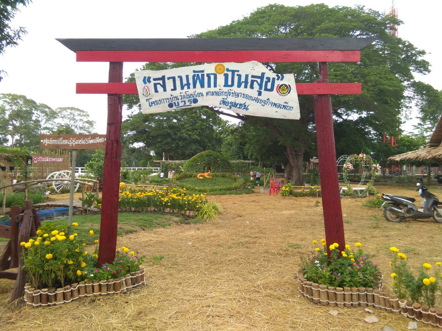 ที่ จ.สุพรรณบุรี นายธนนท์ พรรพีภาส นายอำเภอเดิมบางนางบวช ได้เป็นประธานเปิดโครงการ “สวนผักปันสุขบ้านวัดโรงเรียน (บวร)น้อมนำหลักปรัชญาของเศรษฐกิจพอเพียง” ที่วัดท่ามะนาว ต.ยางนอน โดยมีนายนครินทร์ จันละคล ผู้อำนวยการโรงเรียนวัดท่ามะนาว กล่าวรายงานวัตถุประสงค์ มี พระอธิการอุ่น สมจิตโต เจ้าอาวาสวัดท่ามะนาว นายเจริญ มะนาวหวาน กำนันตำบลยางนอน นายอำนวย ช้างวศ์ ผู้อำนวยการอุทยานผักพื้นบ้านเพื่อการยังชีพเฉลิมพระเกียรติบึงฉวาก สำนักงานเกษตรจังหวัดสุพรรณบุรี กรมส่งเสริมการเกษตรอำเภอเดิมบางนางบวช พัฒนาชุมชนอำเภอเดิมบางนางบวช อสม. จากโรงพายาบาลส่งเสริมสุขภาพตำบลยางนอน คณะครูและนักเรียนโรงเรียนวัดท่ามะนาว ชาวบ้าน จิตอาสาในชุมชน และชาวบ้านตำบลยางนอนร่วมพิธีเปิด