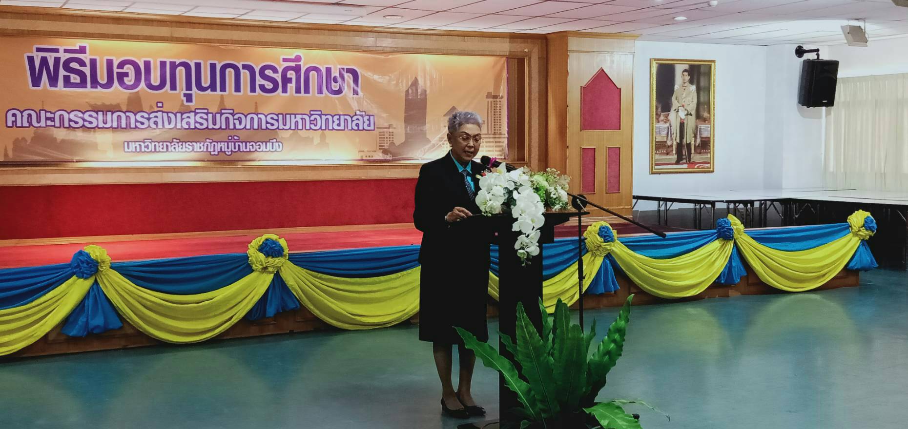 ราชบุรี ม.ราชภัฎหมู่บ้านจอมบึงทำพิธีรับมอบทุนการศึกษาประจำปี 2563. ผศ.ดร.ชัยฤทธิ์ ศิลาเดช อธิการบดี นางวลัยรัตน์ ทรัพย์คิรี ประธานที่ปรึกษาคสม. นางชื่นจิตต์ เจริญงาม ประธานอนุกรรมการจัดหาทุนและพิจารณาทุนนักศึกษาขาดแคลน นายเรืองชัย เนตรปฐมพร ประธานคณะกรรมการเสริมกิจการมหาวิทยาลัยราชภัฎหมู่บ้านจอมบึง พร้อมด้วยคณาจารย์ ที่ปรึกษาคสม. กรรมการคสม. และผู้ช่วยประธานคสม. ร่วมพิธีมอบการศึกษาให้นักศึกษาขาดแคลนเพิ่มเติม 40 ทุนๆละ 5,000 บาท