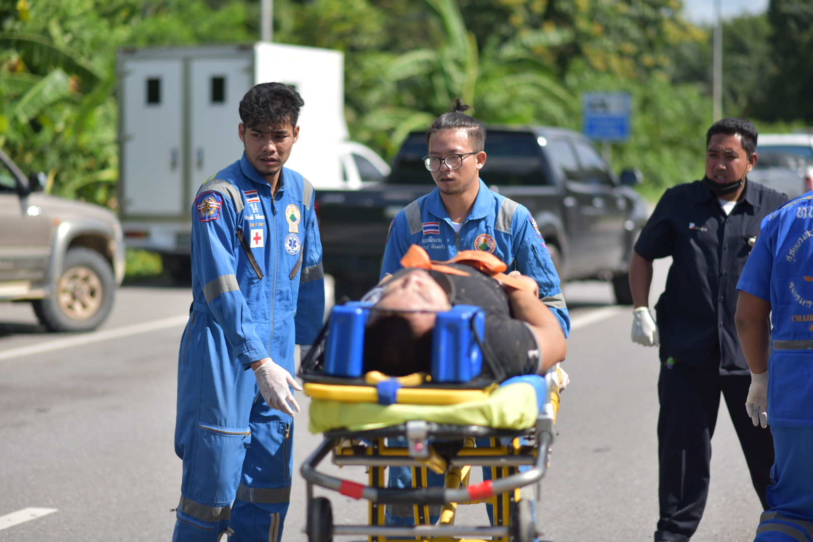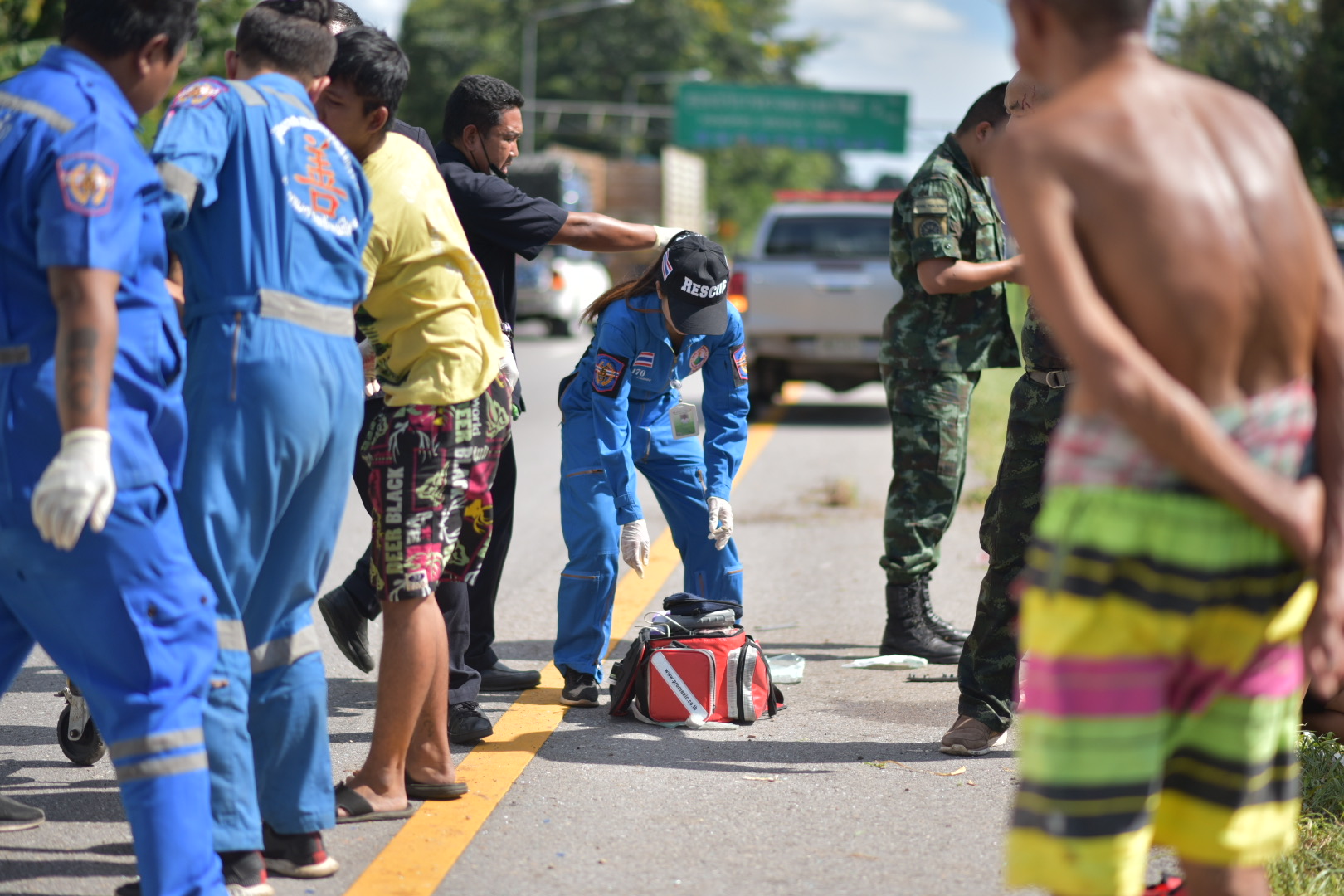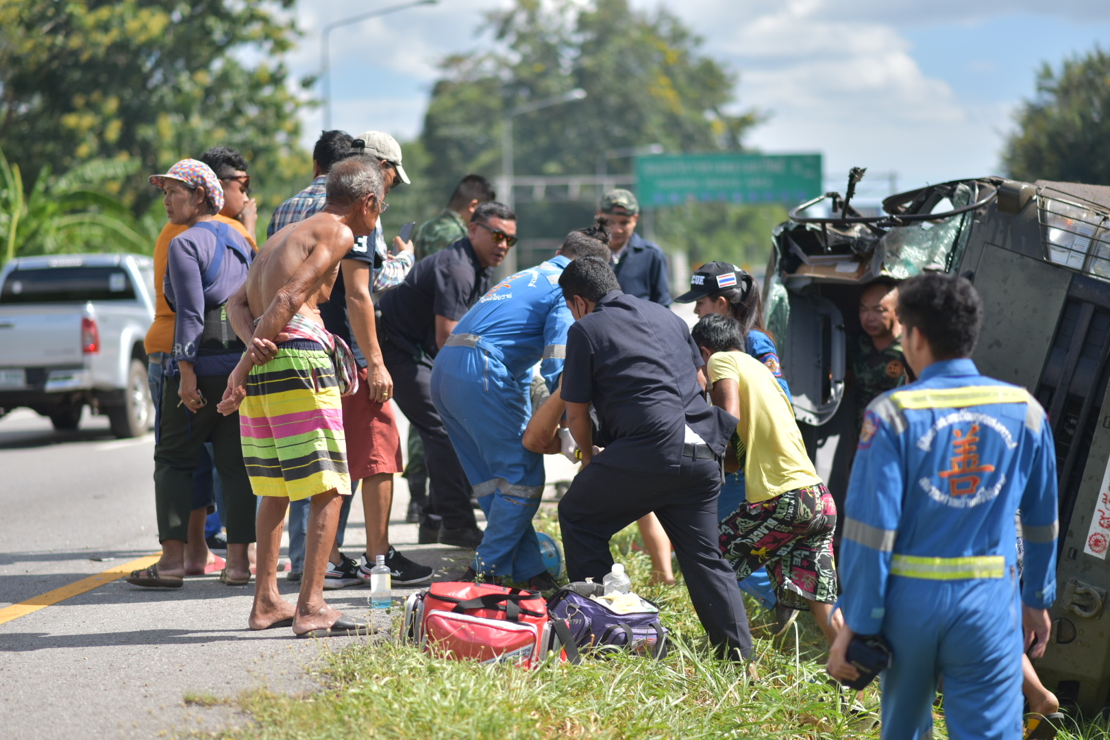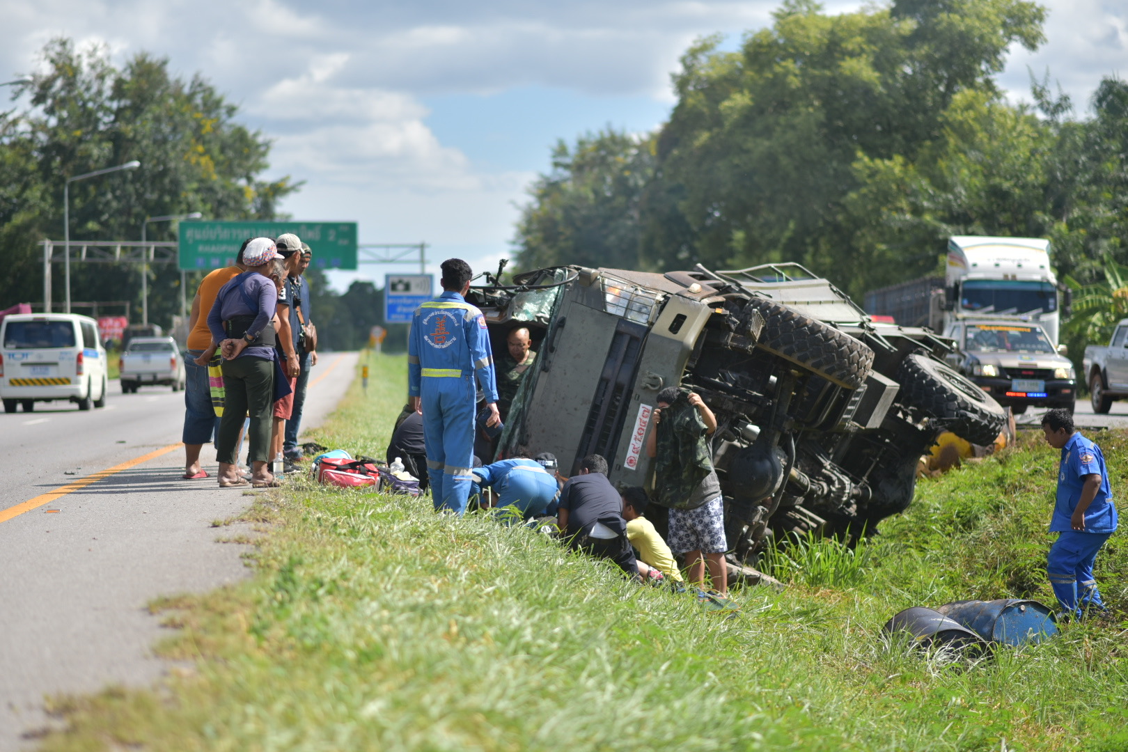 ที่เกิดเหตุบริเวณล่องกลางถนนพบรถ 6 ล้อทหาร หมายเลขหน้ารถ 95047 อยู่ในสภาพพลิกตะแคง กระจกหน้าแตก มีคราบน้ำมันไหลนองพื้นผิวจราจร เจ้าหน้าที่ต้องกันให้รถที่วิ่งสัญจรใช้ช่องทางจราจรเพียงช่องทางเดียว ในที่เกิดเหตุผู้บาดเจ็บจำนวน 3 ราย เจ้าหน้าที่กู้ชีพได้ ช่วยกันนำตัวผู้บาดเจ็บออกจากตัวรถ จากนั้นนำผู้บาดเจ็บทั้งหมด ส่งโรงพยาบาลบางสะพานน้อย