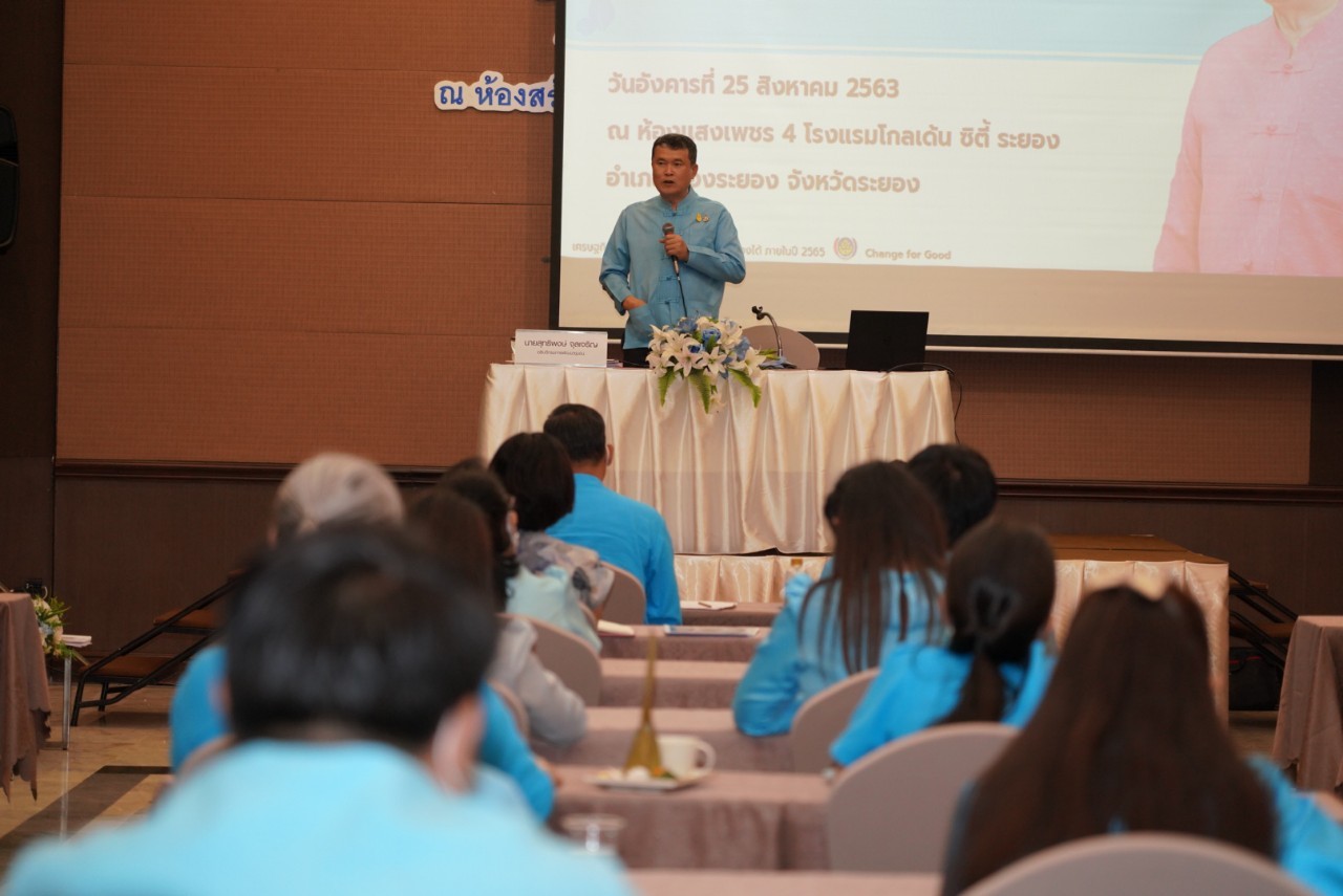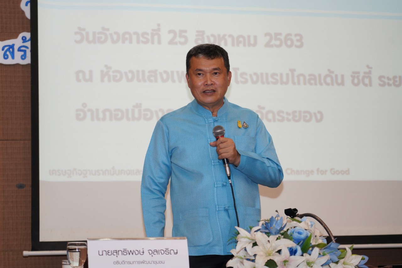 วันที่ 25 ส.ค. เวลา 10.30 น. นายสุทธิพงษ์ จุลเจริญ อธิบดีกรมการพัฒนาชุมชน เดินทางไปยังห้องประชุมสร้อยเพชร 3 โรงแรมโกลเด้น ซิตี้ ระยอง อ.เมืองระยอง จ.ระยอง เพื่อมอบนโยบายการปฏิบัติราชการและบรรยายพิเศษในหัวข้อ บทบาทของกรมการพัฒนาชุมชนกับการขับเคลื่อนเศรษฐกิจฐานราก ตามนโยบายรัฐบาลและกระทรวงมหาดไทย ให้แก่เจ้าหน้าที่พัฒนาชุมชนจังหวัดระยองจำนวน 50 คน โดยมีนายพิศ นันทพูนพิพัฒน์ พัฒนาการจังหวัดระยอง บรรยายสรุปผลการดำเนินงานพัฒนาชุมชนในพื้นที่ และมีนายโชคชัย แก้วป่อง รองอธิบดีฯ นางสาวชนมณัฐ รอดบุญธรรม ผู้ตรวจราชการกรม ร่วมรับฟังนโยบาย
