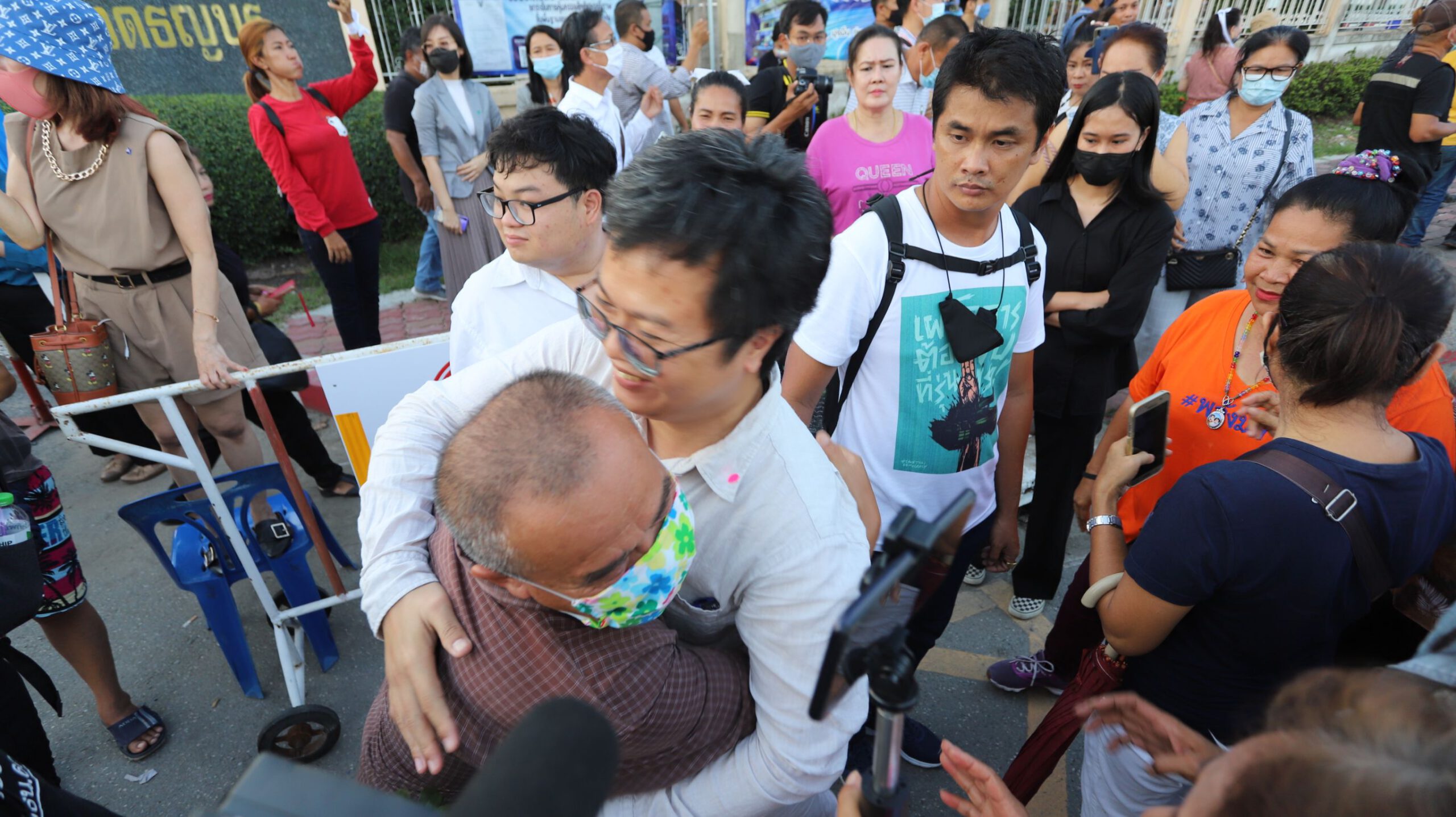 จนกระทั่งเวลา 17.40 น. นายอานนท์ นำภา และ นายภานุพงศ์ จาดนอก ได้เดินทางออกมาพบกับมวลชนที่มาปักหลักรอให้กำลังใจ เมื่อมวลชนเห็นทั้งสองต่างพากันโฮ่ร้องด้วยความดีใจ และบางคนโผลเข้าไปกอดพร้อมทั้งมอบดอกไว้ให้