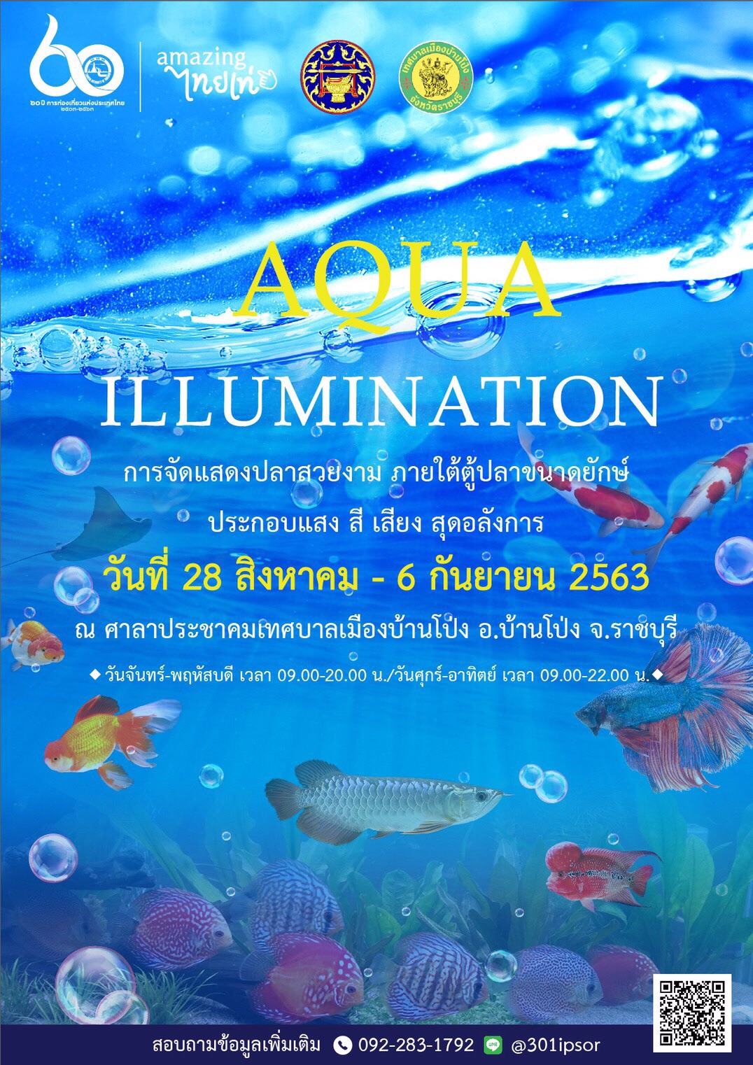 วันที่ 25 สิงหาคม 2563 นางสาวสรียา บุญมาก ผู้อำนวยการ ททท. สำนักงานราชบุรี เปิดเผยว่า การท่องเที่ยวแห่งประเทศไทย (ททท.) ร่วมกับจังหวัดราชบุรี เทศบาลเมืองบ้านโป่ง และภาคเอกชน จัดงาน AQUA ILLUMINATION ขึ้นระหว่างวันที่ 28 สิงหาคม ถึง 6 กันยายน 2563 ระหว่างเวลา 09.00 – 20.00 น. (วันศุกร์ เสาร์ และอาทิตย์ เปิดถึง 22.00 น.) ณ ศาลาประชาคมเทศบาลเมืองบ้านโป่ง (ชั้น 2) อ. บ้านโป่ง จ. ราชบุรี เพื่อกระตุ้นการเดินทางท่องเที่ยวของจังหวัดราชบุรีภายหลังสถานการณ์การแพร่ระบาดของเชื้อ Covid-19 และส่งเสริมการท่องเที่ยวในช่วง Green Season ซึ่งเป็นการเดินทางท่องเที่ยวระยะใกล้ภายใต้คอนเซป “คิด..แล้วไปให้ถึง” ไปให้ถึงจังหวัดราชบุรี โดยได้นำศักยภาพของบ้านโป่งที่มีพื้นที่เพาะเลี้ยงปลาสวยงามมากที่สุดในประเทศไทยและเป็นศูนย์กลางจำหน่ายปลาสวยงามพื้นที่ใหญ่สุดในเอเชียมาต่อยอดขยายผลเป็นกิจกรรมท่องเที่ยวในลักษณะ Art Aquarium การแสดงปลาสวยงามภายใต้ตู้ปลาขนาดยักษ์และขนาดเล็กใหญ่รูปทรงแปลกตา สาดส่องด้วยแสงไฟหลากสีอย่างอลังการ เป็นการผสมผสานกันระหว่างศิลปะ – ออกแบบ – ความบันเทิง – อะควาเรียม ที่ให้ความรู้สึกชวนพิศวงแต่สวยงาม พร้อมดนตรีบรรเลงเคล้าคลอทำให้ได้สัมผัสความงามในหลากหลายมิติ ออกแบบบรรยากาศงานโดยศิลปินนักออกแบบจัดดอกไม้ชั้นนำของเอเชีย สกุล อินทกุล ซึ่งมีชื่อเสียงในการเสนอแนวคิดเชิงปรัชญาตะวันออกผ่านศิลปะการจัดวางดอกไม้ (Flower Installation) ที่เน้นผิวสัมผัสและองค์ประกอบที่งดงาม ดูน่าตื่นตาตื่นใจเช่นเดียวกับงานประติมากรรม และใช้นวัตกรรมมัลติมีเดียโชว์แสงสีคุณภาพระดับสากลโดยทีม Digital Art ฝีมือเด็กไทยล้วน