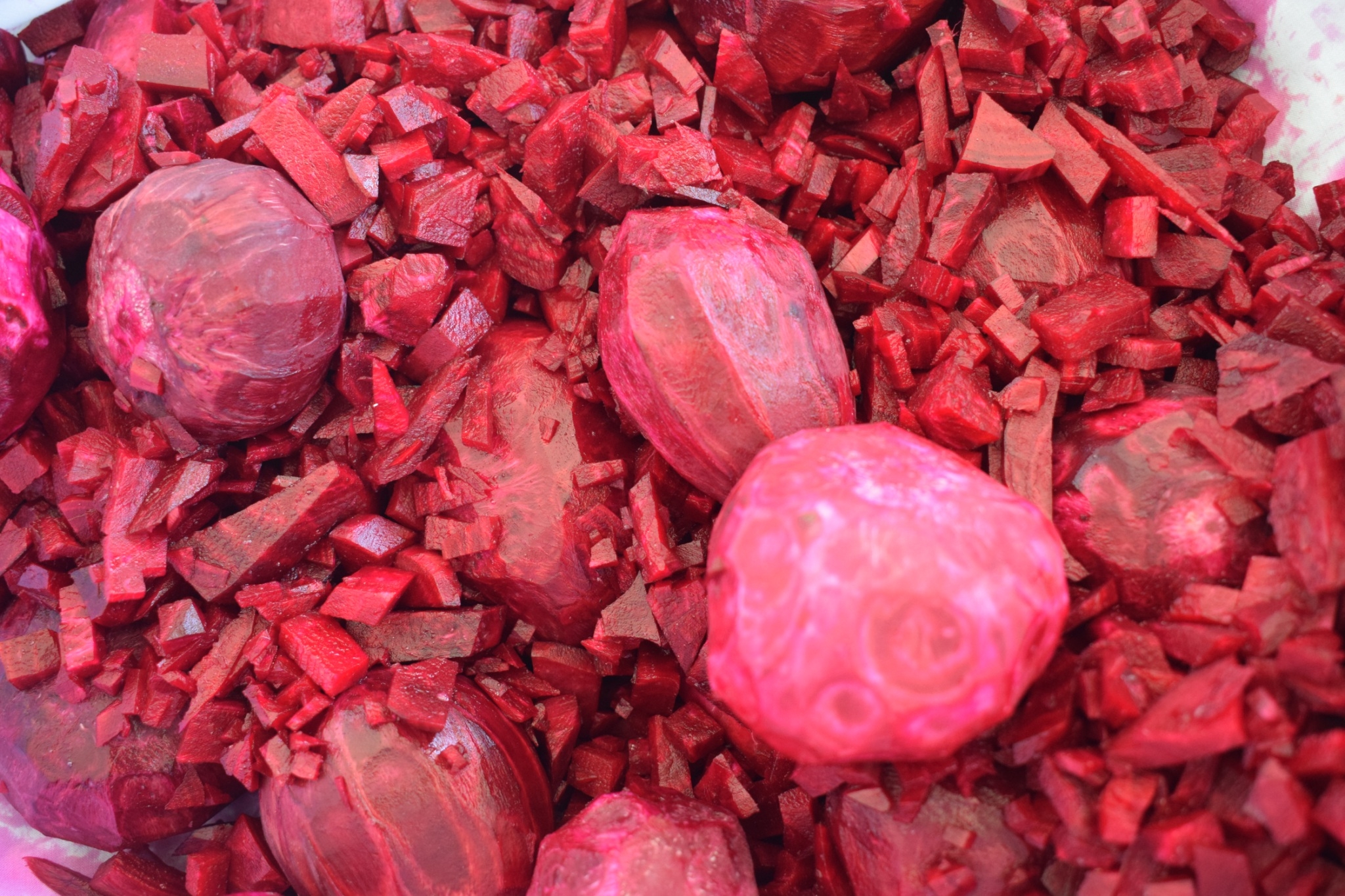 โดย สีเหลืองที่ได้จากขมิ้น สีชมพูที่ได้จากผลบีทรูท สีน้ำตาลจากเปลือกของลูกจาก สีม่วงจากเปลือกมังคุด สีน้ำเงินได้จากอัญชัน สีเขียวได้จากใบเตยและใบกระเพรา ผ่านกรบวนการนำวัสดุจากธรรมชาติแต่ละชนิดมาทุบหรือทำให้เป็นชิ้นเล็กๆก่อนจะนำไปต้มในน้ำร้อนเพื่อให้เกิดสีที่ต้องการ โดยมีส่วนผสมอื่นๆที่มีคุณสมบัติให้ผ้านบาติกมีความสวยงามมากขึ้น คือ ส่วนมะขาม ปูนขาว ปูนแดง เกลือ สารส้ม และน้ำมาเป็นสารกระตุ้น ส่วนผ้าที่ใช้ คือ ผ้ามัสลิน จากนั้นนำผ้าที่มัดด้วยไม้ไอศกรีม ลูกแก้ว หรือการพับผ้าด้วยวิธีต่างๆ ผูกด้วยหนังยาง ซึ่งทำให้เกิดเป็นริ้วรอยในรูปแบบต่างๆก่อนจะนำลงไปแช่ในน้ำสีที่เตรียมไว้ ทำให้ผ้ามัดย้อมมีสีสันสวยงาม และมีลวดลายที่แตกต่างกัน