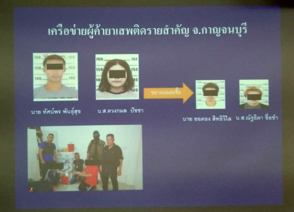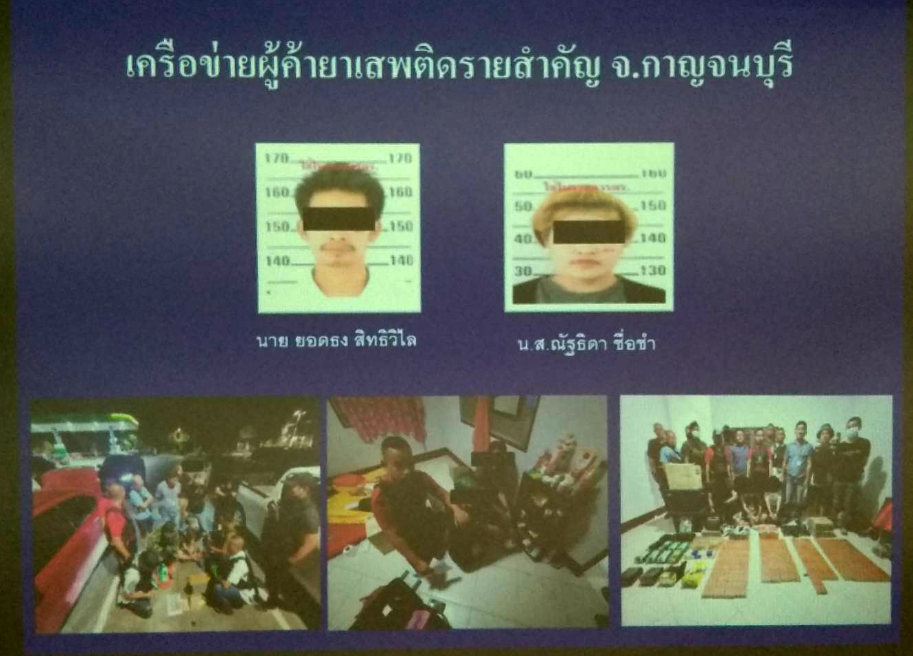 ผู้ต้องหารายที่ 1.นายทัศน์พร หรือโย 28 ปี น.ส.ดวงกมล หรือโมส อายุ 23 ปี จับได้ที่ร้านขายของชำหน้าศาลเจ้าหลักเมืองสุพรรณบุรี อ.เมืองสุพรรณบุรี ของกลาง เคตามีน 1.6 กิโลกรัม กัญชาแห้ง 59 กรัม ปืนพกสั้น 1 กระบอก กระสุน 30 นัด ยึดทองรูปพรรณ หลายรายการ ขยายผลจับกุมผู้ต้องหารายที่ 2.นายทรงกลด หรือตูม หรือดำ อายุ 27 ปี จับกุมได้ที่หมู่บ้านแห่งหนึ่งใน อ.เมืองสุพรรณบุรี ของกลางเคตามีน 260 กรัม และรายที่3. สอบสวนขยายผลจับกุมตัวนายยอดธง หรือต๋อง อายุ 28 ปี น.ส.ณัฐธิดา หรือดรีม อายุ 24 ปี จับกุมได้ที่บ้านพัก ต.ท่ามะขาม อ.เมือง จ.กาญจนบุรี ของกลางเคตามีน 5 กิโลกรัม เฮโรอีน 105 แท่ง น้ำหนัก 39 กิโลกรัมไอซ์ 4 กิโลกรัม ยาบ้า 17 มัดประมาณ 34,000 เม็ด