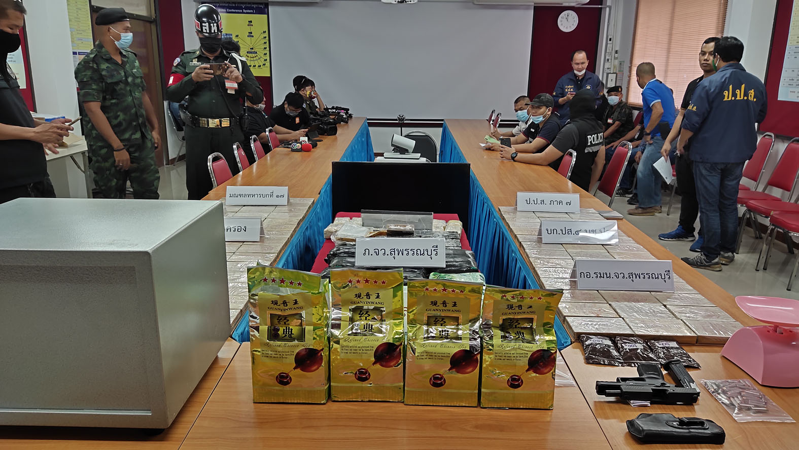 ที่ จ.สุพรรณบุรี พล.ต.ต.นิธิธร จินตกานนท์ ผบก.ภ.จว.สุพรรณบุรี พล.ต.ต.วุฒิพษ์ นาวิน ผบก.ปราบปรามยาเสพติด 4 นายธนากร คัยนันท์ ผอ.สำนักงานป้องกันและปราบปรามยาเสพติดภาค 7 พ.ต.อ ธนเดช ตันติอาภา รอง ผบก.ภ.จว.สุพรรณบุรี พ.ต.อ.ยุทธนา พฤกษารุ่งเรือง ผู้กำกับการ 1 กองบังคับการตำรวจปราบปรามยาเสพติด 4 พ.อ.กุญช์ภัสร์ หาญสมบูรณ์ รองเสนาธิการมณฑกหารบกที่ 17 พ.อ.เสน่ห์ บำรุงกิจ รอง กอ.รมน.จว.สุพรรณบุรี ร่วมกันแถงข่าวกรณีตำรวจภูธรจังหวัดสุพรรณบุรี โดยชุดปราบปรามยาเสพติดชุดที่ 2 ศูนย์อำนวยการป้องกันและปราบปรามยาเสพติด ตำรวจภูธรจังหวัดสุพรรณบุรี ร่วมกับ เจ้าหน้าที่ตำรวจกองบังคับการตำรวจปราบปรามยาเสพติด 4 เจ้าหน้าที่ทหารมณฑลทหารบกที่ 17 กำลังชุดป้องกันและปราบปรามยาเสพติด ภาค 7 ร่วมกันจับกุมแก๊งค้ายาเสพติดรายใหญ่ ได้ผู้ต้องหา 3 ราย จำนวน 5 คน ของกลางยาเสพติดและทรัพย์สินจำนวนมาก
