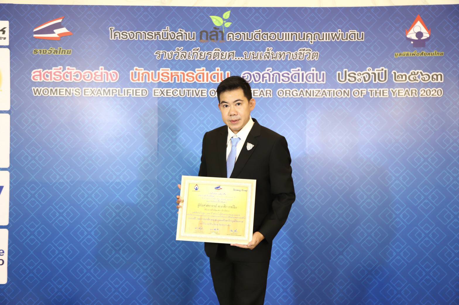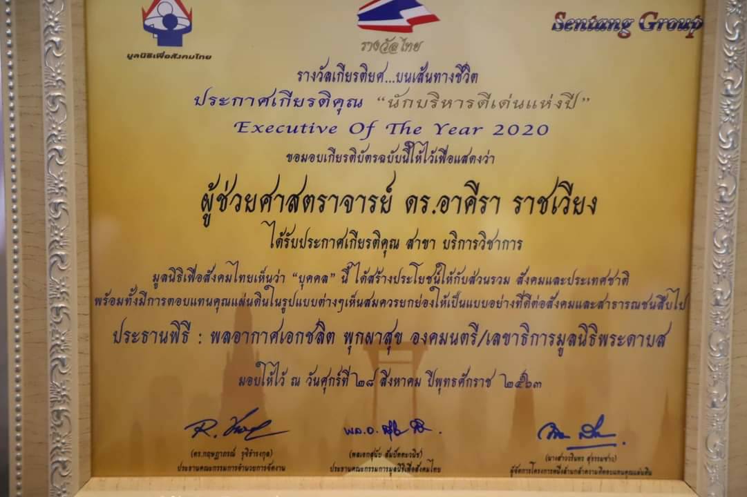 เข้ารับโล่ประธาน นักบริหารดีเด่นแห่งปี Executive of the year 2020 สาขาบริการวิชาการ จากพลอากาศเอกชลิต พุกผาสุข องคมนตรี เลขาธิการมูลนิธิพระดาบส ในงาน “หนึ่งล้านกล้าความดีตอบแทนคุณแผ่นดิน