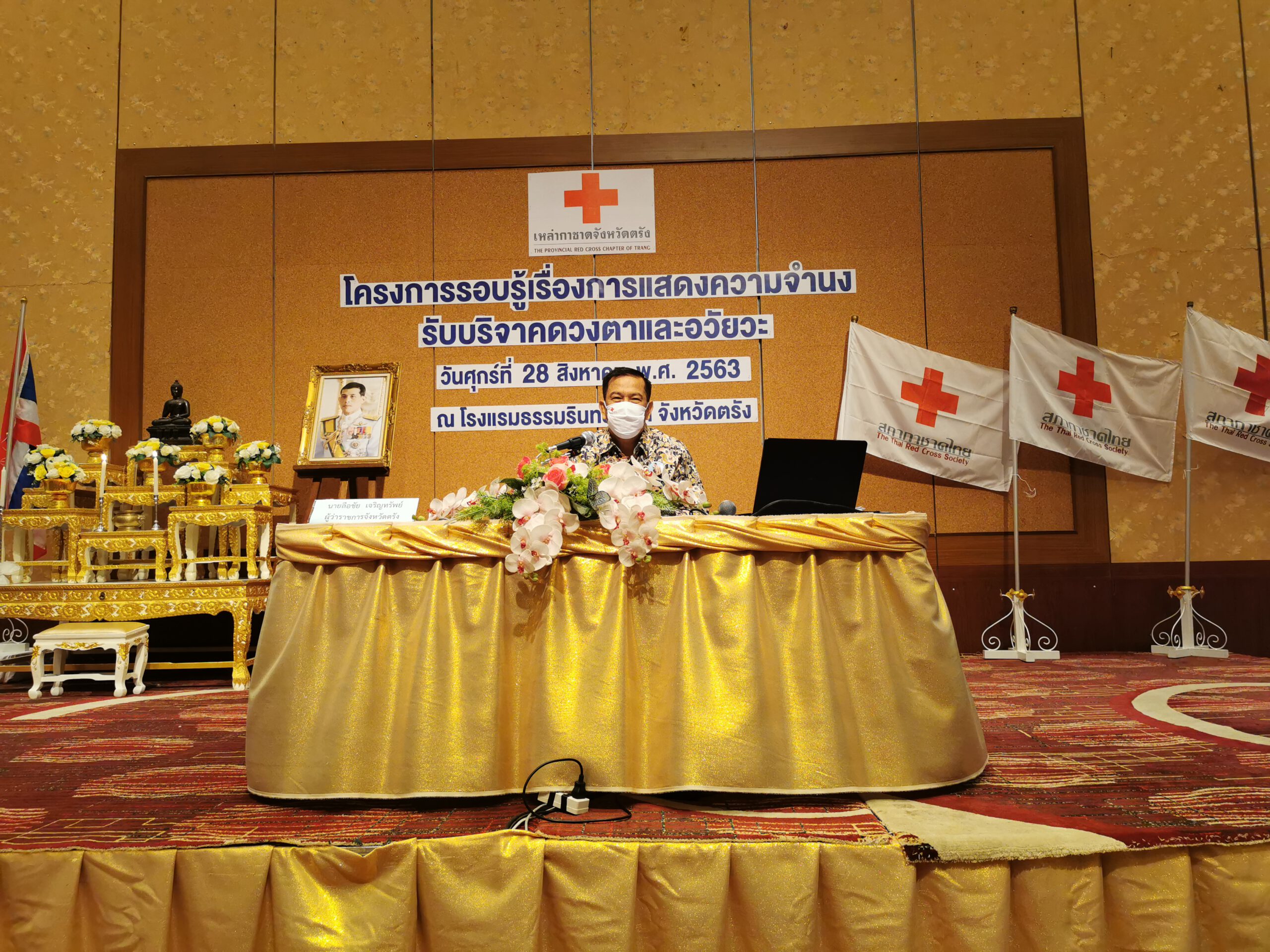 สำหรับการฝึกอบรมโครงการรอบรู้เรื่องการแสดงความจำนงรับบริจาคดวงตาและอวัยวะ ประจำปี ๒๕๖๓ เหล่ากาชาดจังหวัดตรังในวันนี้ เป็นกิจกรรมหนึ่งในอันที่จะจัดหาผู้ช่วยปฏิบัติงานและพัฒนาเพิ่มพูนความรู้แก่เจ้าหน้าที่และผู้ปฏิบัติงาน เพื่อให้ความรู้เกี่ยวกับการบริจาคดวงตาและอวัยวะ ได้มีการแพร่หลายไปในชุมชนต่าง ๆ และมีผู้ประสงค์ที่จะบริจาคดวงตาและอวัยวะเพิ่มมากขึ้น