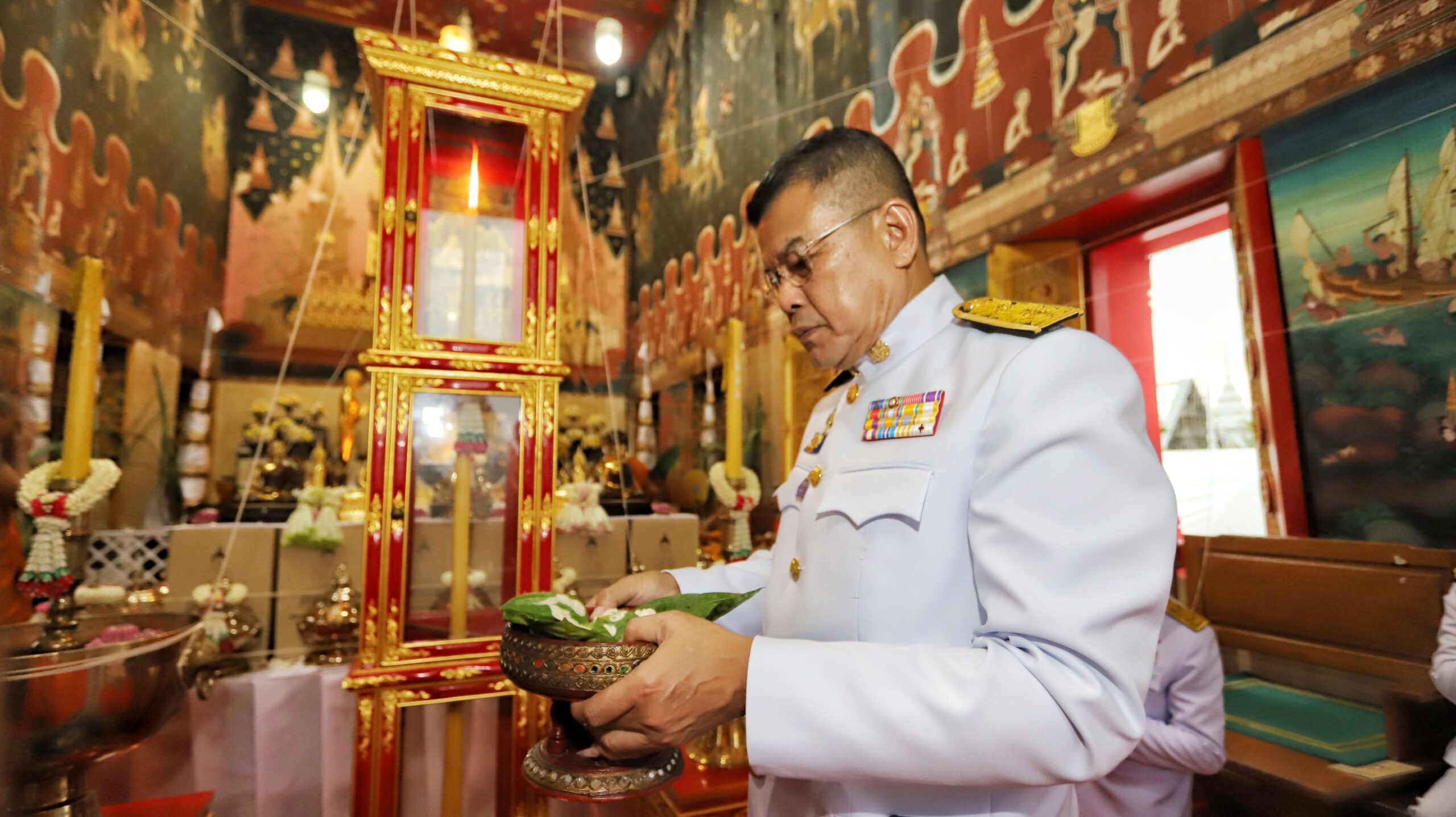 สำหรับในพิธีท่านเจ้าประคุณ สมเด็จพระมหาวีรวงศ์ (สุชิน อคฺคชิโน) ผู้ช่วยเจ้าอาวาสวัดราชบพิธสถิตมหาสีมารามราชวรวิหารและเลขานุการสมเด็จพระสังฆราชประธานสงฆ์ เจิมและจุดเทียนชัยพิธีพุทธาภิเษก พระสงฆ์เจริญพระพุทธมนต์ และธัมมจักกัปปวัตนสูตร ประพรมน้ำพระพุธมนต์ โปรยข้าวตอกดอกไม้