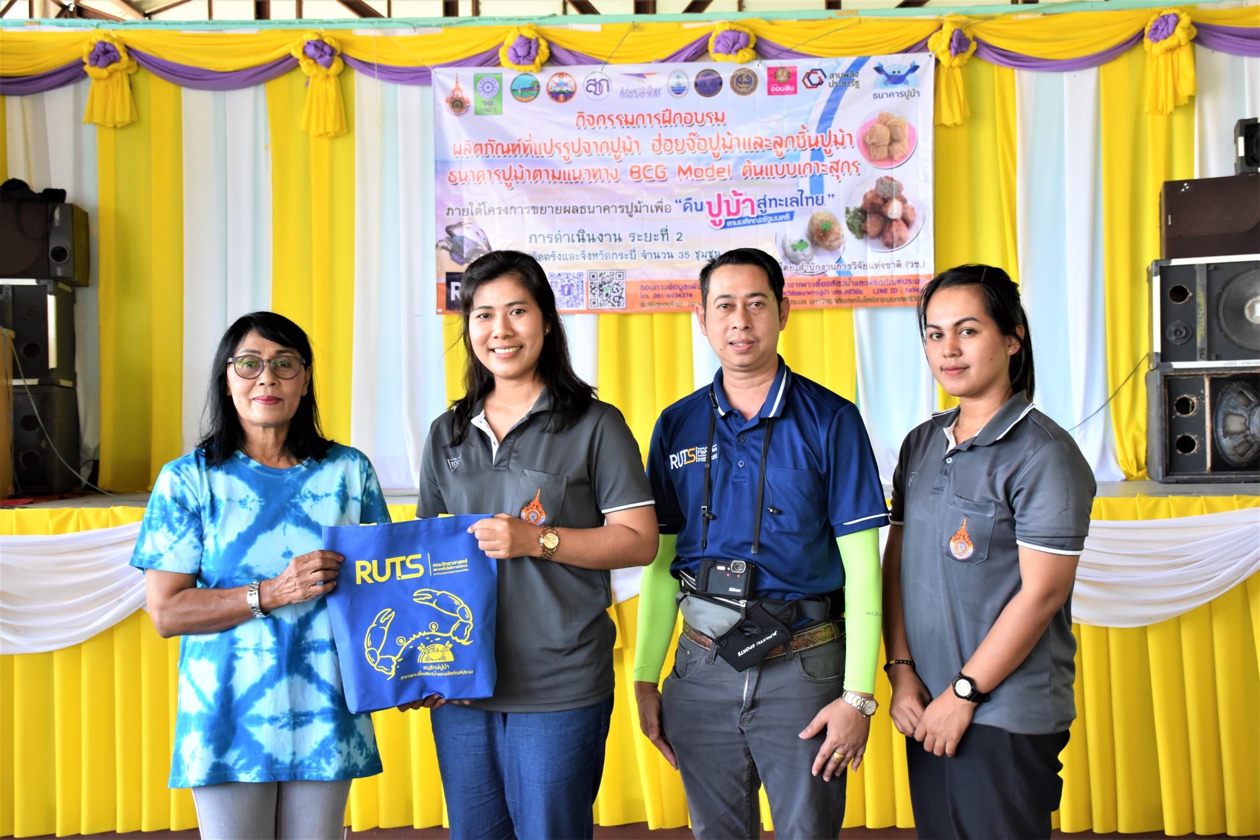 ดร.วิกิจ ผินรับ รองผู้อำนวยการสถาบันวิจัยและพัฒนา มทร.ศรีวิชัย ในนามหัวหน้าโครงการธนาคารปูม้า มทร.ศรีวิชัย อาจารย์ประจำสาขาเพาะเลี้ยงสัตว์น้ำและผลิตภัณฑ์ประมง คณะวิทยาศาสตร์และเทคโนโลยีการประมง ลงพื้นที่เกาะสุกร จัดกิจกรรมการฝึกอบรมผลิตภัณฑ์ที่แปรรูปจากปูม้า ลูกชิ้นปูม้าและปูจ๊อ ตราแตงโมเกาะสุกร ตามแนวทาง BCG Model ต้นแบบเกาะสุกร โดยได้รับทุนสนับสนุนจากสำนักงานการวิจัยแห่งชาติ (วช.) ภายใต้ “โครงการการจัดการและส่งเสริมธนาคารปูม้าแบบมีส่วนร่วมเพื่อสร้างคุณภาพชีวิตที่ดีของชุมชนในจังหวัดตรังและกระบี่ ระยะที่ 2” โดยมี นางราตรี จิตรหลัง นายกองค์การบริหารส่วนตำบลเกาะสุกรมา เป็นประธานในพิธีเปิดโครงการ ณ ลานกิจกรรม องค์การบริหารส่วนตำบลเกาะสุกร อ.ปะเหลียน จ.ตรัง พร้อมด้วยกลุ่มเป้าหมายคือสมาชิกธนาคารปูม้า จำนวน 20 ท่านเข้าร่วมรับการอบรม ทั้งนี้ โครงการธนาคารปูม้า มทร.ศรีวิชัย ได้นำอุปกรณ์ต่างๆที่ใช้สำหรับแปรรูป เช่น เครื่องซีทสูญญากาศ ฟองเต้าหู้สำหรับห่อปูจ๊อ หม้อ กระทะ เครื่องชั่ง เป็นต้น มอบให้กับชุมชนจำนวน 3 ชุด เพื่อสานต่อกิจกรรมการถ่ายทอดที่ทางวิทยากรอบรมให้