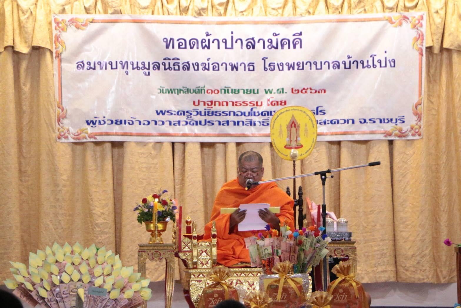 โรงพยาบาลบ้านโป่ง และคณะสงฆ์อำเภอบ้านโป่ง ร่วมจัด “ทอดผ้าป่าสามัคคีประจำปี 2563” เพื่อสมทบทุนมูลนิธิสงฆ์อาพาธโรงพยาบาลบ้านโป่ง โดยมี พระครูศรีธรรมนาท เจ้าคณะอำเภอบ้านโป่ง เป็นประธานฝ่ายสงฆ์ นายยุทธพร พิรุณสาร นายอำเภอบ้านโป่ง ประธานฝ่ายฆราวาส แสดงพระธรรมเทศนา