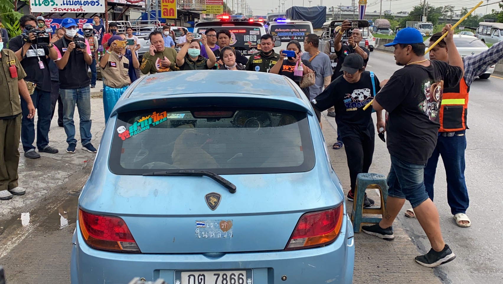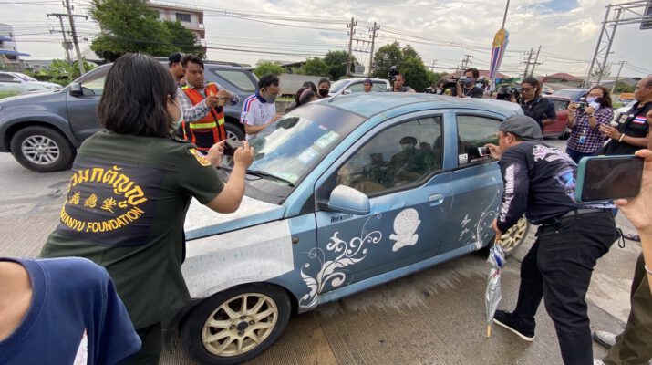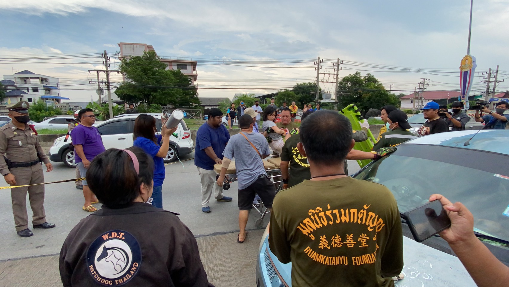 ทางด้านนายพัฒนศักดิ์ ใยขม อาสาสมัครมูลนิธิร่วมกตัญญู เปิดเผยว่า ตนเองได้รับแจ้งจากตำรวจว่ามีคนนอนหมดสติภายในรถเมื่อมาตรวจสอบก็ไปเคาะกระจกพบว่าหญิงดังกล่าวไม่หมดสติ และในรถมีสุนัขอยู่ 3 ตัว เมื่อมีคนเข้าไปใกล้สุนัขจะเห่าตลอดเวลา ล่าสุดยังคงรอญาติเพื่อที่จะเข้าเจรจรเพื่อเคลื่อนย้ายรถและสุนัขออกจากผิวการจราจร