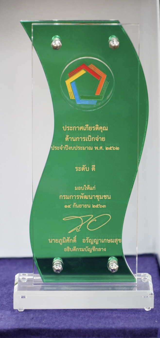 รางวัลที่ 2 เป็นรางวัลประกาศเกียรติคุณด้านการเบิกจ่าย ระดับดี กรมการพัฒนาชุมชน ตระหนักถึงความสำคัญในประโยชน์และคุณภาพชีวิตที่ดีขึ้นของประชาชนในพื้นที่ชุมชน/หมู่บ้าน/ตำบลทั่วประเทศ ที่จะได้รับจากการเร่งรัดเบิกจ่ายงบประมาณ ในความรับผิดชอบของกรมการพัฒนาชุมชนให้เป็นไปตามเป้าหมาย เพื่อแก้ไขปัญหาความเดือดร้อนและสามารถที่จะบูรณาการเชื่อมโยงการทำงานร่วมกับหน่วยงานต่าง ๆ ในเวลาเดียวกันเพื่อพัฒนาความเจริญให้เกิดขึ้นอย่างทันต่อสถานการณ์ ในเวลาที่เหมาะสม รวมทั้งความสำคัญของการบริหารการเบิกจ่ายงบประมาณซึ่งเป็นเครื่องมือบริหารความสำเร็จของรัฐบาลให้สามารถขับเคลื่อนนโยบายได้ตามเป้าหมายที่สัญญาไว้กับประชาชนและที่แถลงต่อรัฐสภา เพราะเป็นปัจจัยสนับสนุน การขยายตัวทางเศรษฐกิจของประเทศจากเม็ดเงินที่ใช้จ่ายไปพัฒนาท้องถิ่นชุมชนในรูปแบบต่าง ๆ ช่วยกระตุ้นการหมุนเวียนของกลไกในระบบเศรษฐกิจฐานรากซึ่งส่งผลกระทบในวงกว้างต่อความเจริญเติบโตและเสถียรภาพทางเศรษฐกิจ รวมทั้งลดเงื่อนไขและปัญหาทางสังคมของประเทศ ในภาพรวม การได้รับรางวัลในครั้งนี้ยังเป็นผลมาจากความร่วมมือร่วมใจกันของบุคลากรในสังกัด ทุกระดับด้วย จึงรู้สึกเป็นเกียรติและภาคภูมิใจที่กรมการพัฒนาชุมชนสามารถบริหารจัดการด้านการเงินการคลังได้อย่างมีประสิทธิภาพ ได้ช่วยเหลือประชาชนในพื้นที่และตอบสนองต่อนโยบายรัฐบาลจนได้รับ “รางวัลประกาศเกียรติคุณด้านการเบิกจ่าย ระดับดี” ประจำปีงบประมาณ 2562