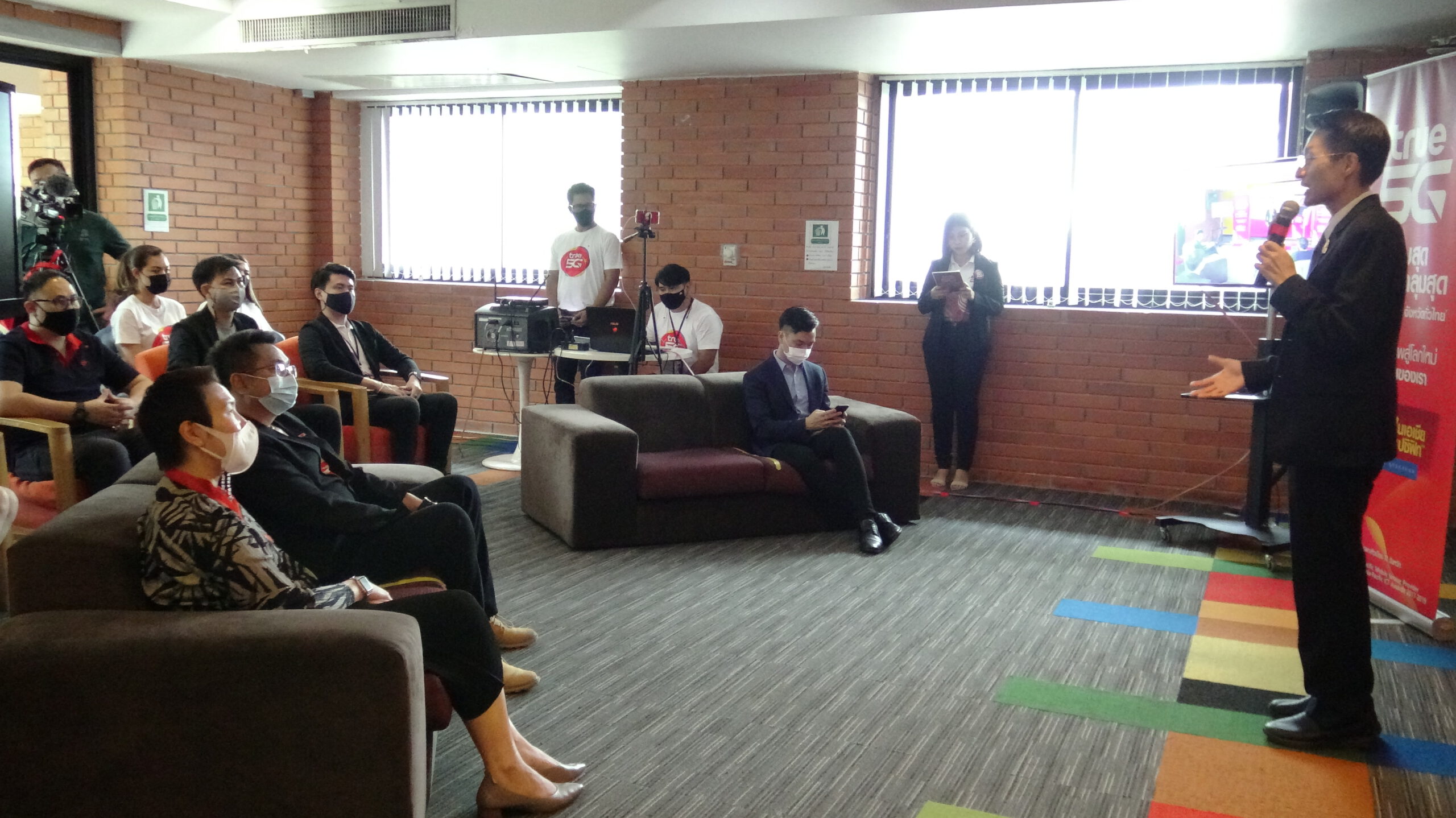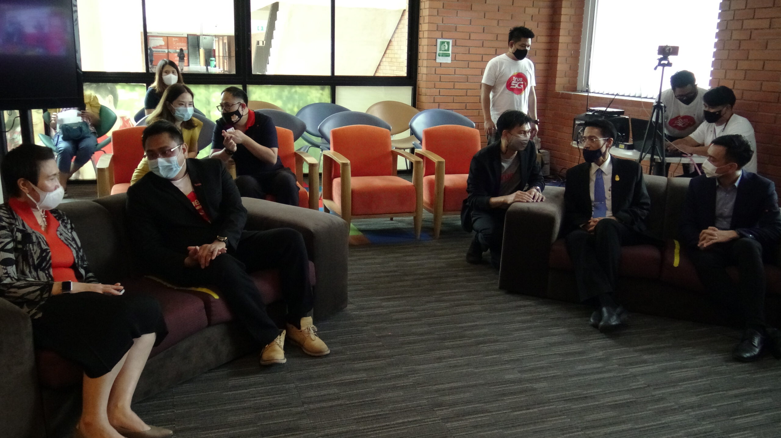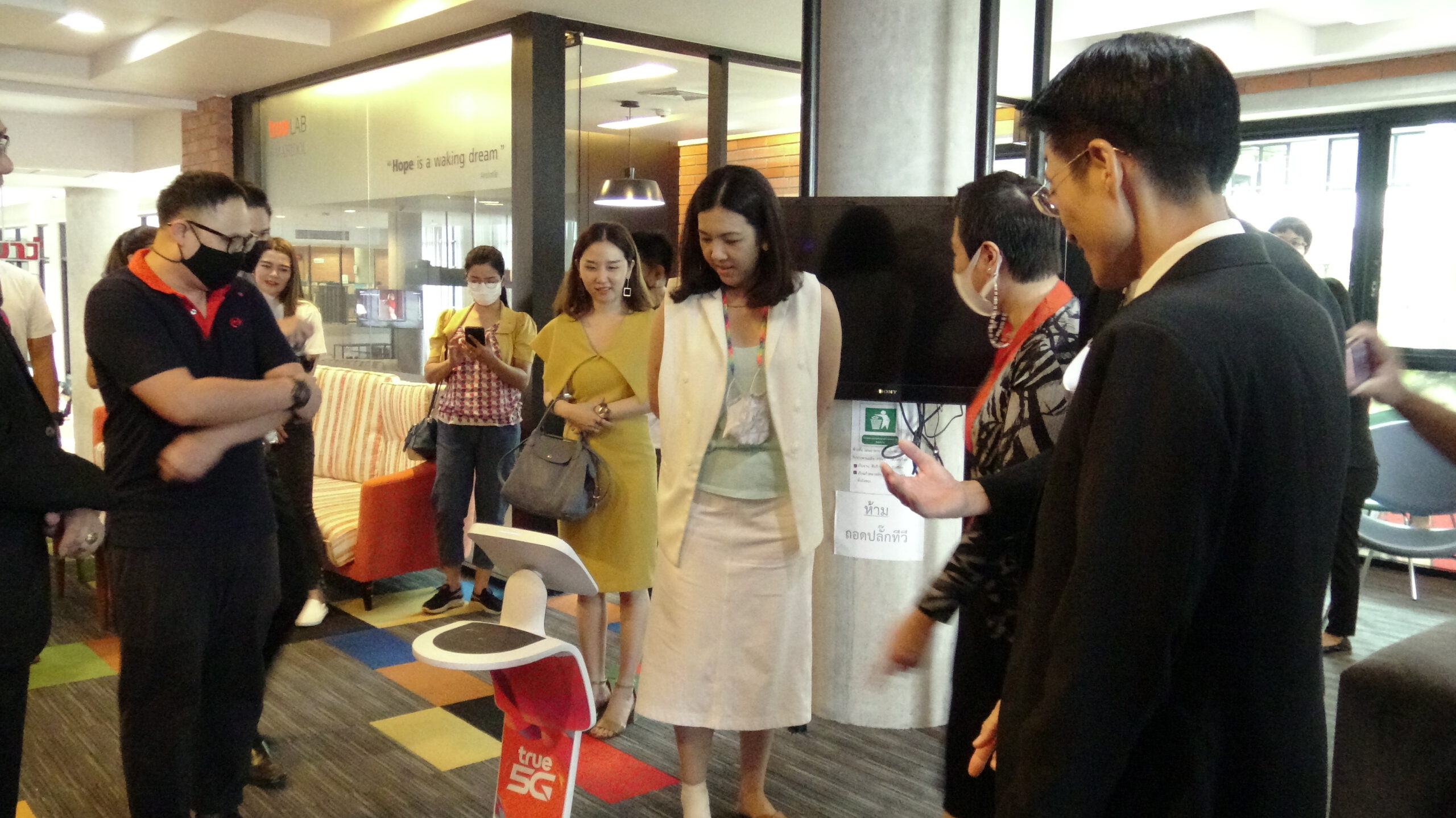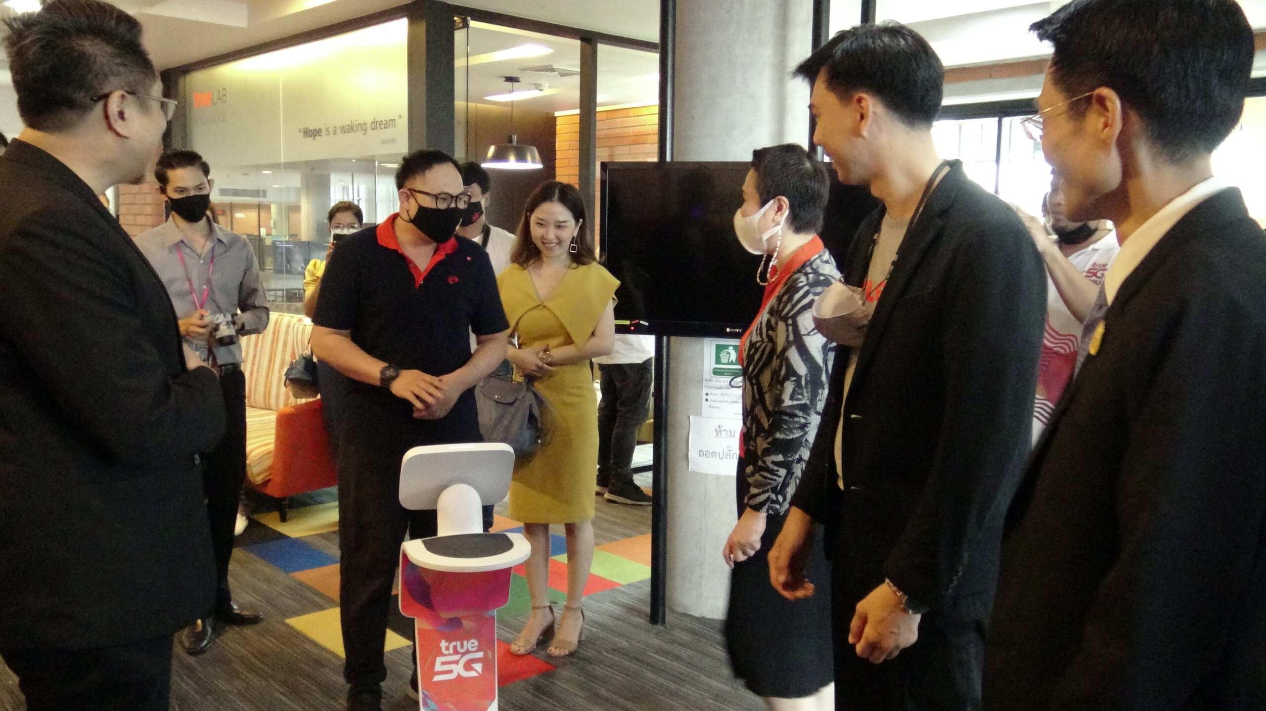 ศาสตราจารย์ ดร. นายแพทย์ ภัทรชัย กีรติสิน ผู้อำนวยการสถาบันบริหารจัดการเทคโนโลยีและนวัตกรรม มหาวิทยาลัยมหิดล ร่วมด้วย ดร.วนรักษ์ ชัยมาโย รองผู้อำนวยการสถาบันบริหารจัดการเทคโนโลยีและนวัตกรรม มหาวิทยาลัยมหิดล นายรัชกฤต กาญจนรุ่งแสง ผู้จัดการทั่วไปเขตภาคตะวันตก บริษัท ทรู คอร์ปอเรชั่น จำกัด (มหาชน) นายสรรควร สัตยมงคล ผู้จัดการฝ่ายพัฒนาธุรกิจ โครงการ True LAB คุณนันทพร เทพเทวิน ผู้ช่วยผู้อำนวยการแผนกการตลาดสาขา เขต1 บริษัท เซ็นทรัลพัฒนา จำกัด (มหาชน) ร่วมรับมอบหุ่นยนต์อัจฉริยะ 5G สู่มหาวิทยาลัยมหิดล มูลค่า 150,000 บาท