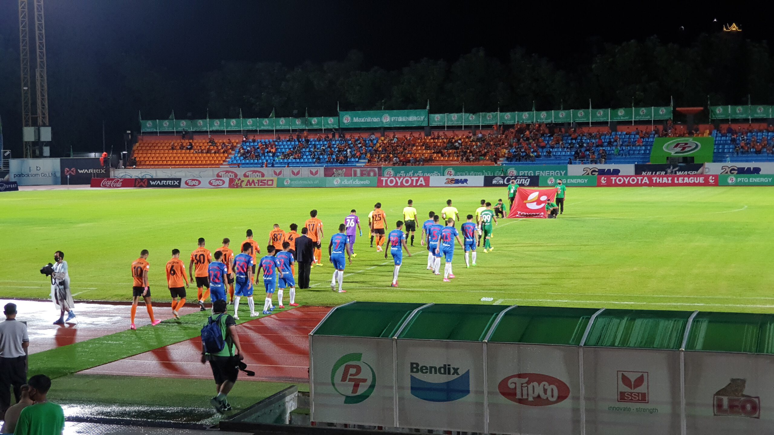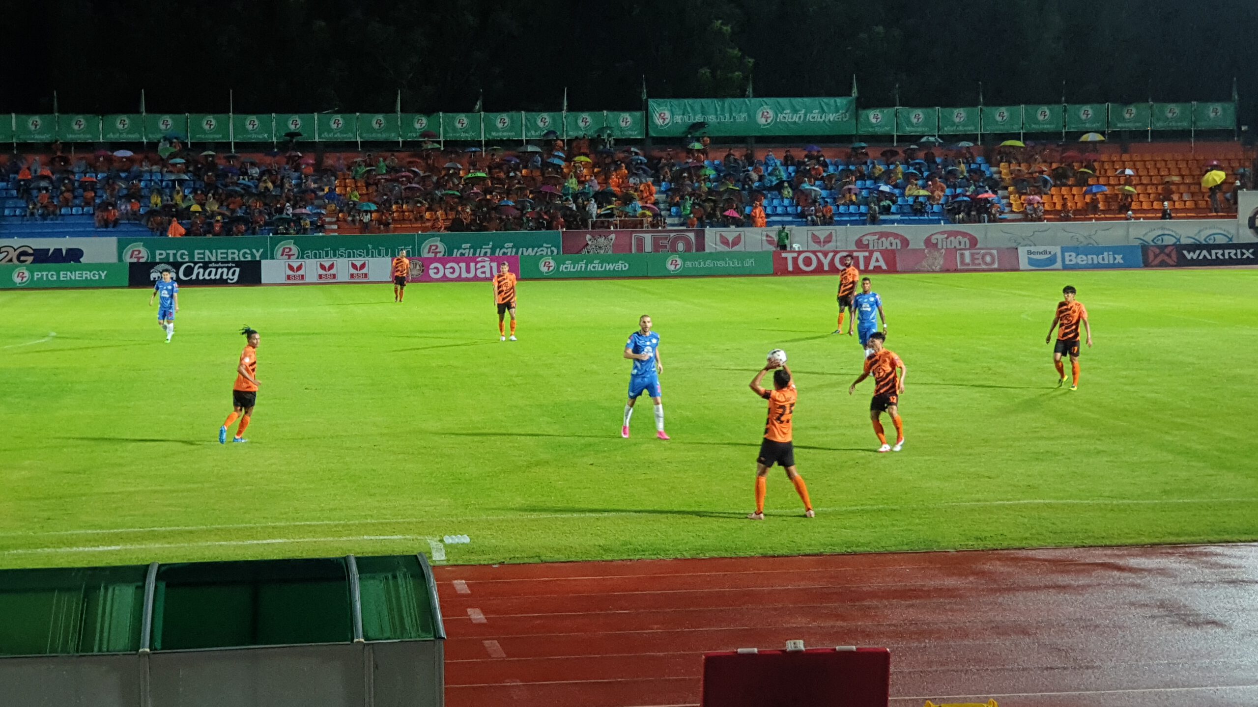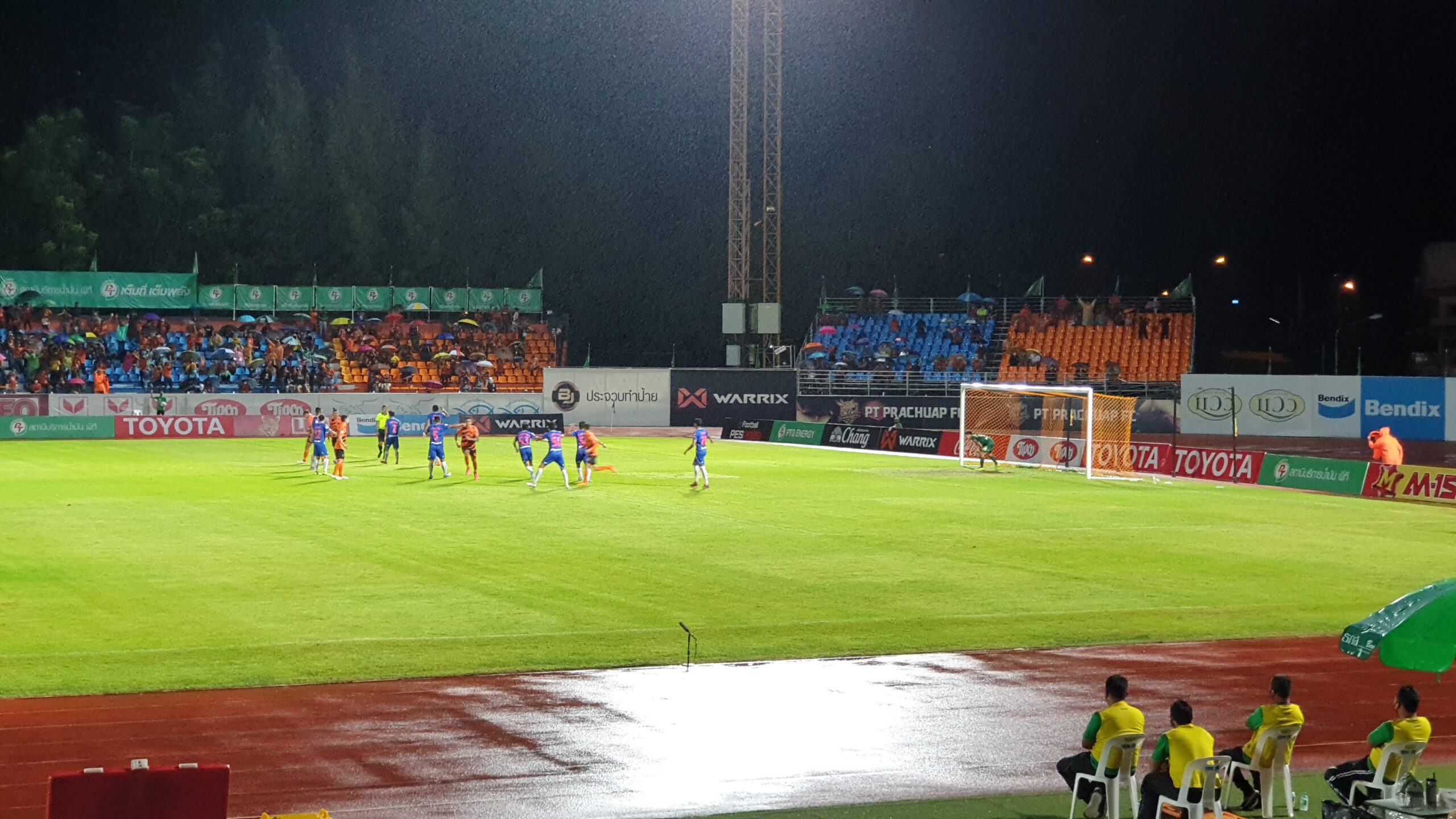 โดยเริ่มออกสตาร์ตเกมท่ามกลางสายฝน พีที ประจวบ เอฟซี เจ้าบ้านเป็นฝ่ายเปิดลูกเดินเกมรุกเข้าใส่ นาทีที่ 9 ก็ได้ลุ้นจากจังหวะลุยของ วิลเลี่ยม เอ็นริเก้ เข้าทางเขตโทษฝั่งขวา ก่อนตัดสินใจยิงมุมแคบแต่บอลเข้าหน้าต่างอย่างน่าเสียดาย นาทีที่ 23 ภานุพงษ์ พลซา ทำฟาวล์ วิลเลี่ยม เอ็นริเก้ ในเขตโทษ ผู้ตัดสิน นที ชูสุวรรณ ปล่อยให้เล่นต่อก่อนจะย้อนมาดูวีเออาร์และให้เป็นจุดโทษ แต่จังหวะจุดโทษ วิลเลี่ยม เอ็นริเก้ ยิงติดเซฟ สินทวีชัย ล้มตัวรับไว้ได้สบาย ก่อนหมดครึ่งแรก ไม่กี่วินาที ศรัณยู อินต๊ะราช เก็บบอลได้หน้ากรอบเขตโทษ ก่อนยิงด้วยซ้าย บอลแฉลบแนวรับชลบุรีออกหลัง ทำให้จบ 45 นาทีเสมอกันอยู่ 0-0 ครึ่งหลังเกมยังสูสี นาทีที่ 57 ชลบุรีได้ลุ้นประตูขึ้นนำ ฉัตรมงคล เรืองฐณโรจน์ เติมมาจากกราบซ้าย เก็บบอลได้ในเขตโทษ ก่อนกดเต็มข้อบอลพุ่งเข้ากรอบ แต่ ขวัญชัย สุขล้อม ยังปัดออกหลังไปได้ นาทีที่ 61 เจ้าบ้านได้ลุ้นอีกครั้ง วิลเลี่ยม เอ็นริเก้ จ่ายให้ วิลเล่น โมต้า ที่หน้าเขตโทษ หาจังหวะปั่นด้วยซ้าย แต่บอลพุ่งตรงตัว สินทวีชัย ล้มตัวรับไว้ได้