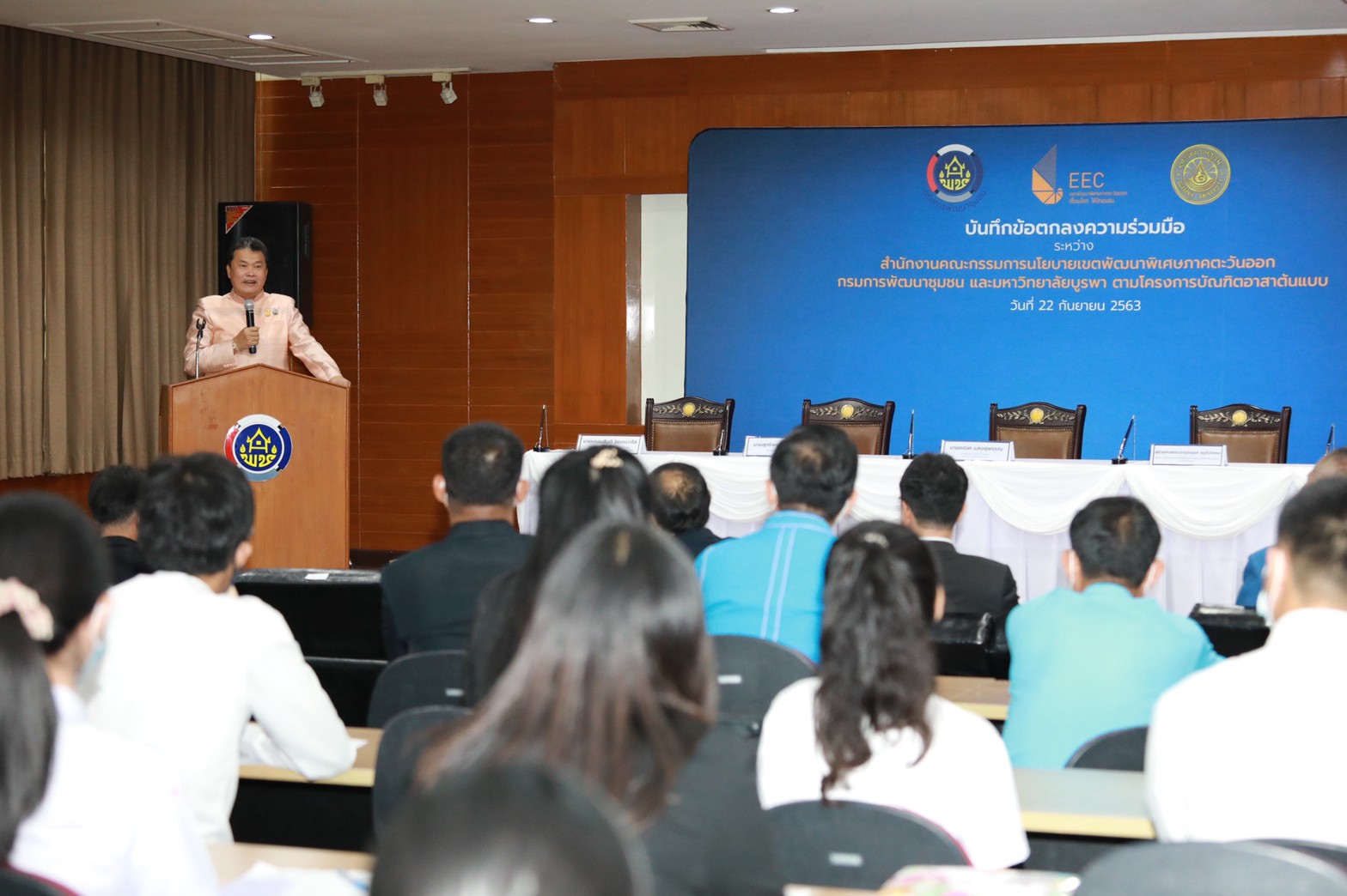 ทั้งนี้ นายสุทธิพงษ์ จุลเจริญ อธิบดีกรมการพัฒนาชุมชน กล่าวว่า รู้สึกเป็นเกียรติอย่างยิ่ง ที่ได้รับความไว้วางใจจาก สำนักงานคณะกรรมการนโยบายเขตพัฒนาพิเศษภาคตะวันออก และมหาวิทยาลัยบูรพา ที่จะร่วมกันสร้างความรับรู้ความเข้าใจของนโยบายภาครัฐในการขับเคลื่อนงานในพื้นที่ชุมชน โดยมีสิ่งสำคัญ 3 ประเด็นดังนี้