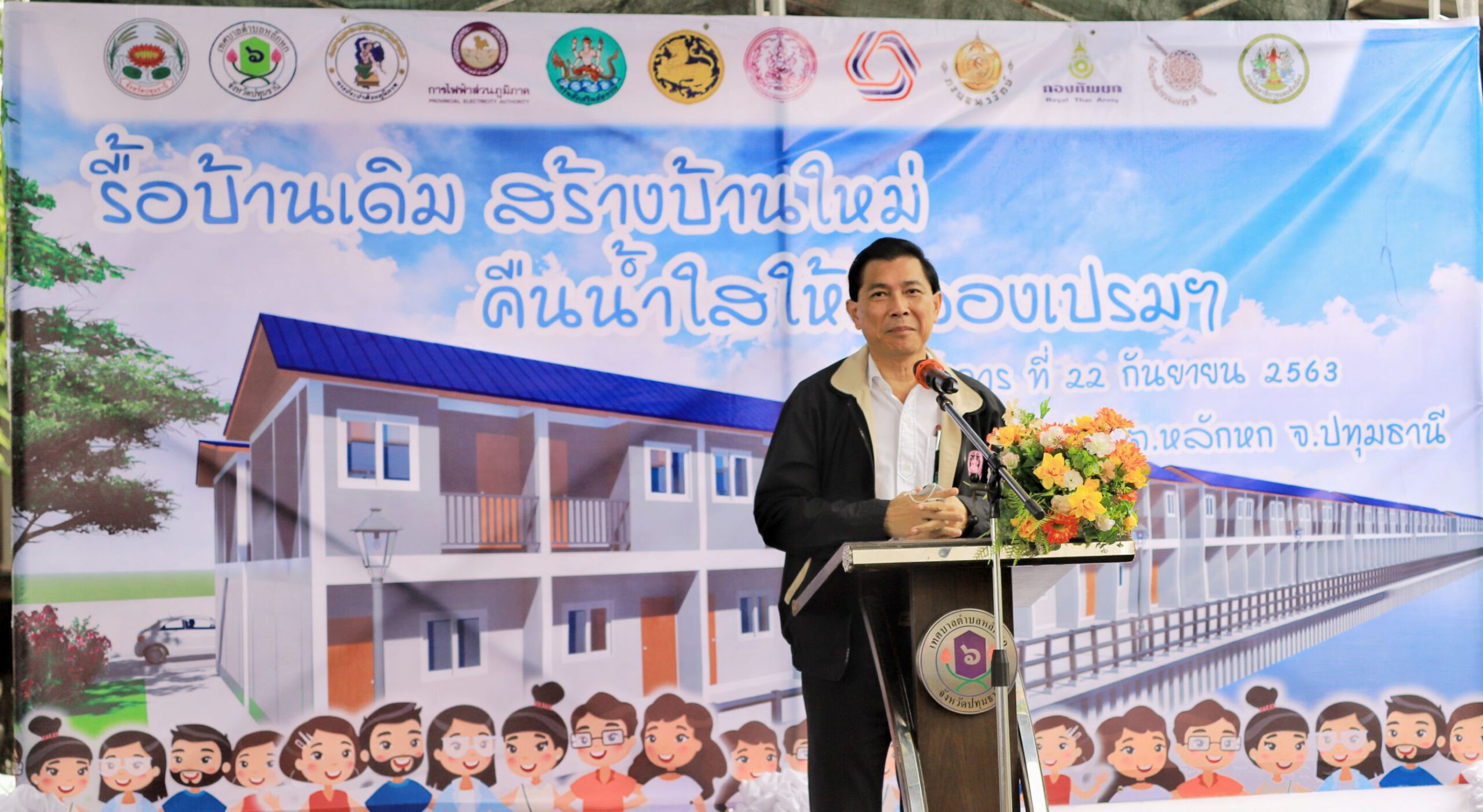 เมื่อเวลา 09.00 น. วันที่ 22 กันยายน 2563 ดร.พินิจ บุญเลิศ ผู้ว่าราชการจังหวัดปทุมธานี นายไมตรี อินทุสุต ประธานกรรมการสถาบันพัฒนาองค์กรชุมชน(องค์การมหาชน) หรือพอช.กระทรวงการพัฒนาสังคมและความมั่นคงของมนุษย์ พันเอก ณัฐพล บุญกระพือ ผู้แทนผู้บัญชาการกองพลทหารม้าที่ 2 รักษาพระองค์ นายสิทธิชัย สวัสดิ์แสน ปลัดจังหวัดปทุมธานี นายอาวุธ วิเชียรฉาย นายอำเภอเมืองปทุมธานีนางสาวบุษนี แพร่วิศวกิจ โยธาธิการและผังเมืองจังหวัดปทุมธานี และหน่วยงานที่เกี่ยวข้อง ร่วมกัน จัดกิจกรรม “รื้อบ้านเดิม สร้างบ้านใหม่ คืนน้ำใสให้คลองเปรมประชากร” ณ หมู่ที่ 7 ตำบลหลักหก อำเภอเมือง จังหวัดปทุมธานี โดยมีผู้แทนกรมทหารม้าที่ 5 กองพลทหารม้าที่ 2 รักษาพระองค์ ผู้แทนกรมธนารักษ์ ผู้แทนสหกรณ์จังหวัดปทุมธานี ชาวชุมชนริมคลองเปรมประชากร และภาคีเครือข่ายพัฒนาชุมชนริมคลองเข้าร่วมงานประมาณ 200 คน