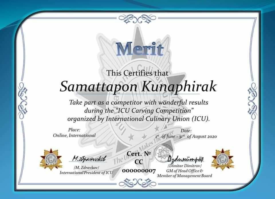 จนได้รับใบประกาศนียบัตรรวมถึงเป็นสมาชิกกับทีม ICU ของประเทศอังกฤษ ในการเผยแพร่ผลงานงานแกะสลักผักและผลไม้ในครั้งนี้