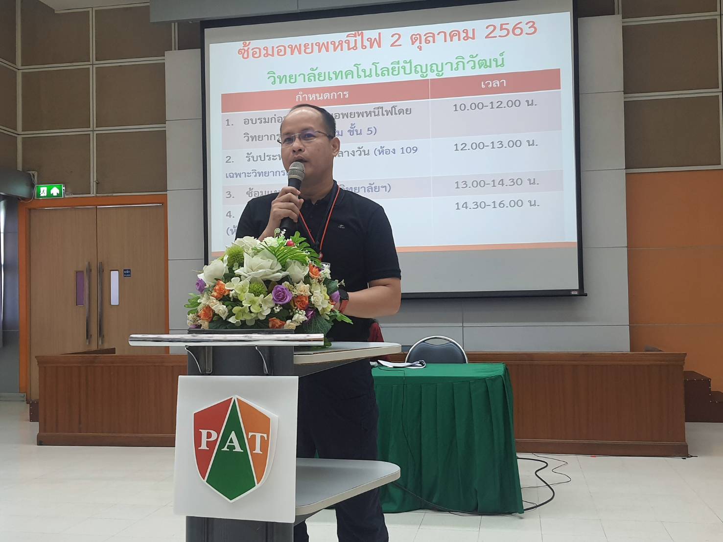 ที่วิทยาลัยเทคโนโลยีปัญญาภิวัฒน์ อ.เมือง จ.นนทบุรี ว่าที่ ร.ต.วรเชษฐ์ ธรรมวงศ์ ผู้อำนวยการสำนักวิชาการและผู้อำนวยการดับเพลิง วิทยาลัยเทคโนโลยีปัญญาภิวัฒน์ เป็นประธานในพิธีเปิดโครงการอพยพซ้อมหนีไฟประจำปี2563 โดยมีนักเรียน นักศึกษา บุคลากรของวิทยาลัยร่วมการฝึกซ้อมในทุกขั้นตอน โอกาสนี้ ว่าที่ ร.ต.วรเชษฐ์ ธรรมวงศ์ กล่าวว่าวิทยาลัยมีนโยบายให้ความสําคัญต่อความปลอดภัยในสถานศึกษา เนื่องจากเป็นสถานที่ที่มีนักเรียน นักศึกษา และบุคลากรที่ปฏิบัติงานร่วมกันเป็นจำนวนมาก การป้องกันและการเตรียมพร้อมจึงเป็นสิ่งสำคัญไม่ให้เกิดการสูญเสียชีวิตและทรัพย์สินต่างๆ