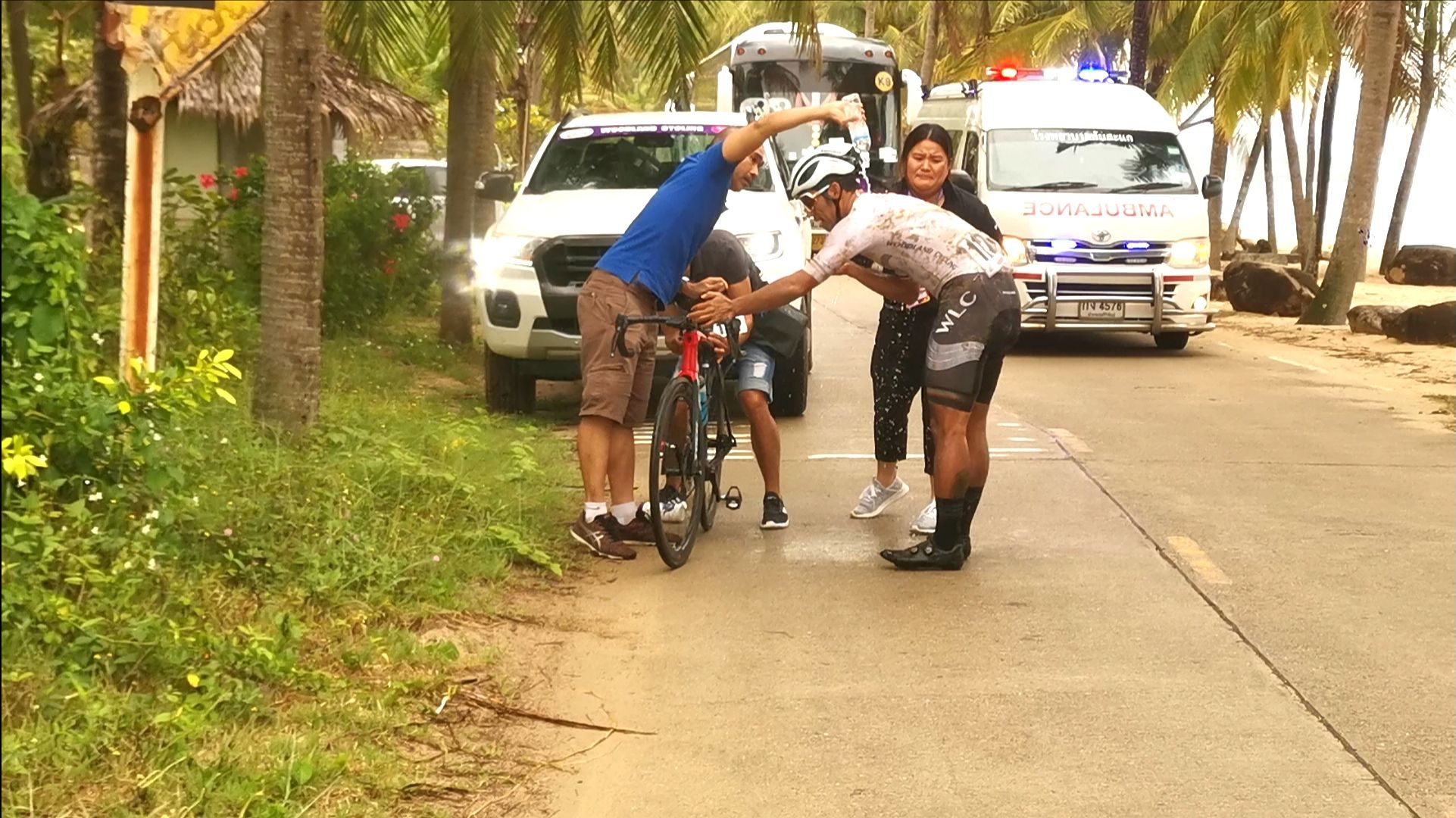 อย่างไรก็ดีในขณะที่ขบวนจักรยานได้วิ่งมาตามถนนเพชรเกษม และเลี้ยวซ้ายช่วง บ้านอ่างทอง วิ่งเข้าชายทะเลบ้านกรูด เลี้ยวซ้ายลงชายหาดทะเล ได้มีจักรยานผู้เข้าแข่งขันจำนวน 1 คัน ล้มลง เจ้าหน้าที่จึงเข้าไปช่วยพยุงออกจากถนน และล้างตัว