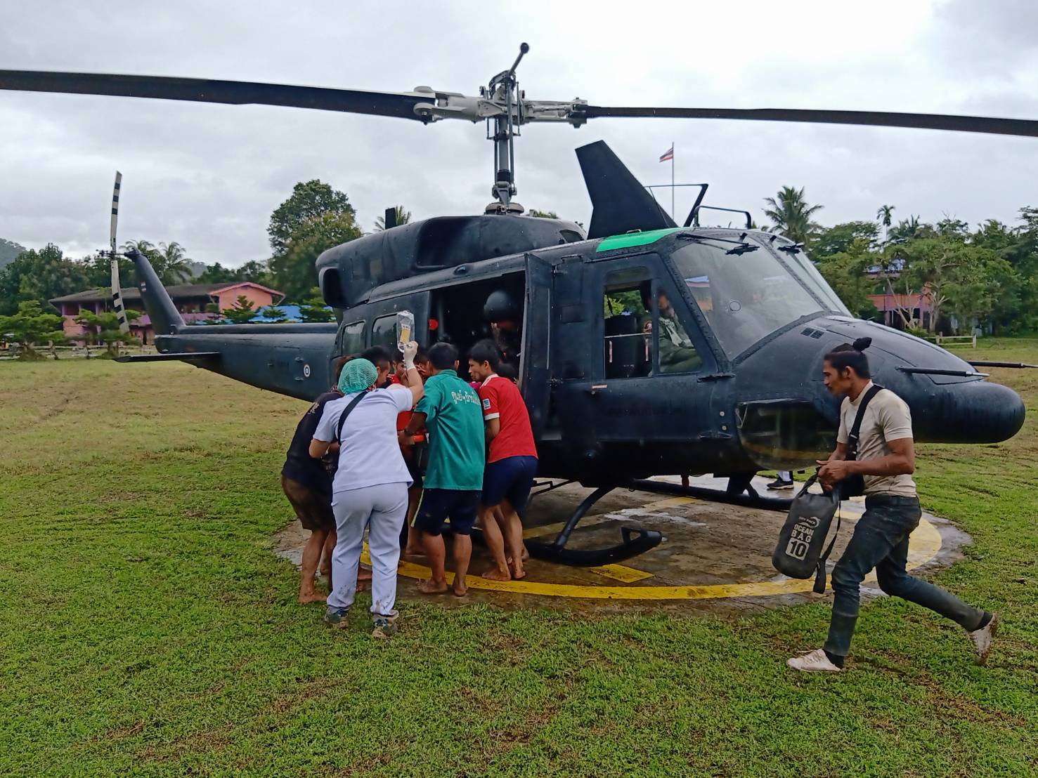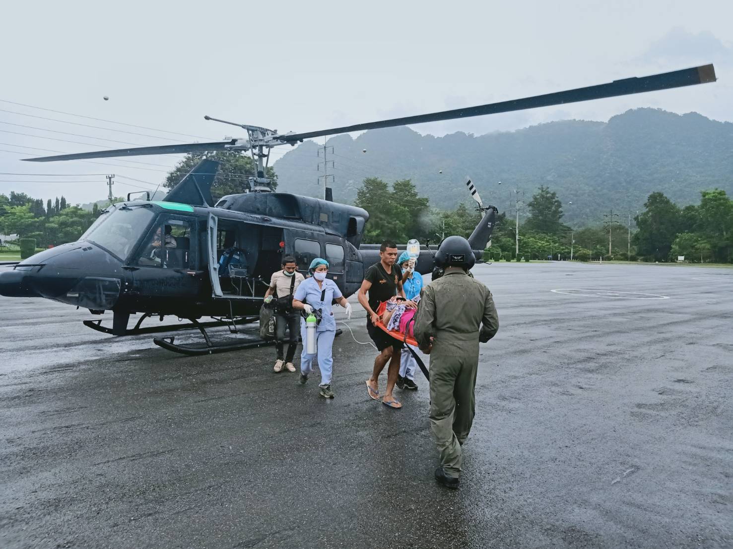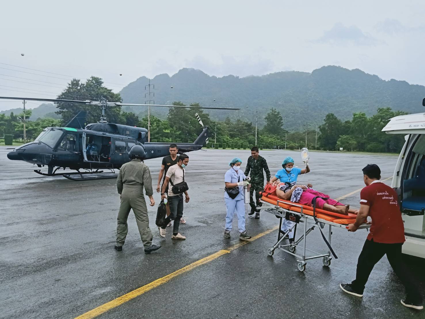 กาญจนบุรี ผบ.พล.ร.9 ค่ายสุรสีห์ ส่ง ฮ. รับตัว ผู้ป่วยฉุกเฉิน ขับรถอีแต๊กคว่ำ มีแผลฉีกขาดที่ศีรษะและหน้าผาก จากชายแดนไทย-เมียนมา อ.สังขละบุรี ส่ง รพ.ทองผาภูมิ ได้ทันเวลา ล่าสุด อาการปลอดภัยแล้ว