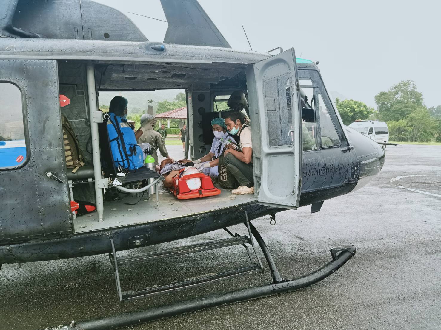โดยชุดปฏิบัติการการบินกองทัพบก กองกำลังสุรสีห์ พร้อมด้วยทีมแพทย์ฉุกเฉิน นำโดย หัวหน้าเจ้าหน้าที่หน่วยแพทย์เคลื่อนที่-กู้ชีพฉุกเฉิน เดินทางไปในพื้นที่ดังกล่าว โดยใช้เวลาบินไป-กลับประมาณ 2 ชั่วโมง เพื่อนำตัวผู้ป่วยส่งโรงพยาบาลทองผาภูมิ ซึ่งมีอุปกรณ์ทางการแพทย์ที่พร้อมกว่า ล่าสุด นาย ถาวร กมลพิมานกุล อยู่ในความดูแลของคณะแพทย์ โรงพยาบาลทองผาภูมิ และอาการปลอดภัยแล้ว.