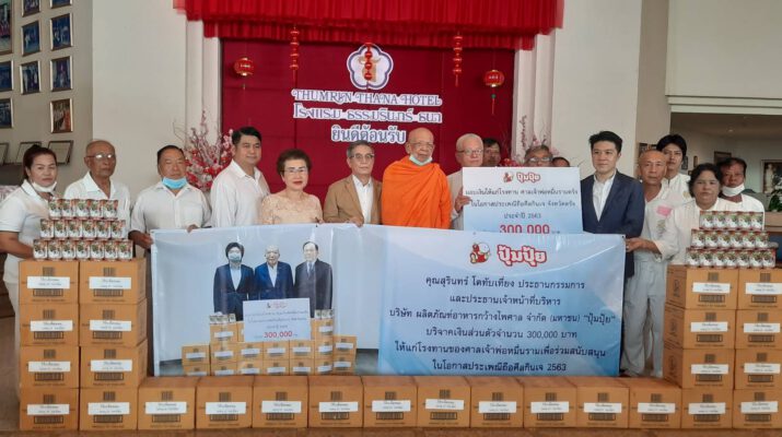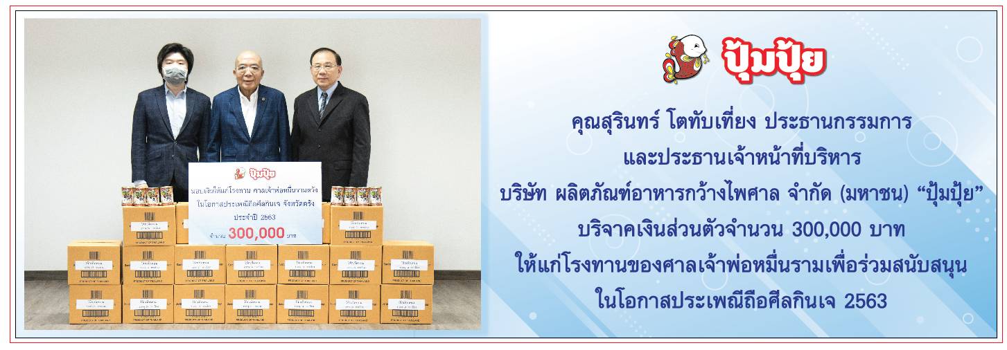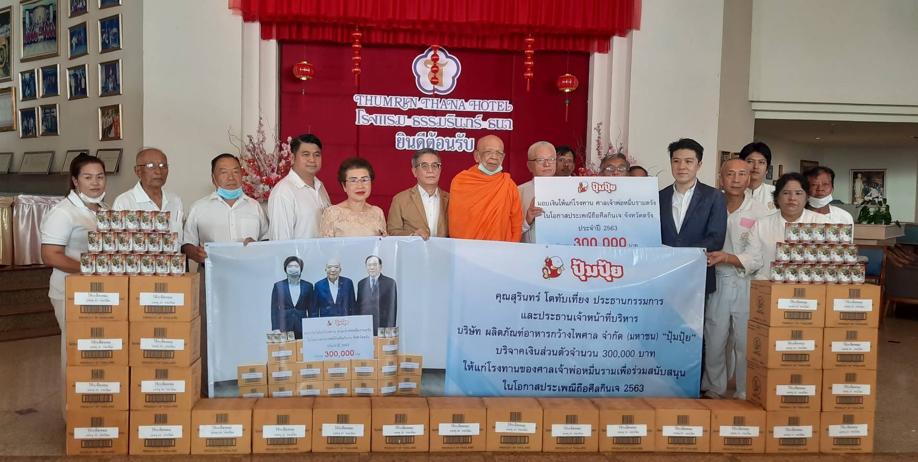 สำหรับการมอบเงินจำนวน 350,000 บาท ให้แก่โรงทานศาลเจ้าพ่อหมื่นราม เพื่อสนับสนุนประเพณีถือศีลกินเจนั้น เพื่อนำไปซื้อพืชผัก วัตถุดิบในการทำอาหารเจ ให้กับประชาชนที่มาร่วมแสวงบุญที่ศาลเจ้า โดยเปิดโรงทานให้กับประชาชนรับประทานอาหารเจฟรี แต่ต้องทานที่ศาลเจ้าเท่านั้น นอกจากนี้ยังทำอาหารให้กับประชาชนที่ร่วมทำบุญโดยการผูกปิ่นโตกับทางศาลเจ้า รวม 10 วันหรือ 30 มื้อ การบริจาคเงินช่วยเหลือของครอบครัวโตทับเที่ยง เป็นการประหยัดค่าใช้จ่ายให้กับศาลเจ้าได้อีกทางหนึ่งด้วย