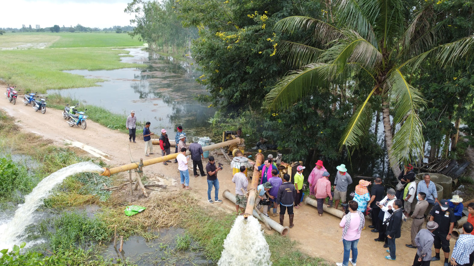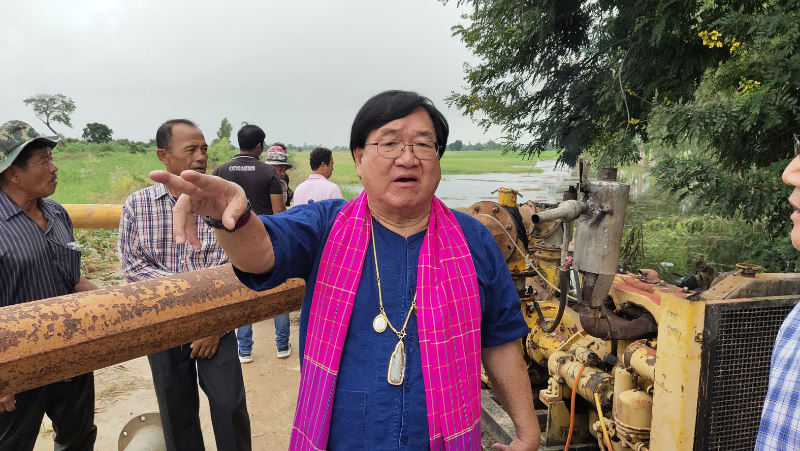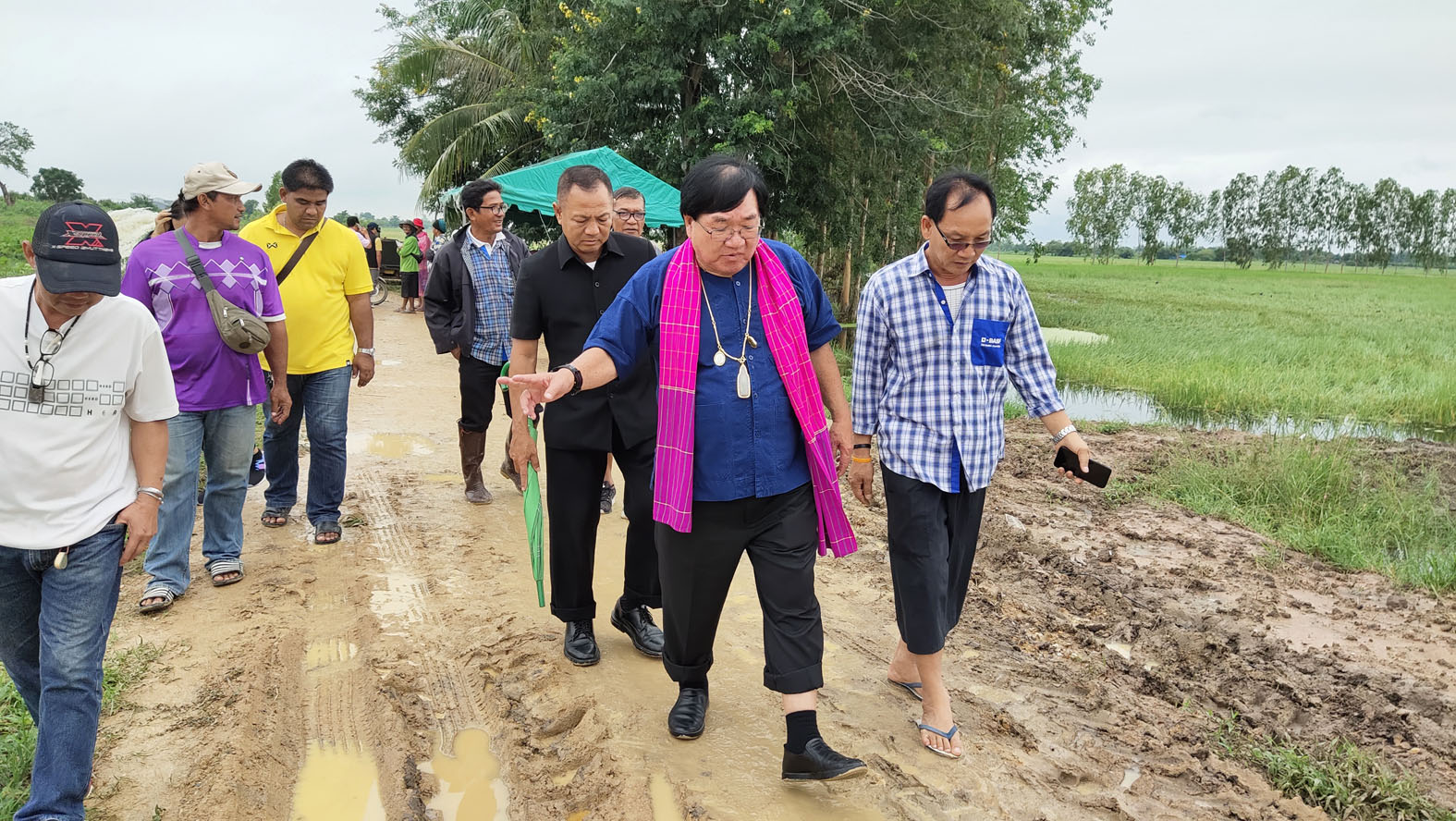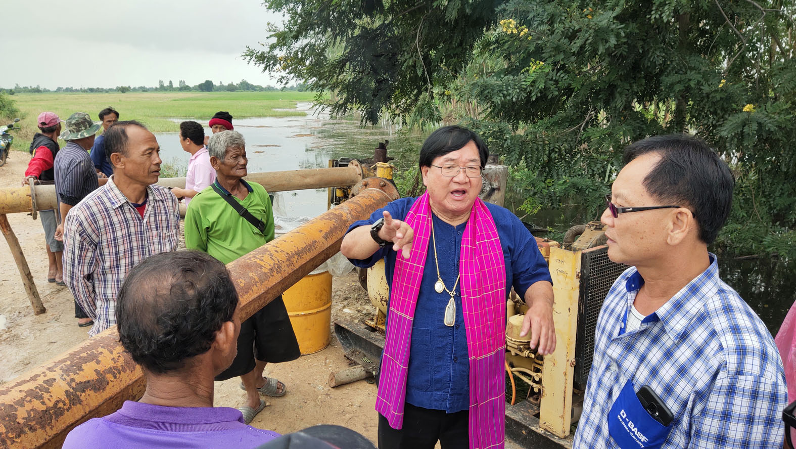 นายประภัตร โพธสุธน รัฐมนตรีช่วยว่าการกระทรวงเกษตรและสหกรณ์ เปิดเผยว่าวันนี้ตนมาดูสภาพน้ำท่วมพื้นที่สองตำบลคือตำบลบ้านสระ และตำบลหนองผักนาก เนื้อที่ไม่น้อยกว่า 6,000 ไร่ ขณะนี้ข้าวกำลังออกรวงบางแปลงก็เกี่ยวได้แล้วแต่มีฝนตกลงมาอย่างต่อเนื่องติดต่อกันหลายวันทำให้น้ำท่วมหมดในพื้นที่ 6,000 ไร่จึงเรียกชลประทานมาแก้ไขด่วนโดยส่งรถแบ็คโฮ มา 4 คันเครื่องสูบน้ำอีก 10 เครื่องถ้าเดินเครื่องพร้อมกันทั้ง 10 เครื่องคาดว่า 3 วันน้ำคงจะลดและช่วยน้ำท่วมครั้งนี้ได้ไม่น้อยกว่า 75 เปอร์เซ็นต์ถ้าไม่มีฝนตกลงมาเพิ่มอีกจะทำให้พี่น้องเกษตรกรรอดจากน้ำท่วมได้ น่าเห็นใจพี่น้องชาวนาเป็นอย่างยิ่งปีหนึ่งทำนาได้ครั้งเดียวต้นฤดูเราเรียกร้องว่าน้ำแล้งกว่าจะได้น้ำมาทำนาแต่เวลาออกรวงแล้ววันนี้น้ำท่วมเป็นเรื่องที่ซ้ำซากเราก็พยายามแก้ให้ชลประทานมาขุดลอกไว้ล่วงหน้าปีหน้าอย่าให้เกิดอย่างนี้อีกคิดว่าทุกอย่างคงจะดีขึ้น
