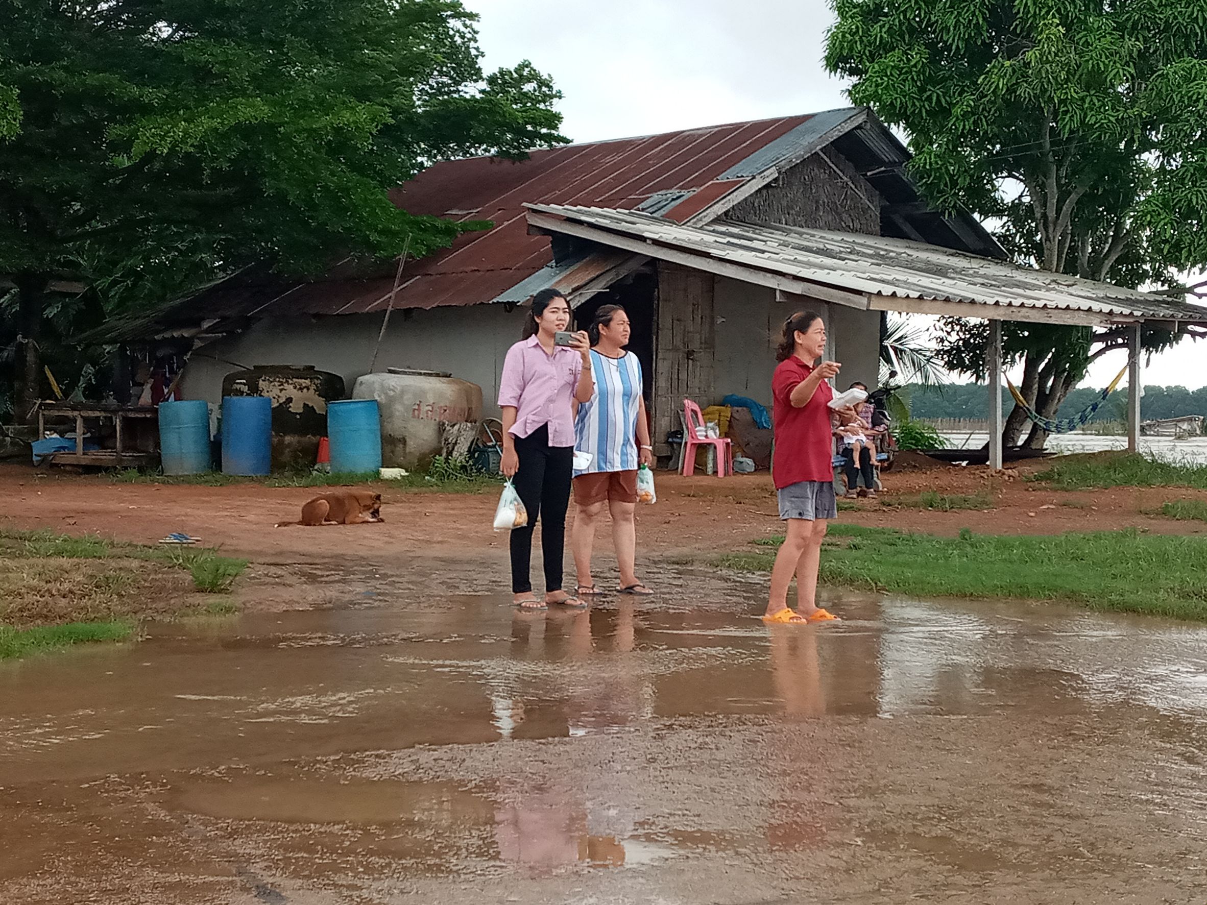 ต่อมาน.ส.เพ็ญศรี กลั่นบุศย์ นายอำเภอด่านมะขามเตี้ย พร้อมด้วย นายสมเกียรติ วอนเพียร ส.ส.กาญจนบุรี ผู้ใหญ่บ้าน และสื่อมวลชน ได้ลงเรือ โดยใช้เรือ จำนวน เรือ 2 ลำ ในการนำอาหารและน้ำดื่มไปมอบให้กับประชาชนที่ไม่สามารถออกมาได้ เนื่องจากถนนถูกน้ำท่วมทั้งหมด พื้นที่หมู่ 1 ต.หนองไผ่ อ.ด่านมะขามเตี้ย จ.กาญจนบุรี ขณะที่เรือกำลังแล่นในลำน้ำ พบว่าระดับน้ำสูงเกือบถึงยอดต้นอ้อย ตลอดเส้นทางและบ้านเรือนของประชาชน ถูกน้ำท่วมได้รับความเสียหาย บางบ้านห้องน้ำ ถูกน้ำท่วมเกือบถึงหลังคา ใช้เวลาเดินทางประมาณ 10 นาที ก็ถึงจุดหมาย จุดแรกเป็นบ้านชั้นเดียว พบชาวบ้านหลายชีวิตทั้งผู้ใหญ่และเด็ก ออกมายืนรอรับอาหารและน้ำดื่มจากคณะ เนื่องจากบริเวณรอบบ้านเต็มไปด้วยน้ำ ลักษณะเหมือนบ้านอยู่บนเกาะไม่มีถนนเนื่องจากถูกน้ำท่วมทั้งหมด จึงไม่สามารถออกไปไหนได้ และเมื่อไปอีกบ้านพบเป็นบ้านไม้ 2 ชั้น ชั้นล่างถูกน้ำท่วมหมด ชั้นบนพบผู้สูงอายุ รอรับอาหารและน้ำดื่มจากคณะที่ไปเยี่ยมในวันนี้ ด้วยความดีใจ อยู่บ้านเป็นบ้านไม้ 2 ชั้น ชั้นล่างถูกน้ำท่วมทั้งหมด ต้องอาศัยอยู่ชั้น 2 และน้ำดื่มจากคณะเช่นเดียวกัน จากการสอบถามชาวบ้านพบว่า ระดับน้ำวันนี้เริ่มลดลงจากเมื่อวาน เนื่องจากวันนี้ฝนตกลงมาเพียงเล็กน้อย หากคืนนี้ฝนไม่ตก คาดว่าน้ำก็จะค่อยๆลดลงไป แต่ถ้าคืนนี้ฝนตกเยอะอีก ก็น่าจะท่วมมากกว่าเดิม