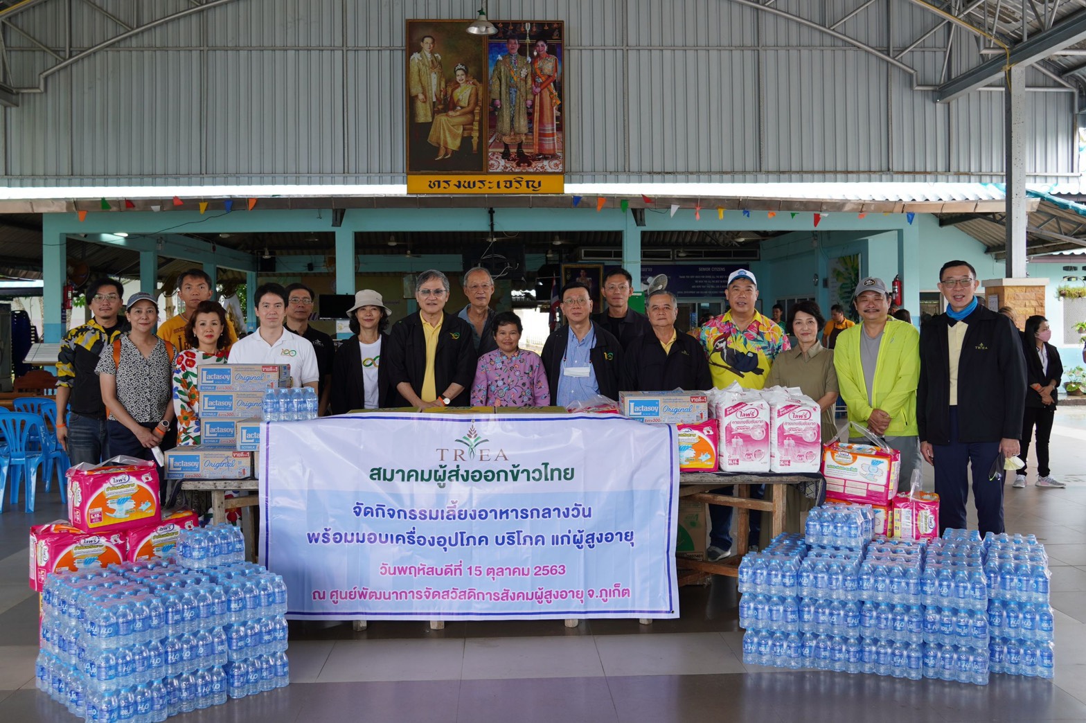 ซึ่งเดินทางไปจัดกิจกรรมเพื่อสังคม CSR โดยจัดเลี้ยงอาหารกลางวันพร้อมมอบเงิน เครื่องอุปโภคบริโภคและน้ำดื่มให้กับผู้สูงอายุ โอกาสนี้ ร.ต.ท.เจริญ เหล่าธรรมทัศน์ กล่าวว่าคณะกรรมการสมาคมผู้ส่งออกข้าวไทยได้ให้ความสำคัญต่อผู้สูงอายุ โดยปีนี้ได้จัดกิจกรรมเพื่อสังคมให้กับผู้สูงอายุที่ จ.ภูเก็ตด้วยการเลี้ยงอาหารกลางวัน และมอบเงินช่วยเหลือผู้สูงอายุ พร้อมมอบเครื่องอุปโภคบริโภค นำดื่มเพื่อเป็นขวัญกำลังใจให้กับผู้สูงอายุได้มีกินมีใช้ต่อไป ทางด้านนางสาวจิราภรณ์ เซ่งฟัด ได้กล่าวขอบคุณคณะกรรมการสมาคมผู้ส่งออกข้าวไทยที่เห็นความสำคัญของวิถีชีวิตผู้สูงอายุ ซึ่งกิจกรรมเพื่อสังคมนี้ถือได้ว่ามีส่วนช่วยเหลือสังคมและเป็นประโยชน์ต่อผู้สูงอายุซึ่งพำนักอยู่ในศูนย์พัฒนาการจัดสวัสดิการสังคมผู้สูงอายุภูเก็ตได้อีกทางหนึ่งด้วย .